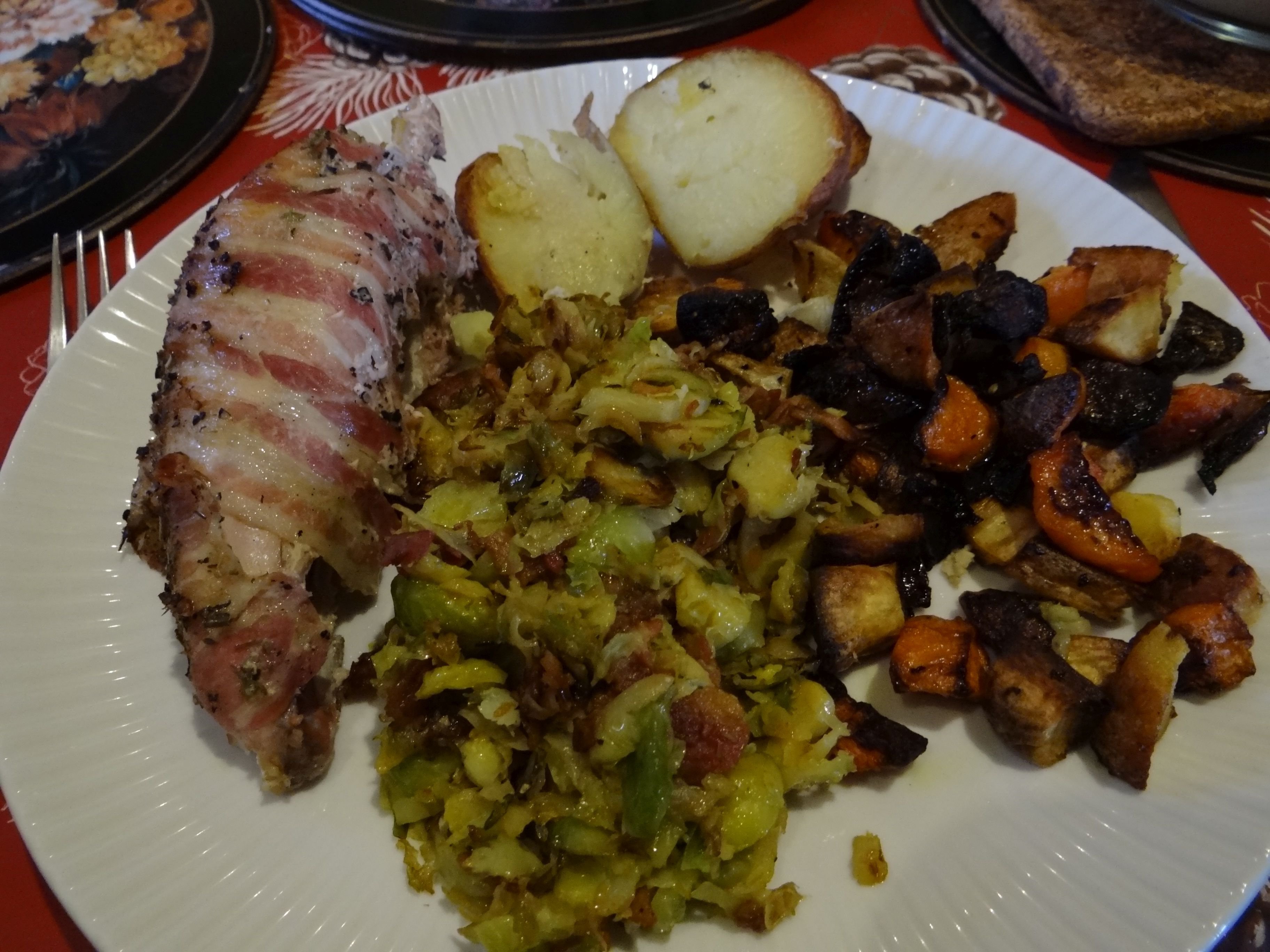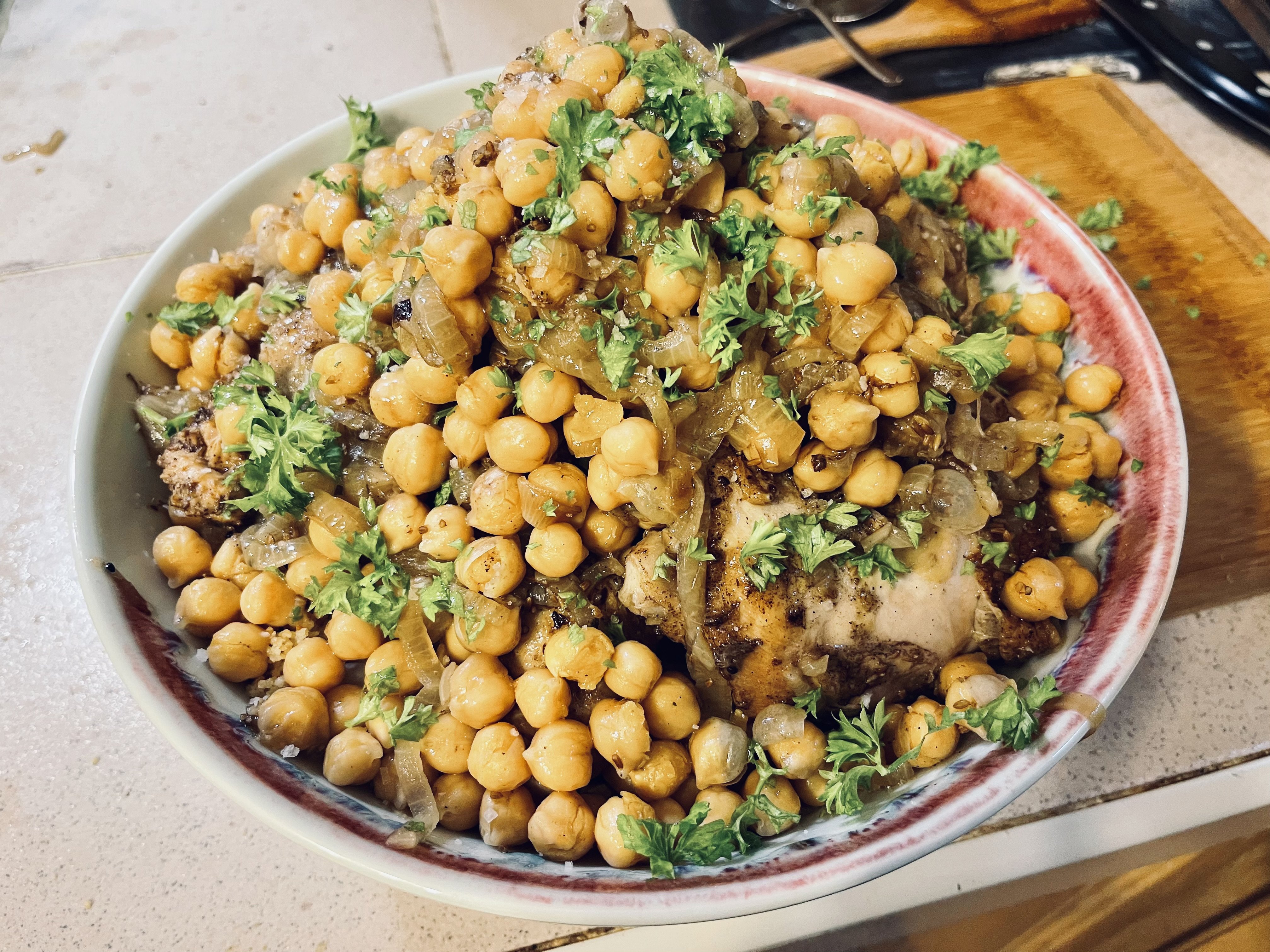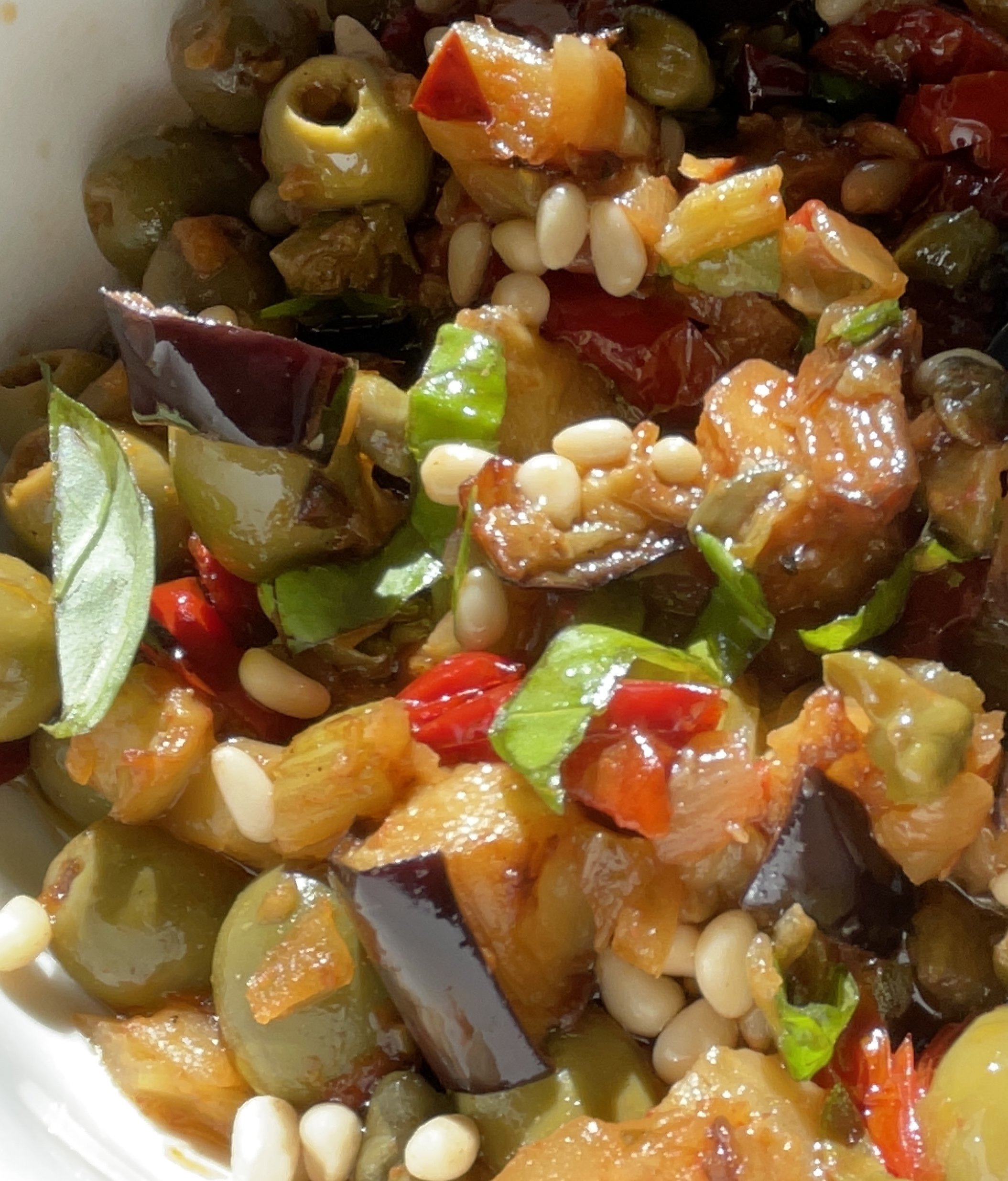 Last night caponata - a Sicilian dish with aubergine, peppers, olives and other vegs plus pine nuts
