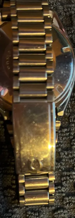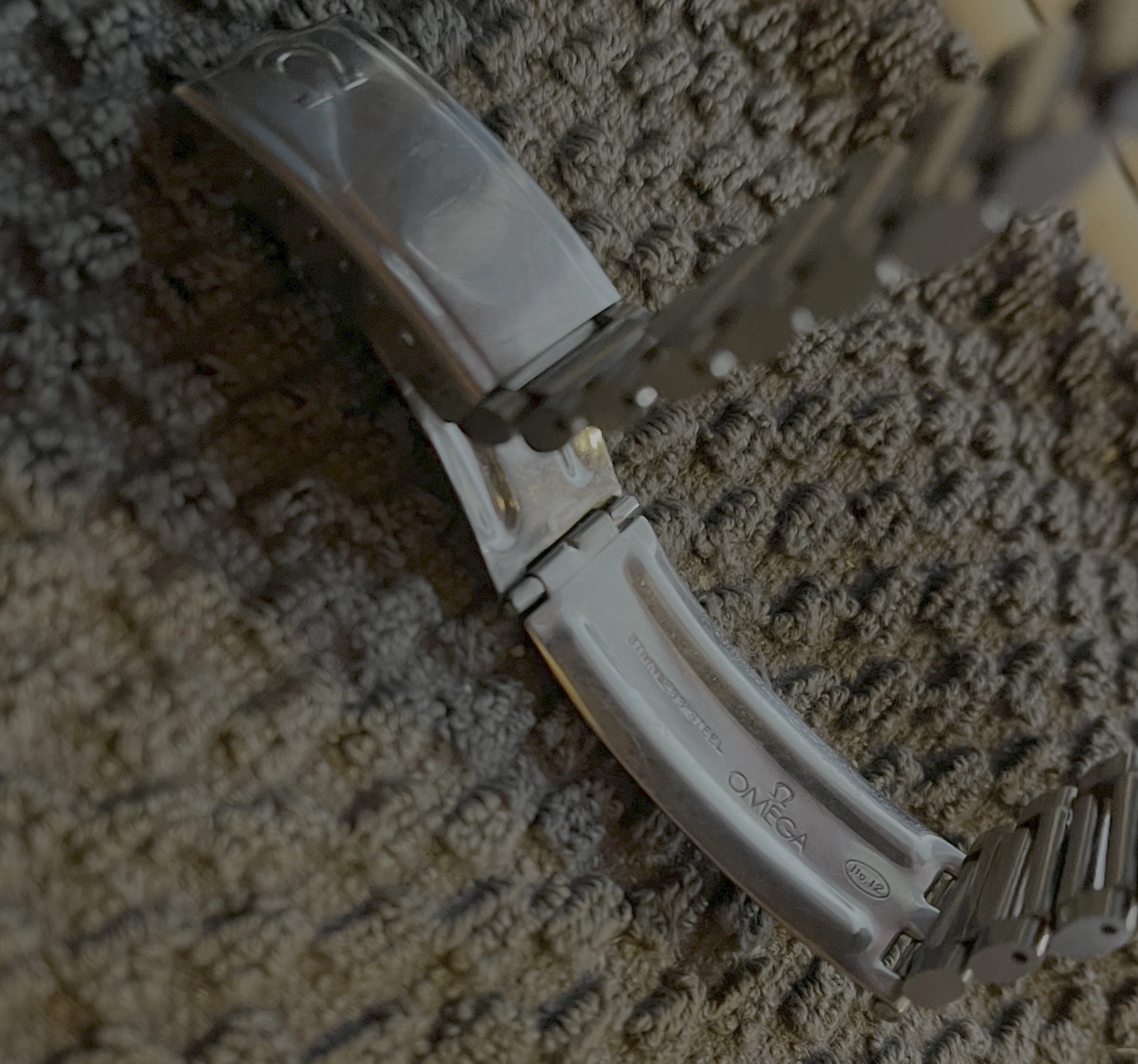 Below is a (horrible) photo of the outside of the clasp with the stamped Omega logo (iPhone refuses to focus on the bracelet, but loves the towel).