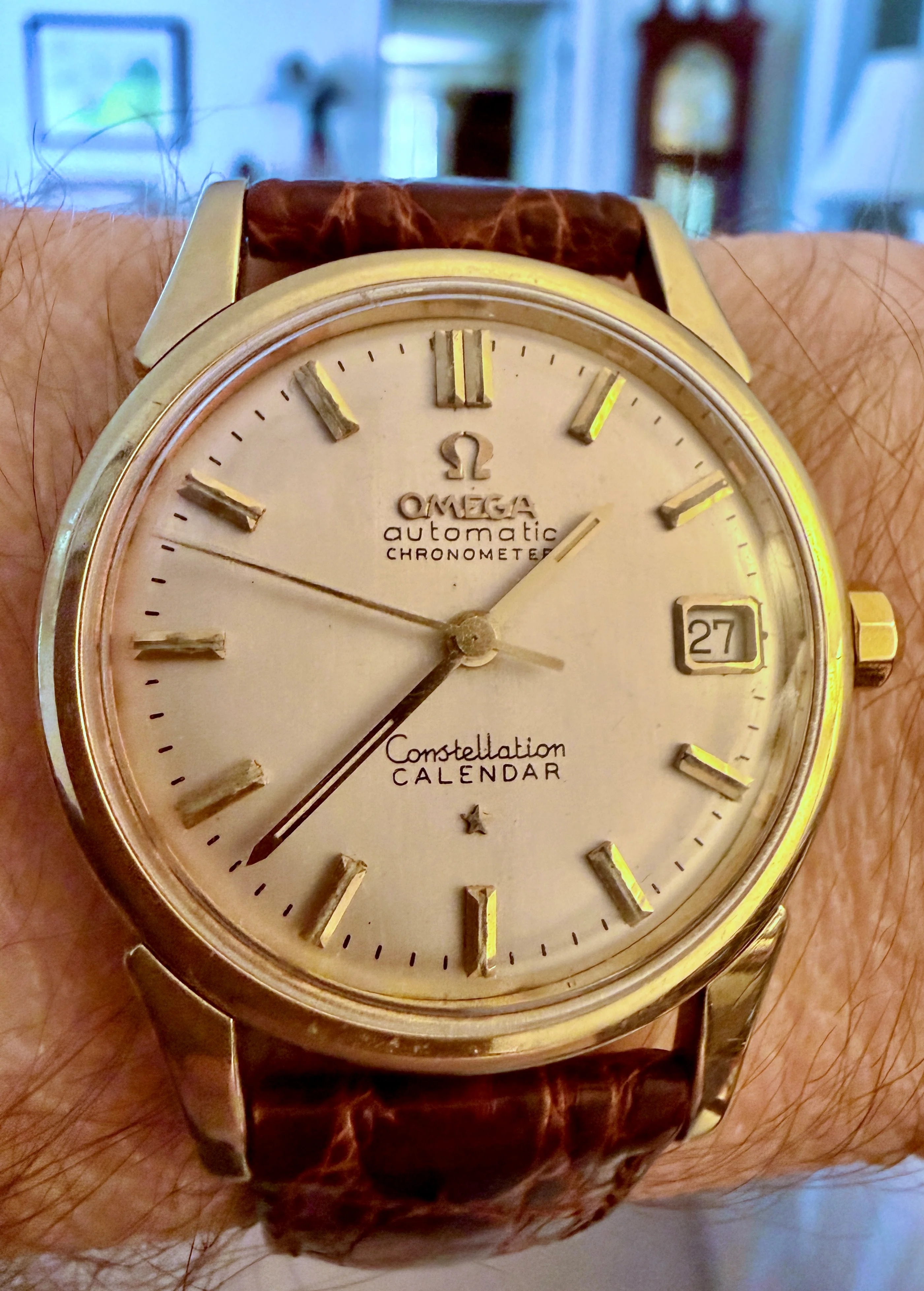 The knurled one in stainless steel is probably a service replacement. Note that it is thicker than the golden one. The knurled variant is far, far better than the decagonal one - it might not be as iconic as the other, but the decagonal Constellation crowns and the Seamaster cloverleaf crown are absolutely hateful to use. Nice to look at though 馃榾