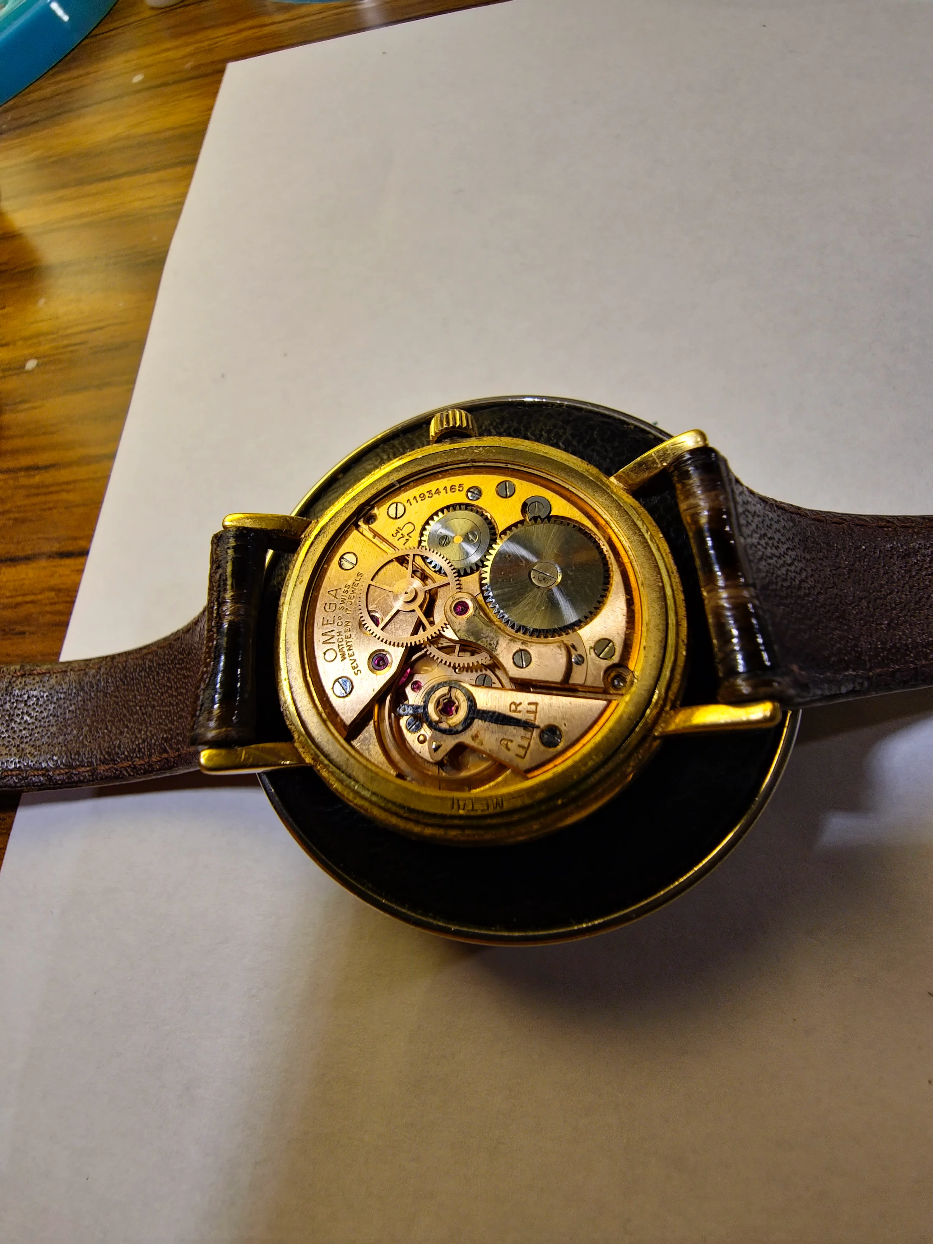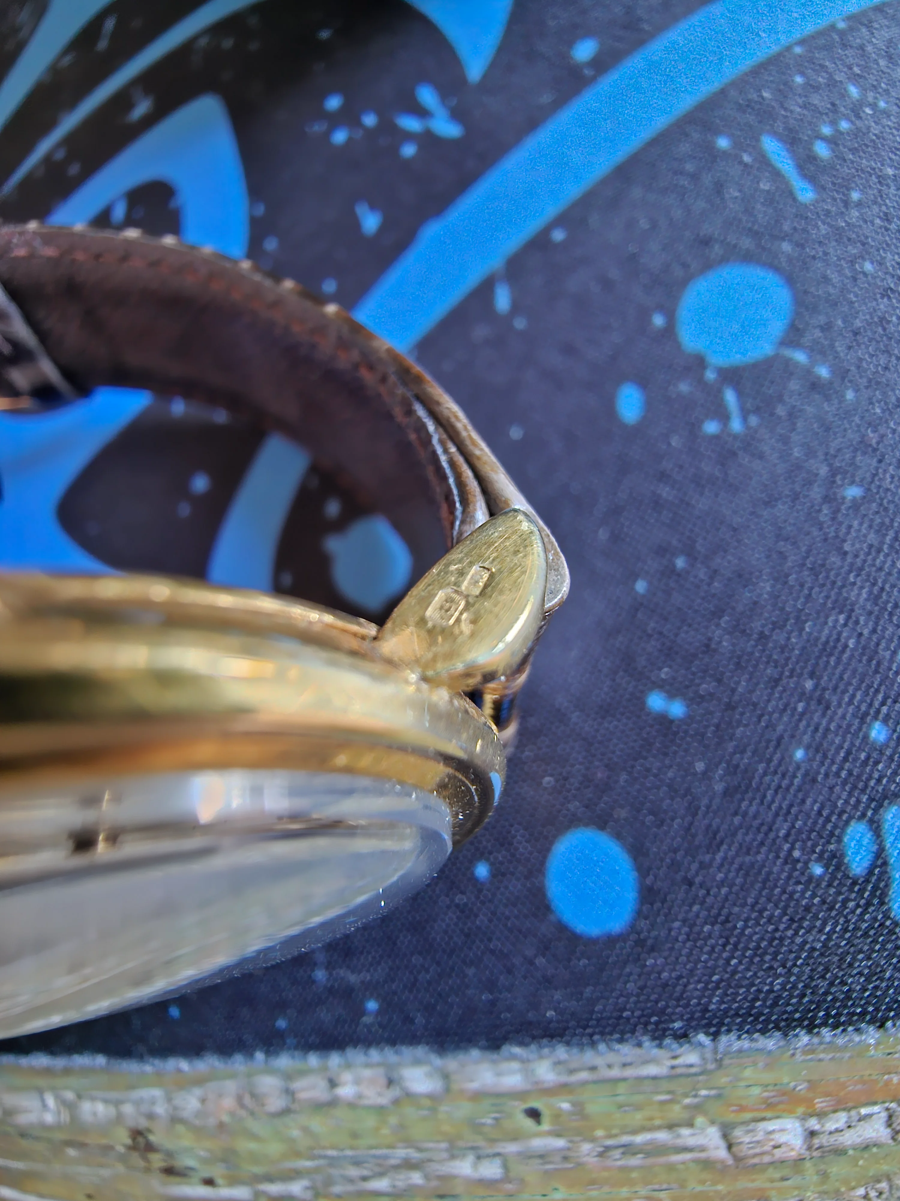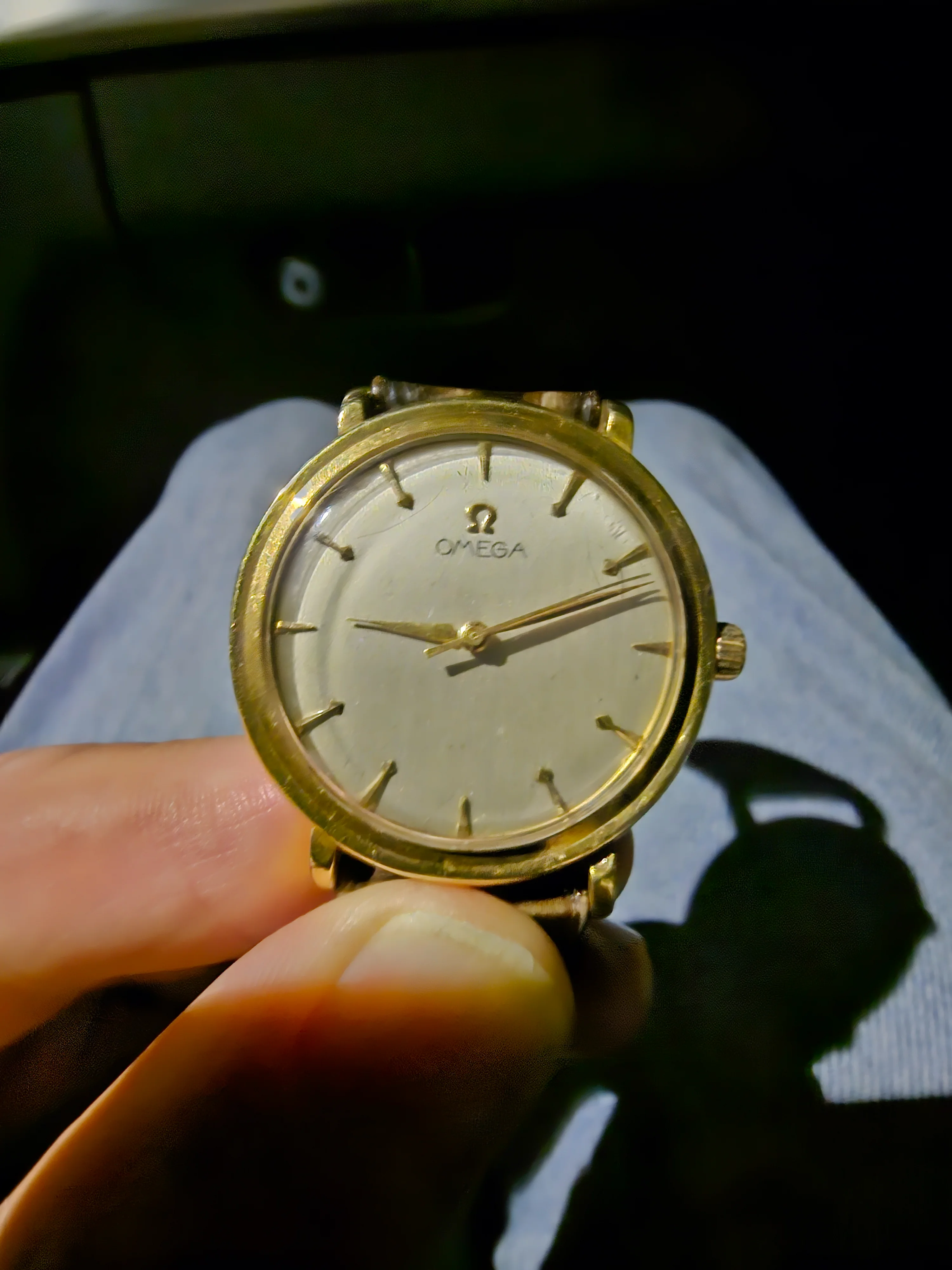 Got this one from my uncle, he got it from his father. So from my grandfather. I already know the dial is not original or at least has been restored, but the rest of the watch seems to be original. Apart from the stap. Hasn't been serviced in over 40 years! Also the dial "restoration" was done before that. At the moment it's being serviced, but I was able to get some pictures from the inside. According to internet, this should be a watch from around 1949. Looks to be gold, at least the cover on the inside has markings and so does 1 of the lugs. I'm curious if some of you know more about this watch! How rare is it? What do you think about the state it's in?