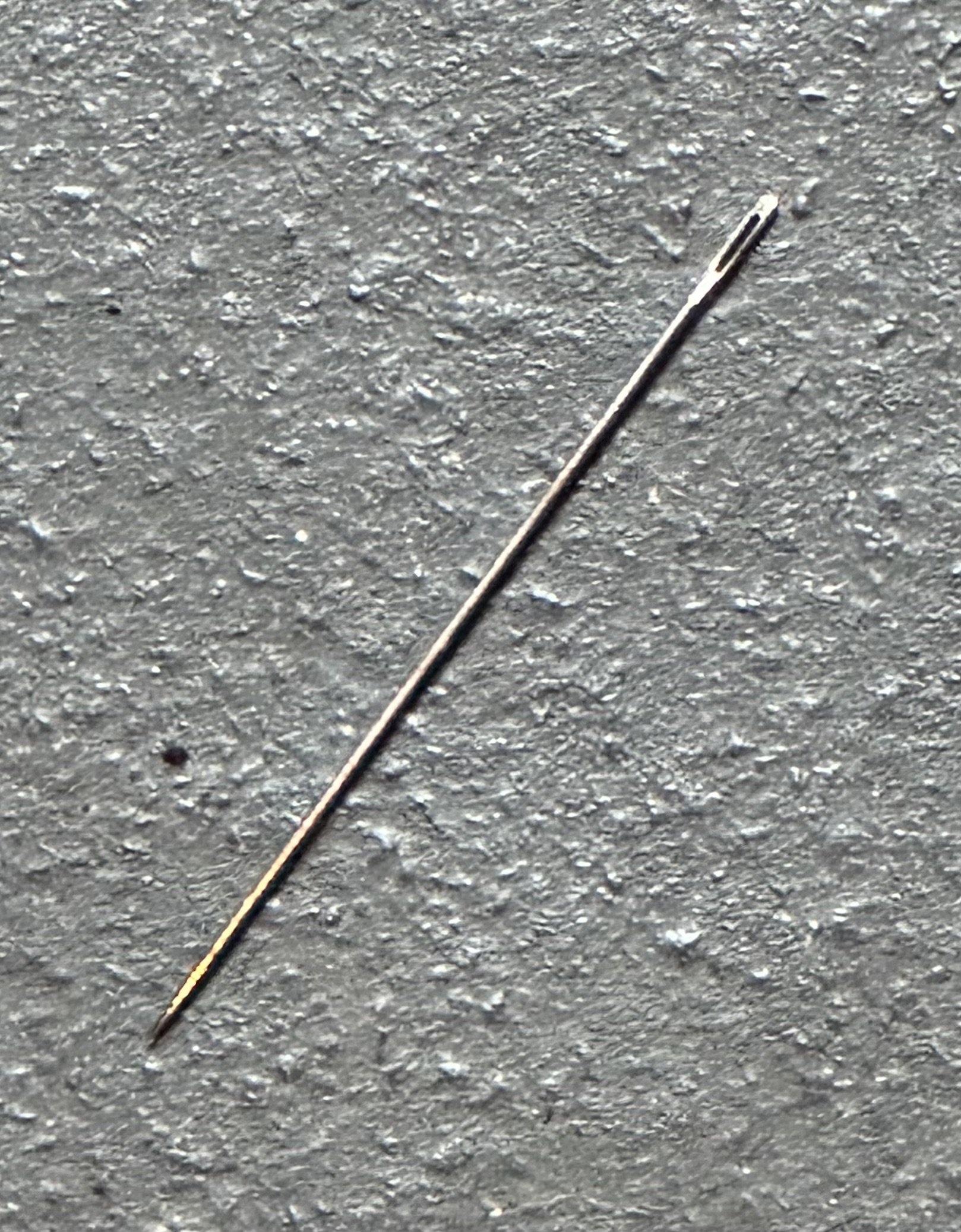 Things are going well, and suddenly I notice that one of my needles is no longer attached to the thread. I can’t find the damn thing. I looked under stuff, because that’s where whatever we drop always ends up. No luck.