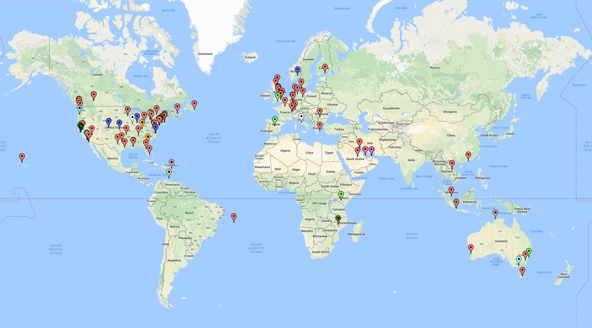 As of an hour or so ago, 126 pins have been dropped in 22 Countries. The map looks like this.