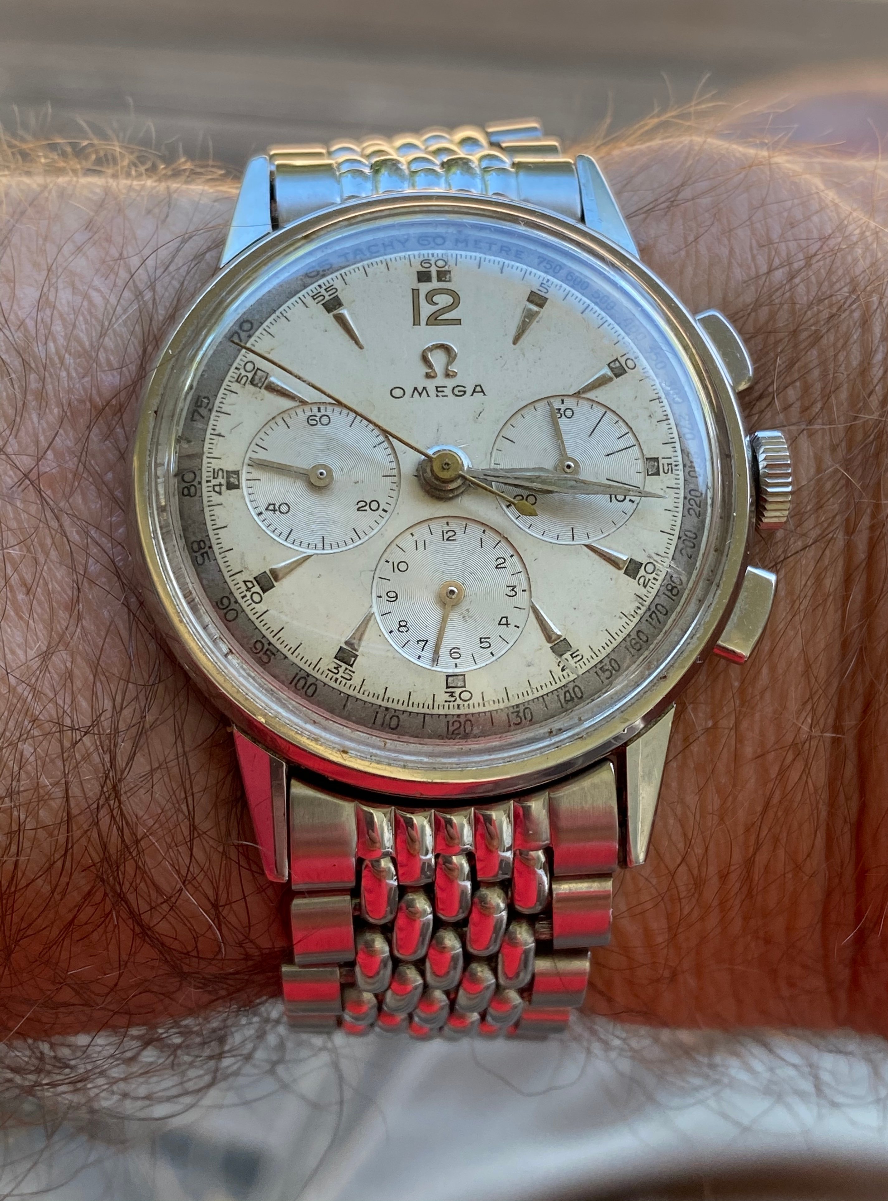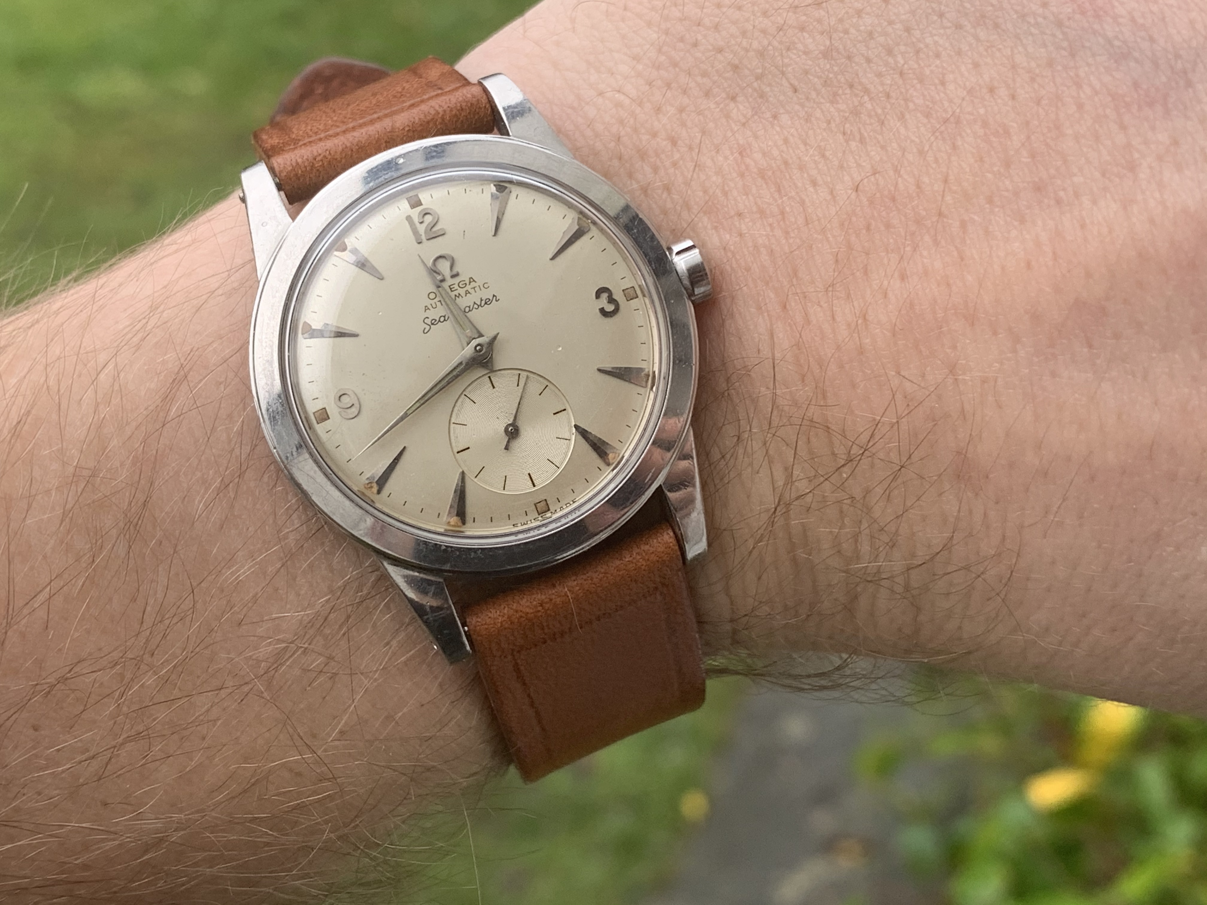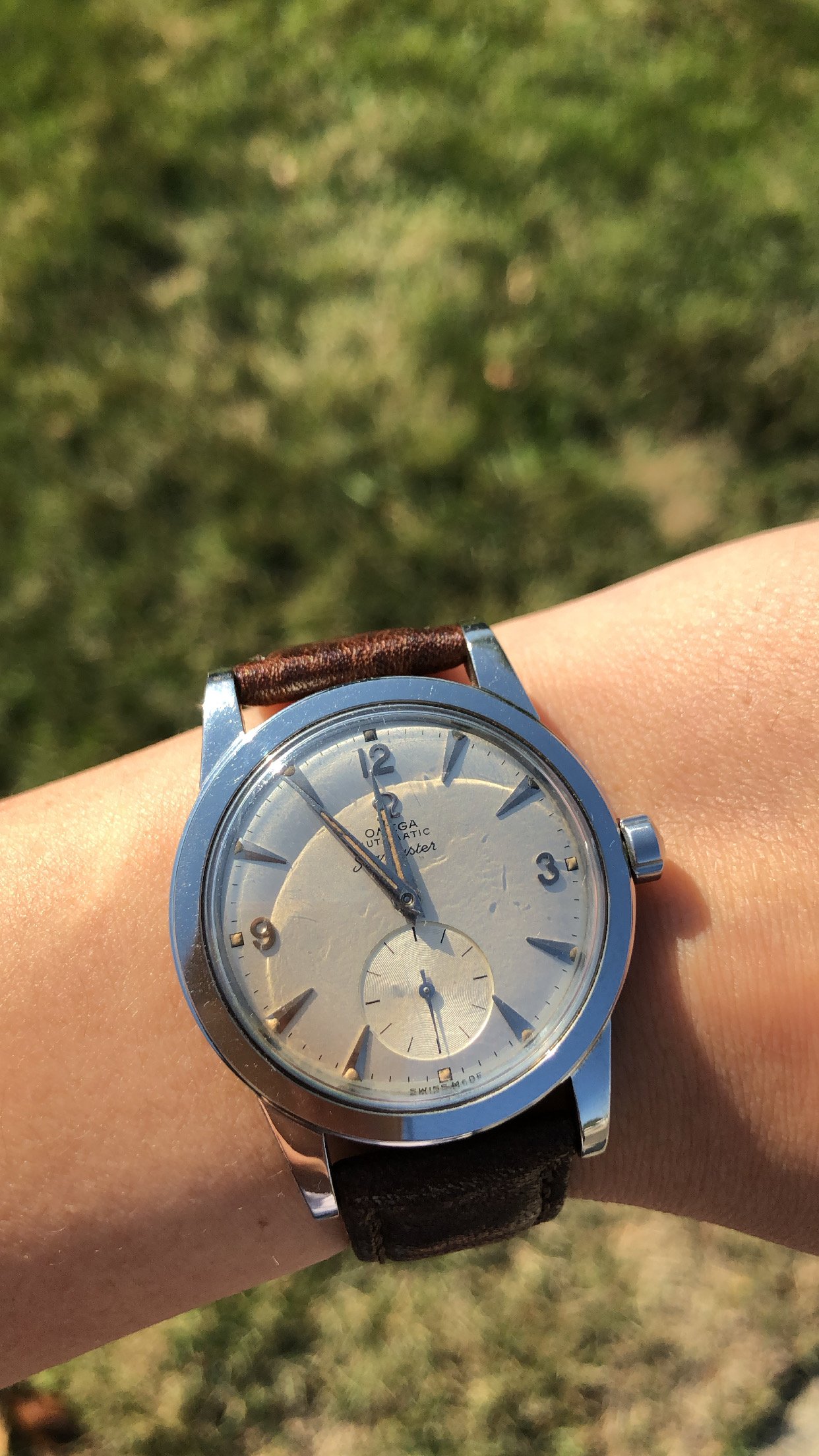 Hard to imagine this used to be a white(ish) dial. Absolutely no idea what happened with it, but somehow it aged in a way that the inner circle appears either darker or lighter than the outside ring, depending on the light. I‘m mesmerized, prize was right, 35mm is a nice size for a 50s bumper - good end to the year.