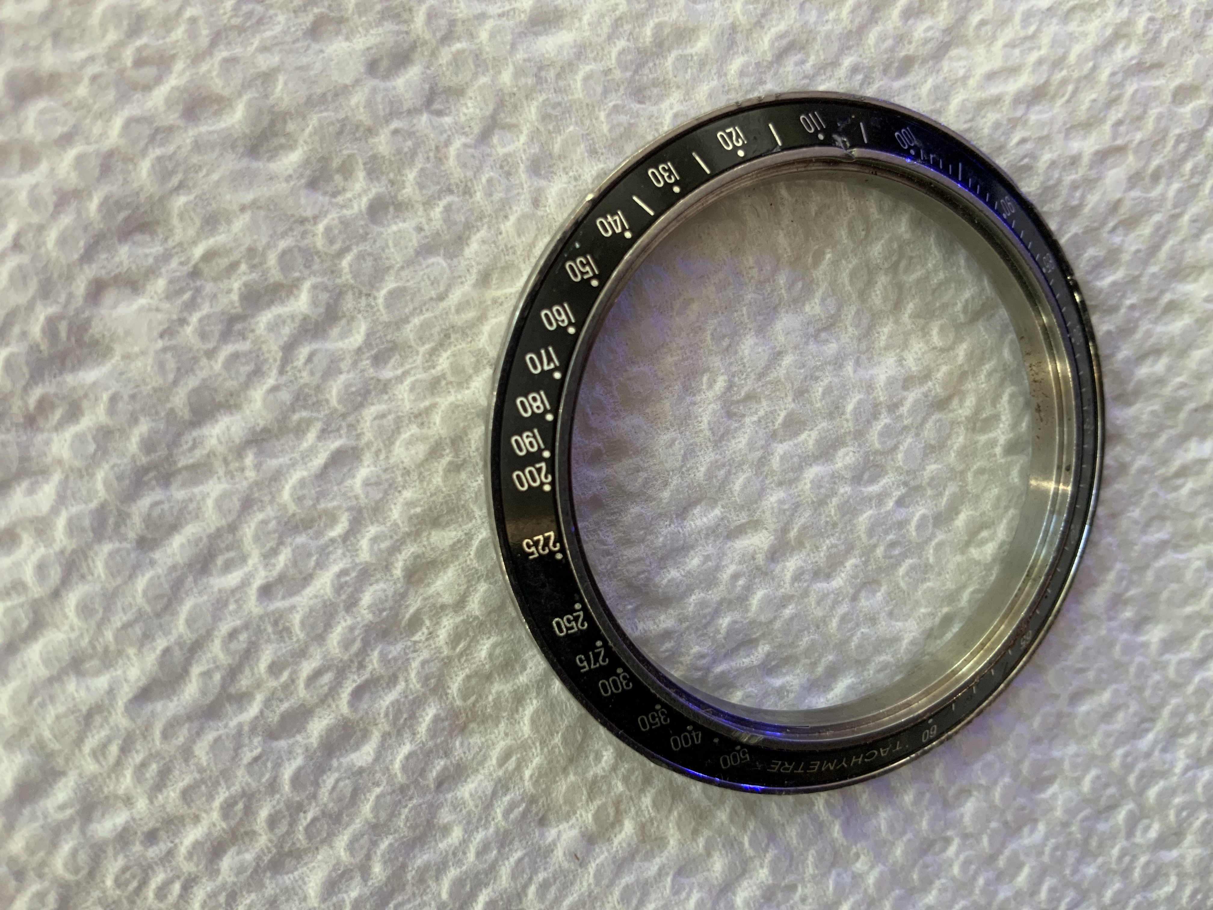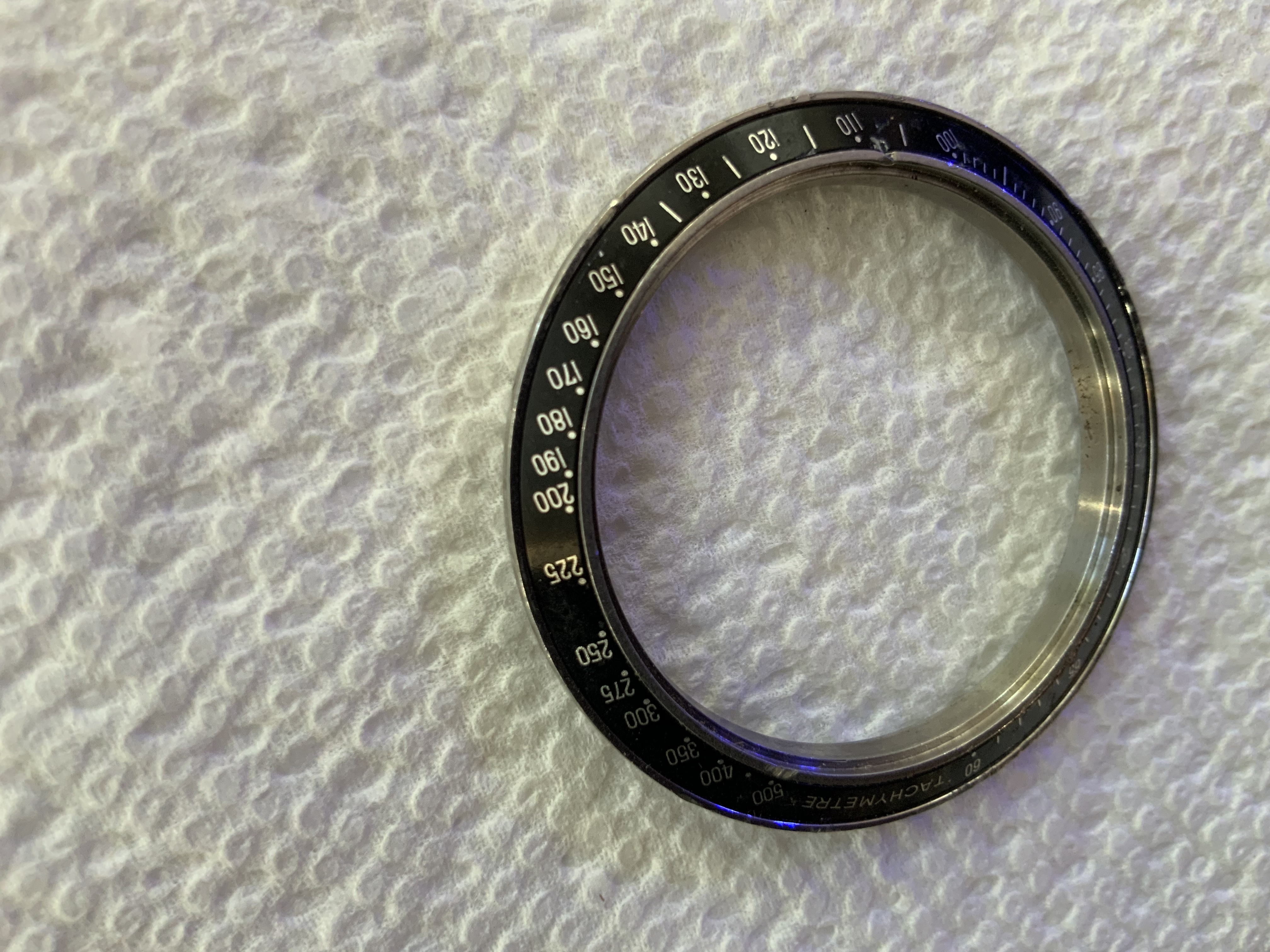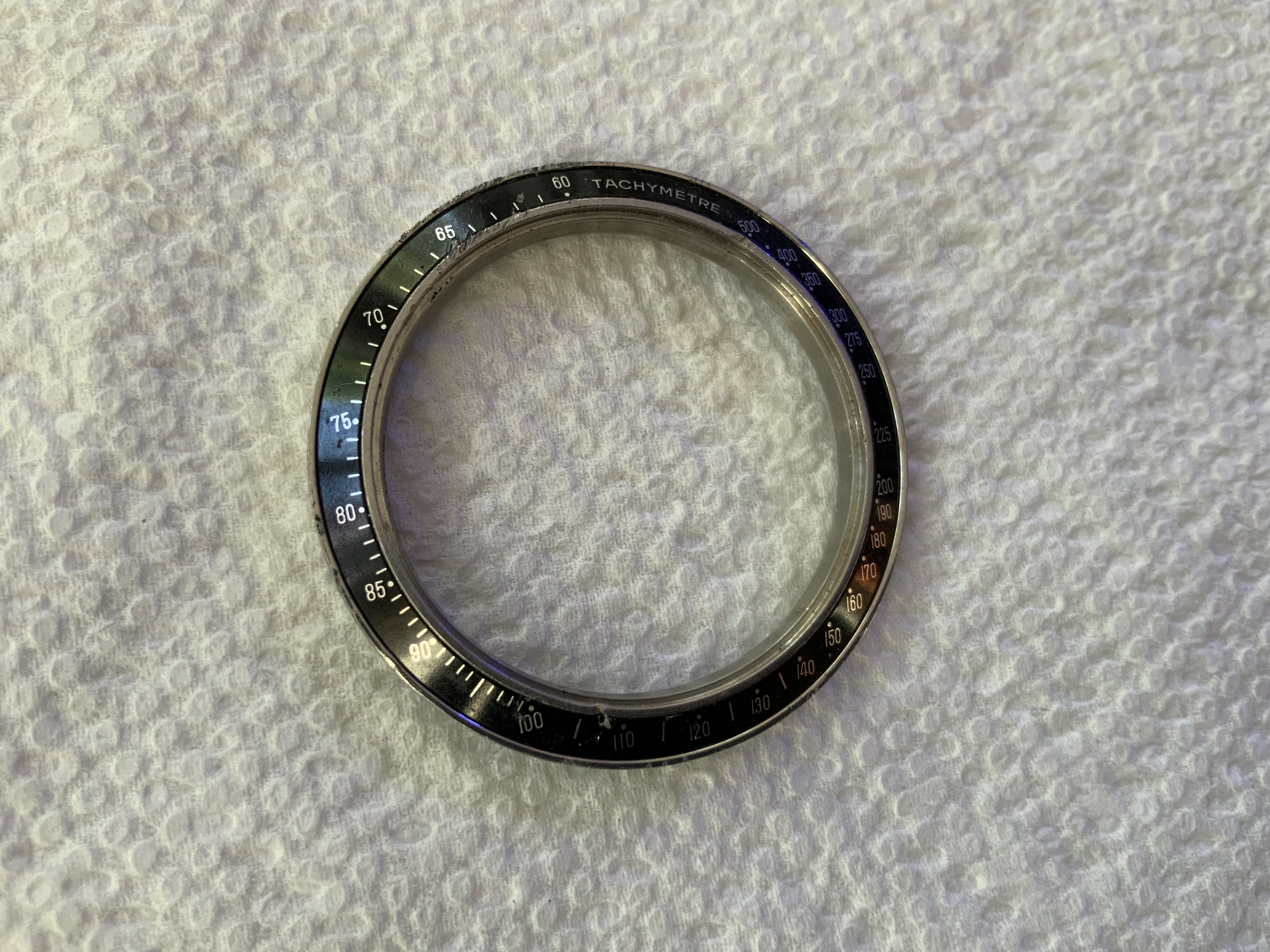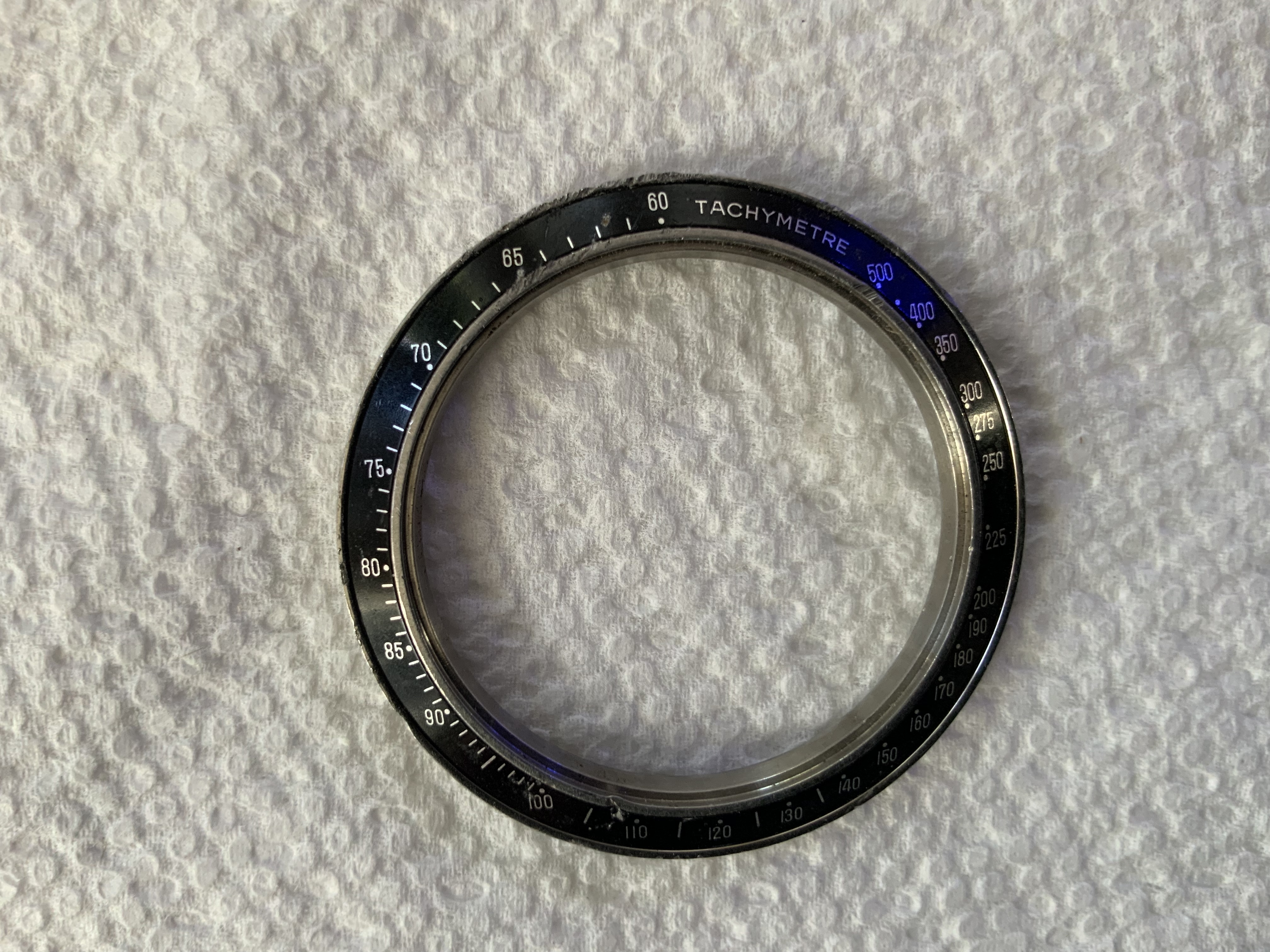 It’s from a Speedmaster date model. However this watch has the sapphire crystal pressed into the bezel with a hard plastic seal, and the damage to the bezel may mean it cannot be used again.