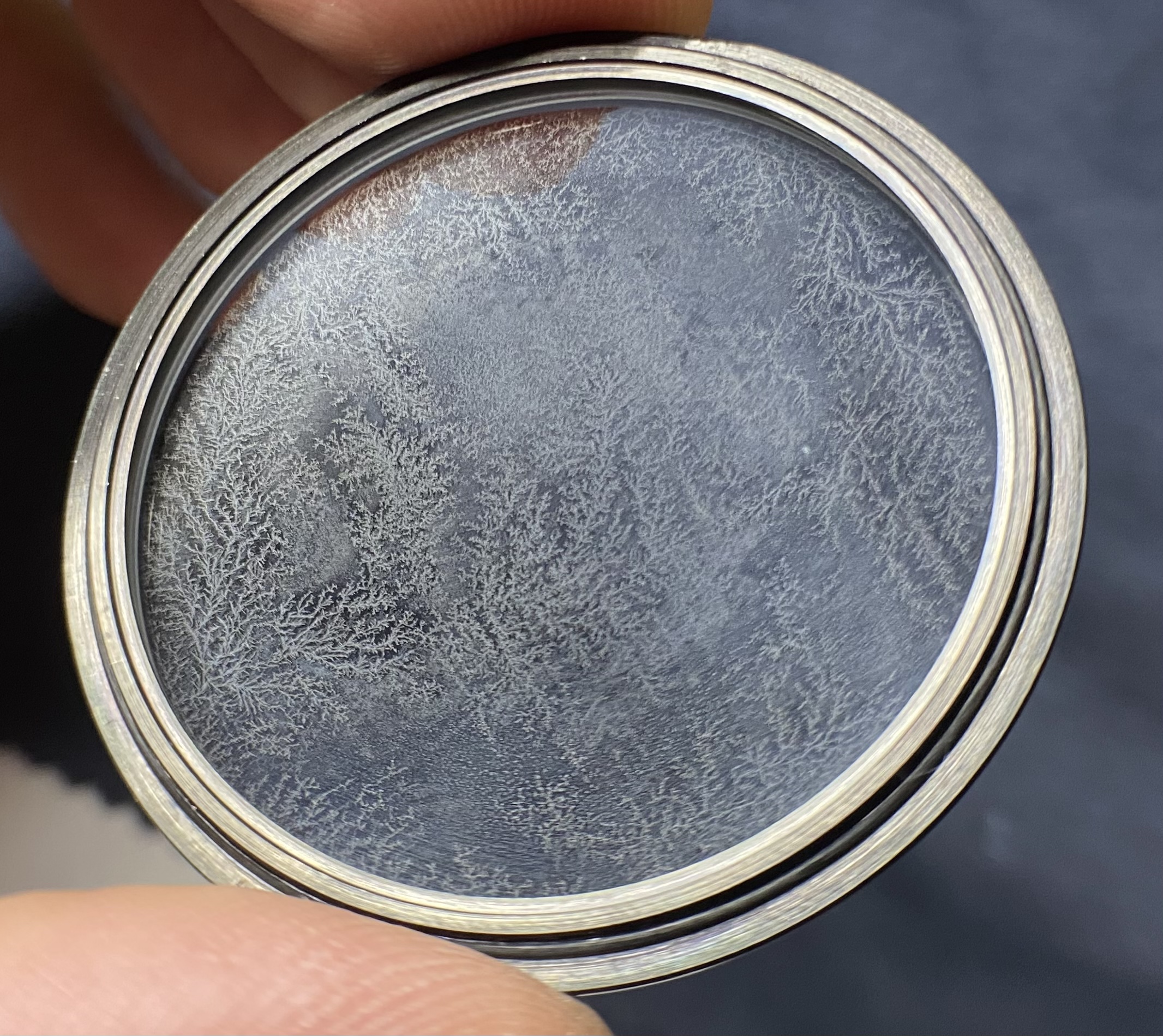 ·I have this watch I purchased a long time ago and barely ever wore. At the time I liked the design but it's way too big at 44mm and all dial. It has sat in my watch box with all the others for years and has never seen water. Take a look what has developed on the inside of the crystal. Very strange. Figured maybe it would be fun to share and speculate. Just cheap/defective plastic? Any ideas?