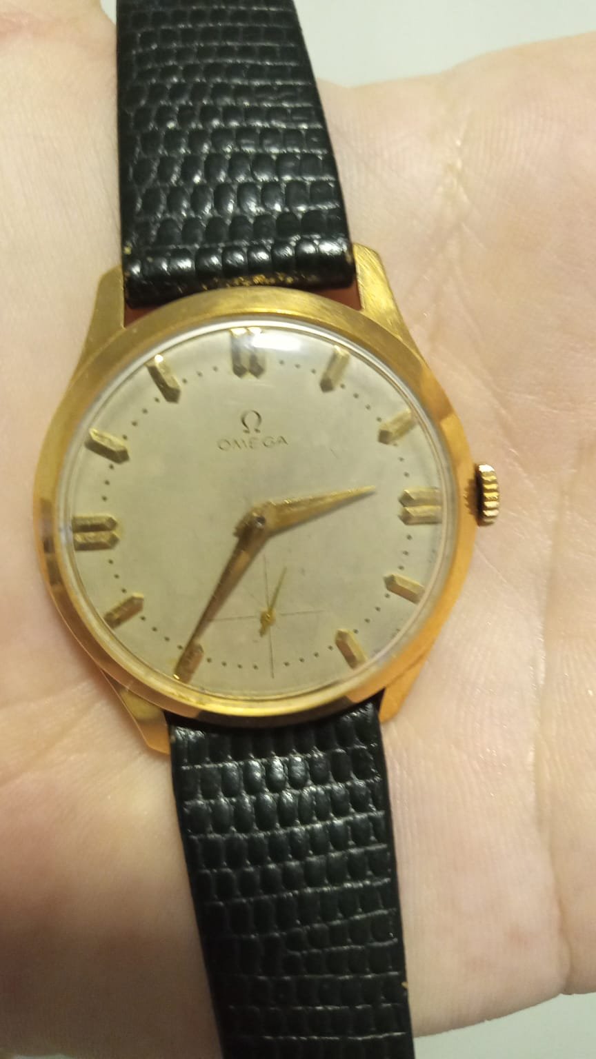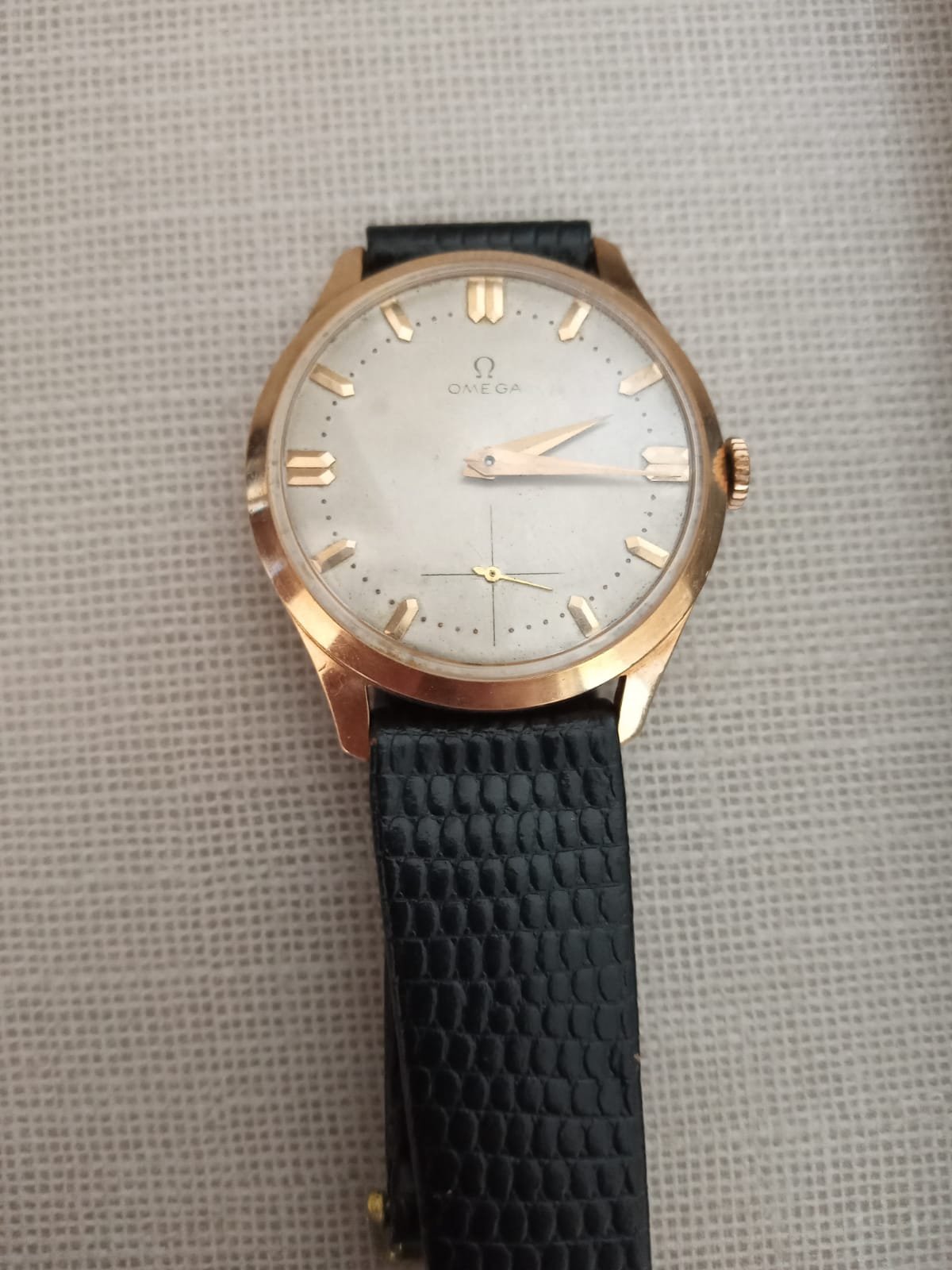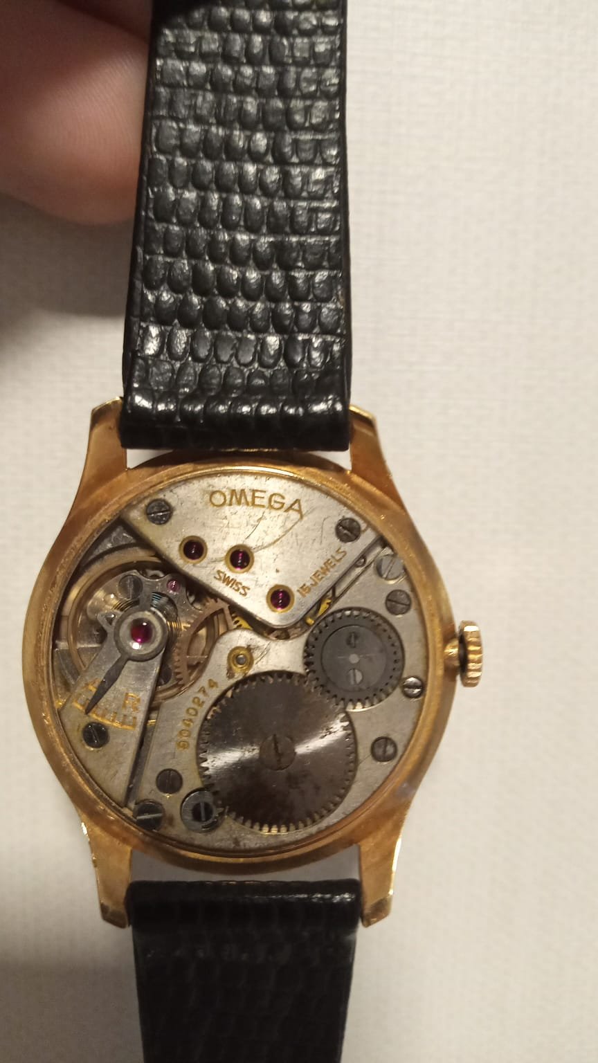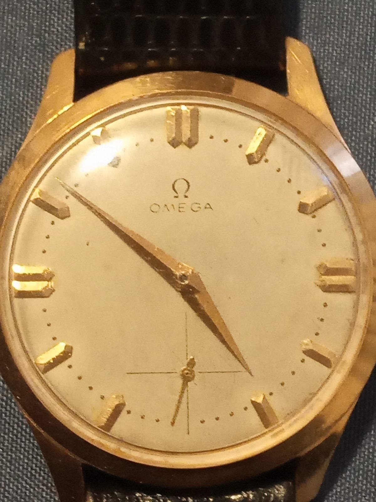 Is there a triangular Omega stamp also in the case-back? Could you possibly post better photos? Try different lighting, and zoom in with the camera. Usually a modern cell phone is capable of taking excellent photos with a little effort.