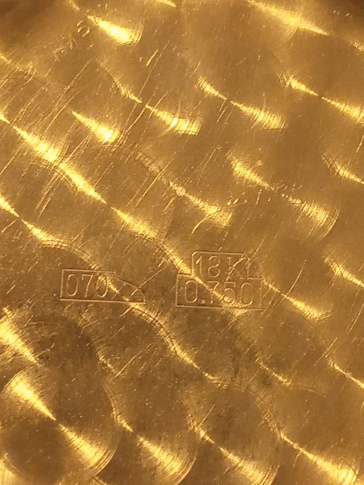 OK, a 9.0M serial number implies production circa 1939. The case-back indicates that the case is 18k gold. I could not find a maker's mark of "070" in a hammerhead, so you might want to see if you can get a closer look with a loupe, it's possible that you mis-read it.