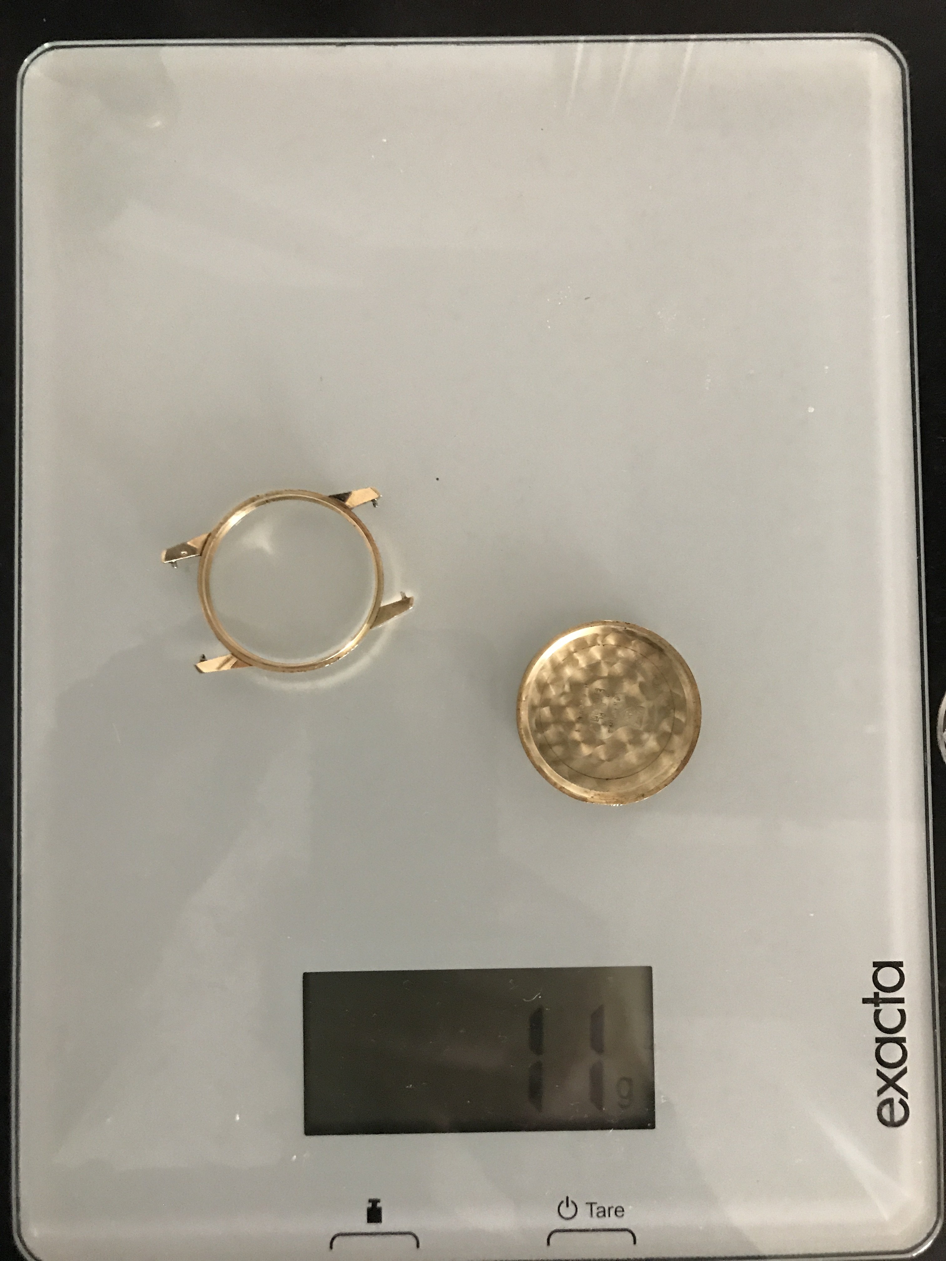 depends realy on the watch, I had a lady,s dress watch that was around the 8 grams of 18ct gold and had a men's dress watch that was about 6 grams. the best way to know is remove the movement and the glass and weigh. or if you are not in the position to do that open de back and weigh the case back then you will see if they use a lot of gold or it is a thin layer. (like those cheap chronograph Swiss watches 18ct)