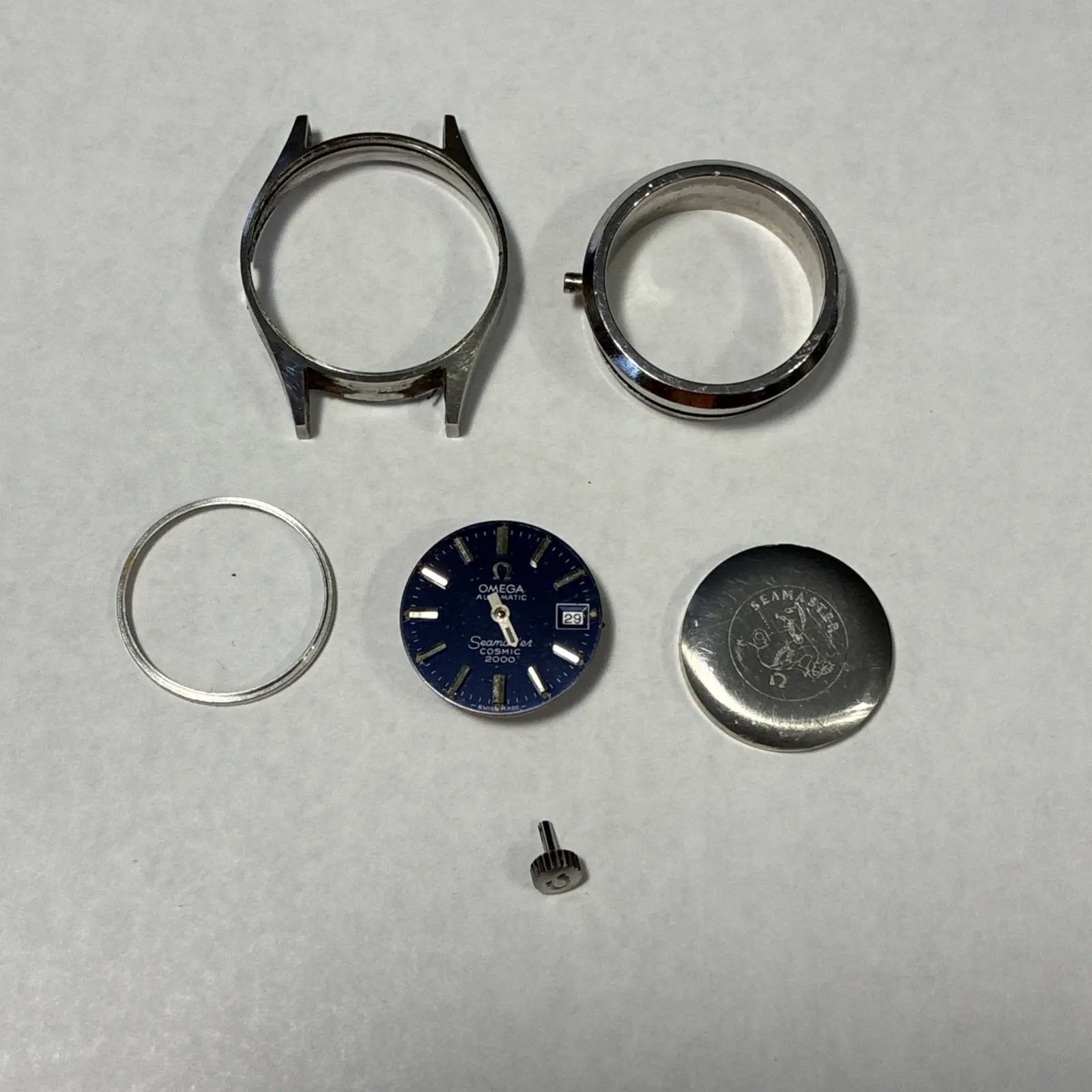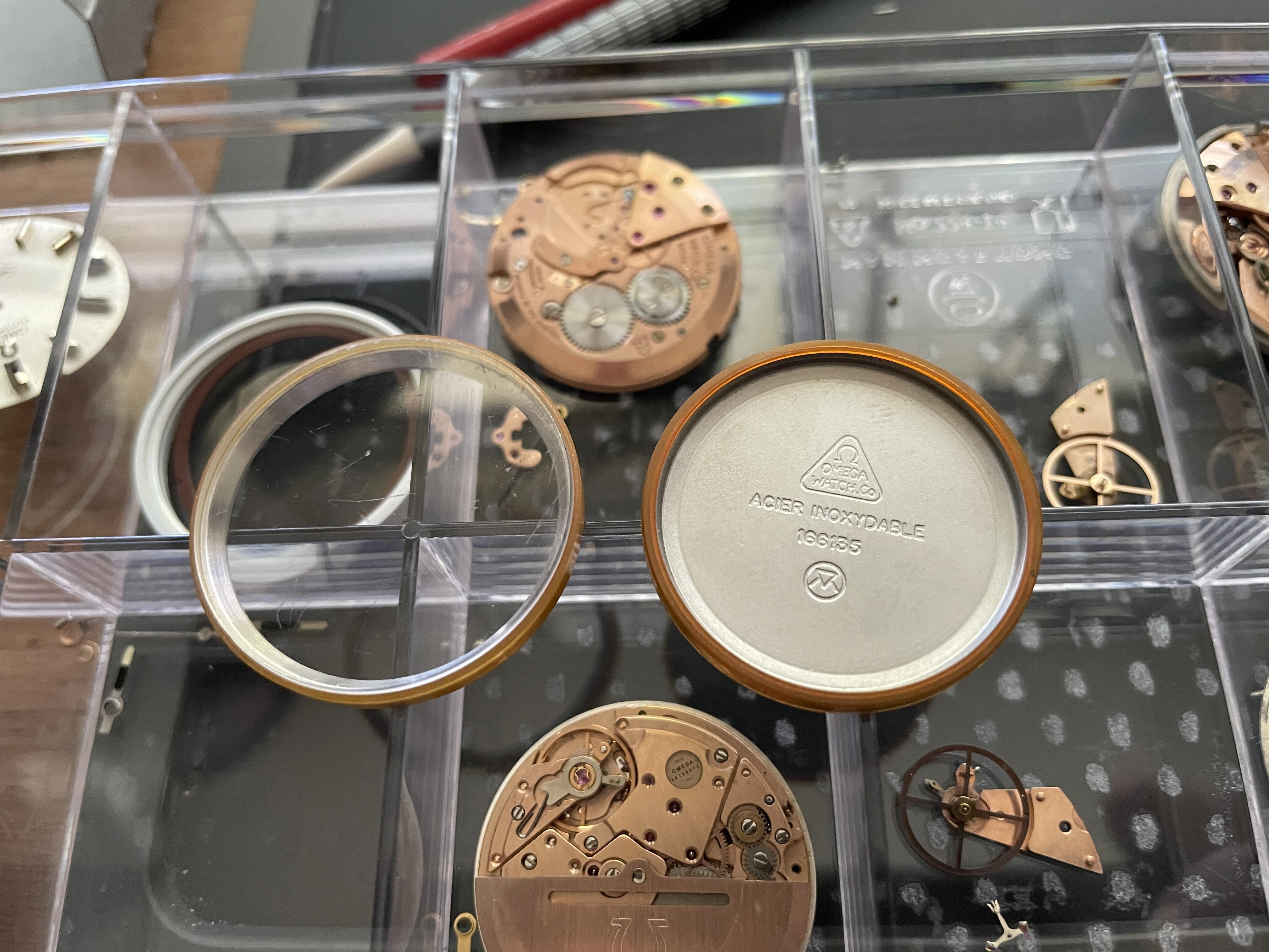 I believe the blue is MOST of a watch (missing a crystal obviously, but also something else...), but it seems to be missing a piece, which almost looks red in the pictures of the salmon, that goes between the movement and the case-liner-thing. The case liner fits perfectly in the 'case' part, but the case back and the movement/etc itself is way smaller than the case-liner-thing.