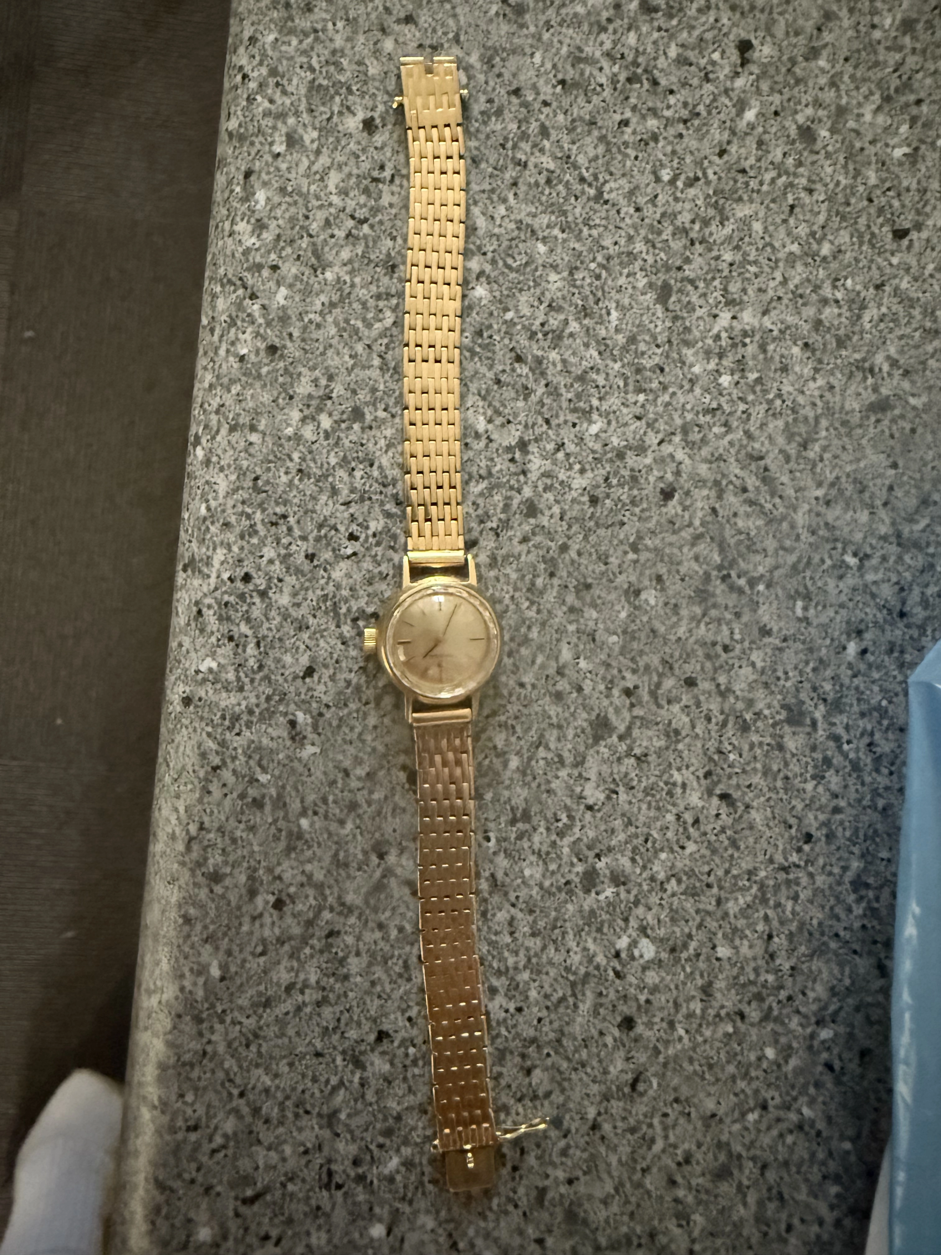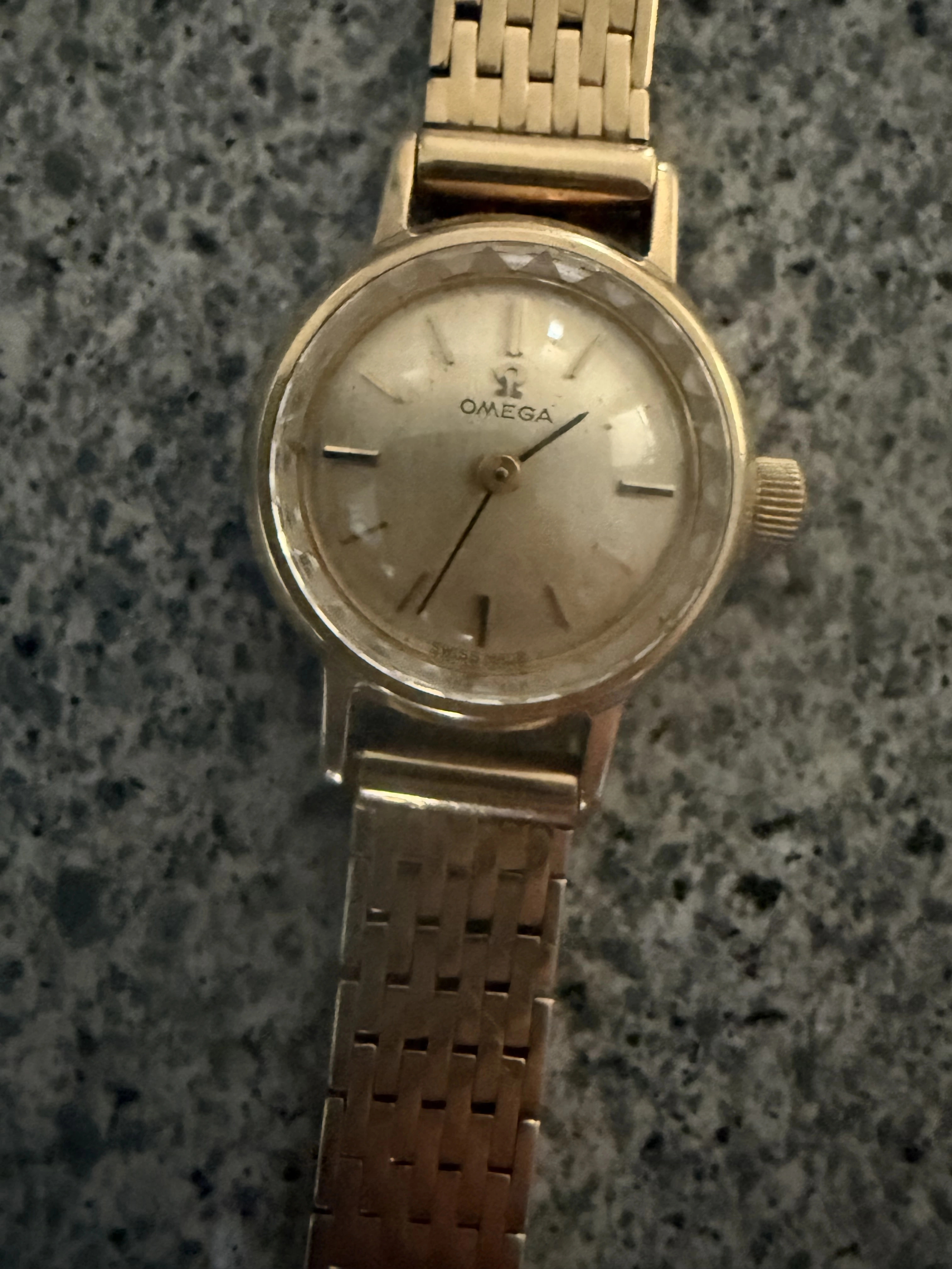 It is an Omega Sapphette. Synthetic sapphirevcrystal, faceted like a gemstone. This was a top of the Omega line in the 1960s. Manual wind, 14 or 18 karat gold case. Try to find a lady in your life that would enjoy it, and have it serviced. There isn鈥檛 a battery, so she鈥檒l have to wind it. Sell it for scrap. Really?
