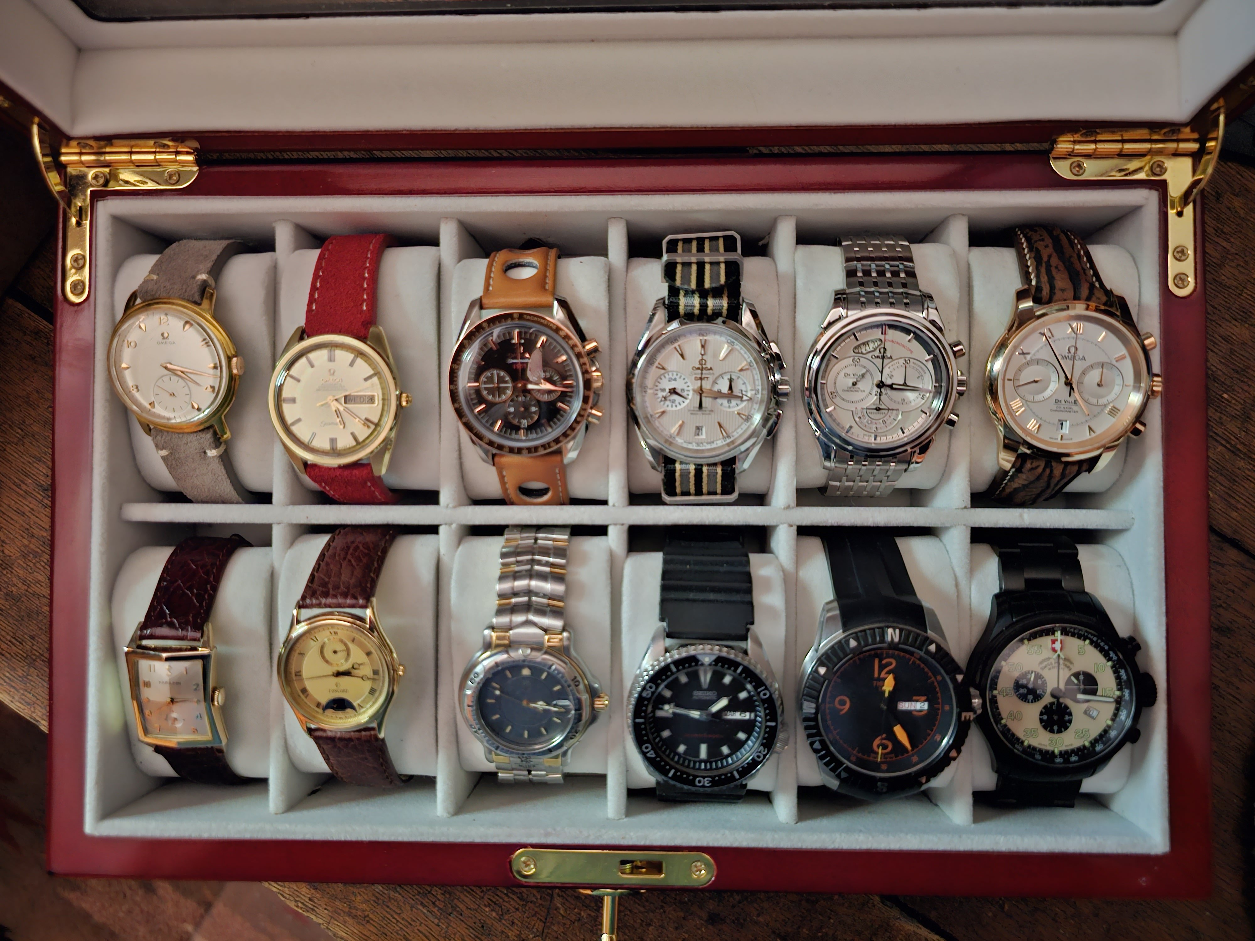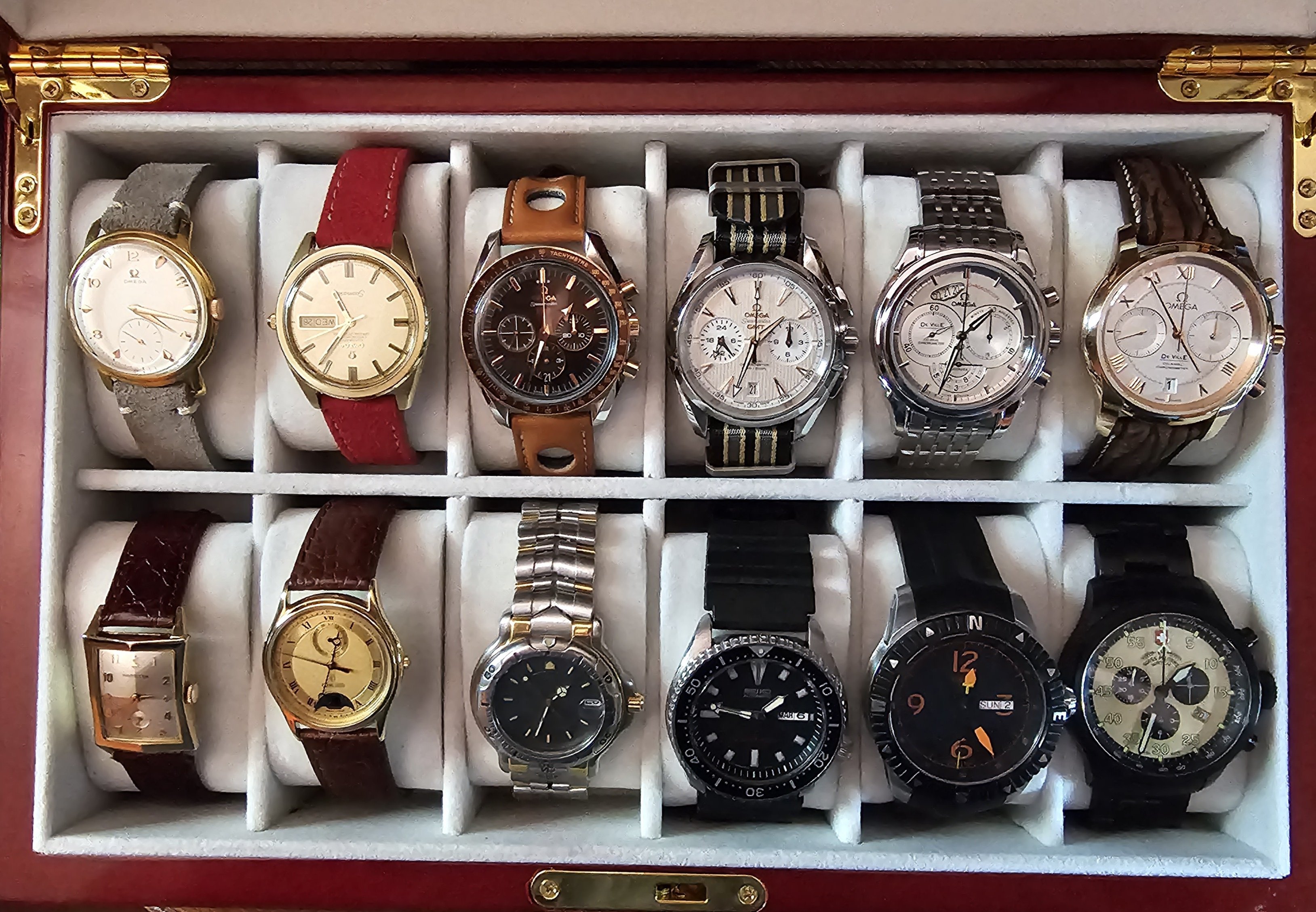 ·Times change everything. Pun intended, or otherwise. Disclosure: I'm not a collector, I'm a wearer. So, I liked what I liked when I bought them. I just finished out my watch box...at least for now. It was interesting to reminisce about them. The where's, the when's and the why's. First, bottom left, a 1957 Hamilton. Why? Born the same year as me. Then my first two luxury watches. For both of them at the time, for me, the '87 Concord and the '93 Tag were big. Next, a couple of sport watches. Then? OMEGA took over. The top row is all Omega's. The oldest being a 'Jumbo' from the '40's. The memories of them are just as cool as having them sitting in my box.