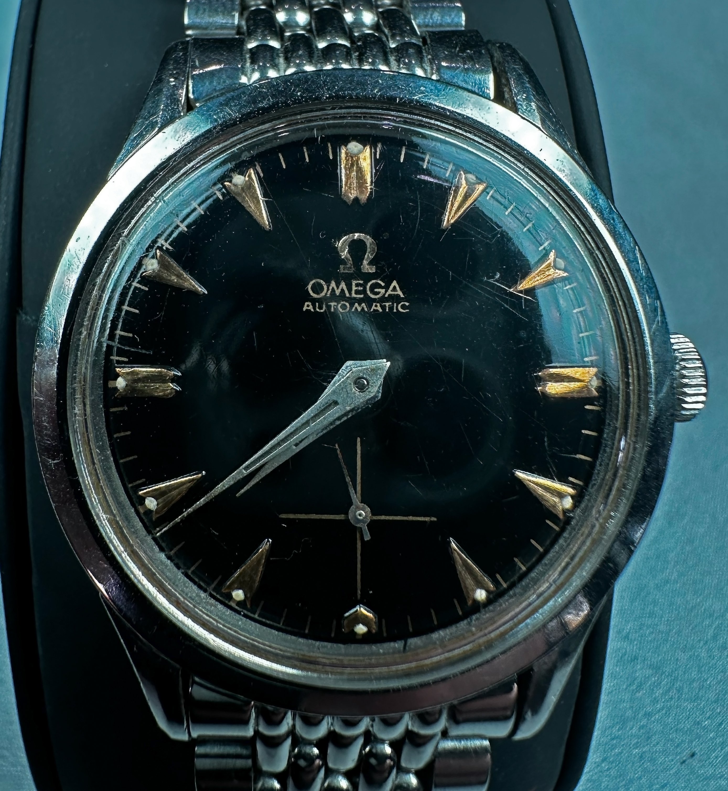 ·Please pick this apart. I believe it is early 50s. I believe the dial may have had lume added at a later date. I believe the hand set may not be original. I know the band is Omega, but I'm not sure if original. I knew the owner and he would not have add to this watch, and most likely bought it that way. I was able to find similar watches from the late 40s early 50s with the help of the Omega Boutique. But we couldn't find an exact match. I believe the case requires special tools to take apart. The watch keeps incredible time for its age and I don't really want to mess with it.