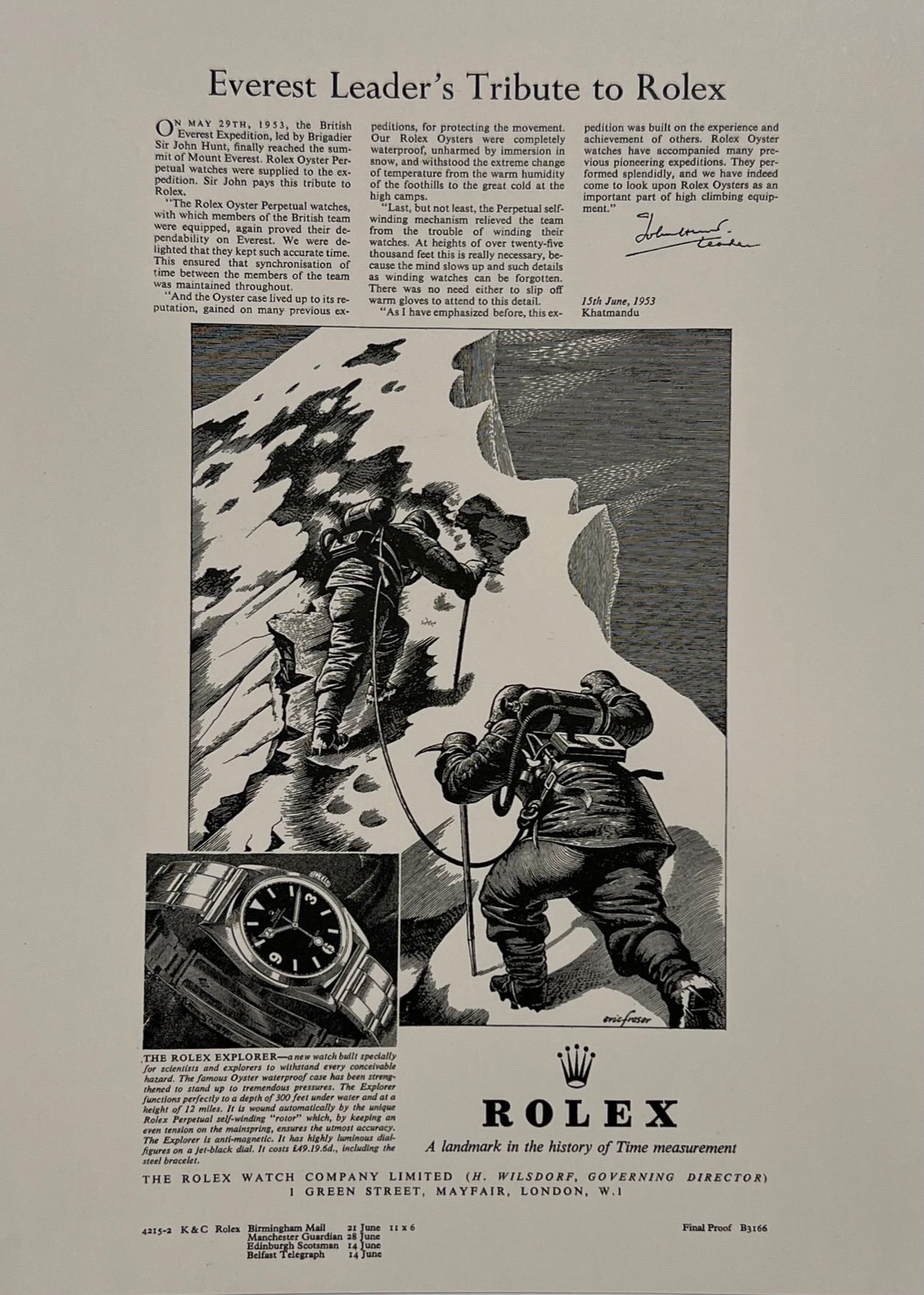 Between 1933 & 1953, Himalaya expeditions had been sponsored by Rolex, so Rolex 6098 watches were worn to the top of Mount Everest, but British-made Smiths A409 wrist watches were worn on the top of Mount Everest. However, already on January 26 - 1953, Rolex had patented the name “Explorer” for their upcoming line of time only watches.