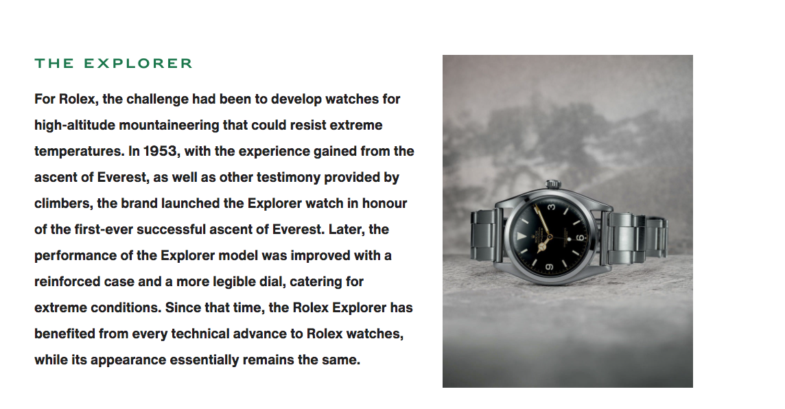 The Omega equivalent would be something like "We supplied NASA with watches that were used by the crew of the 1969 Apollo 11 spaceflight which landed men on the moon for the first time ever" = "Yeah, not actually ON the moon, but, you know . . . [and if you get the impression that they were worn on the moon from what we've said, well, we can't be responsible for what people think.] But, no, Omega can make a simple statement: "first watch on the moon". Five words. No hedging or fudging. Rolex cannot do the same for Everest. So they don't. Instead we get . . . is "misled" too strong a word?