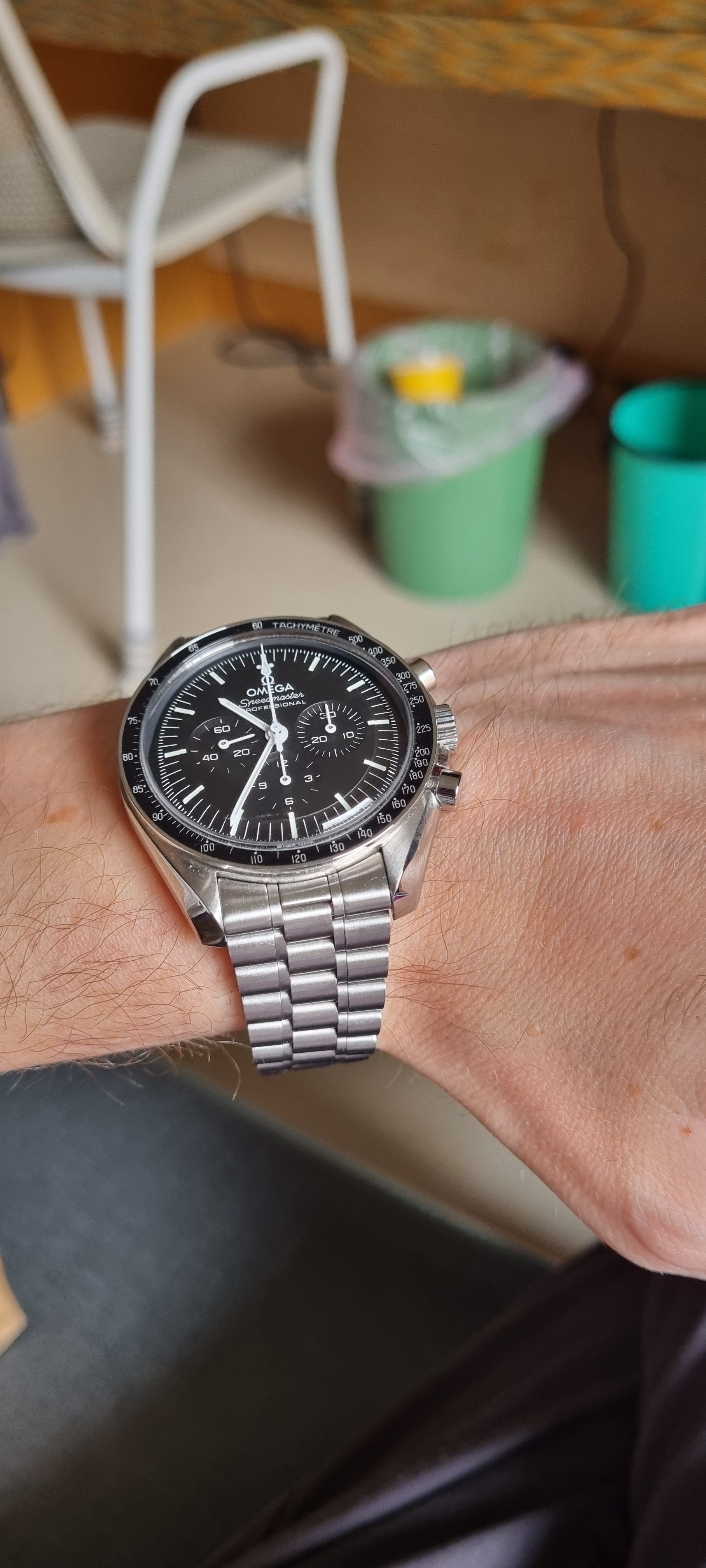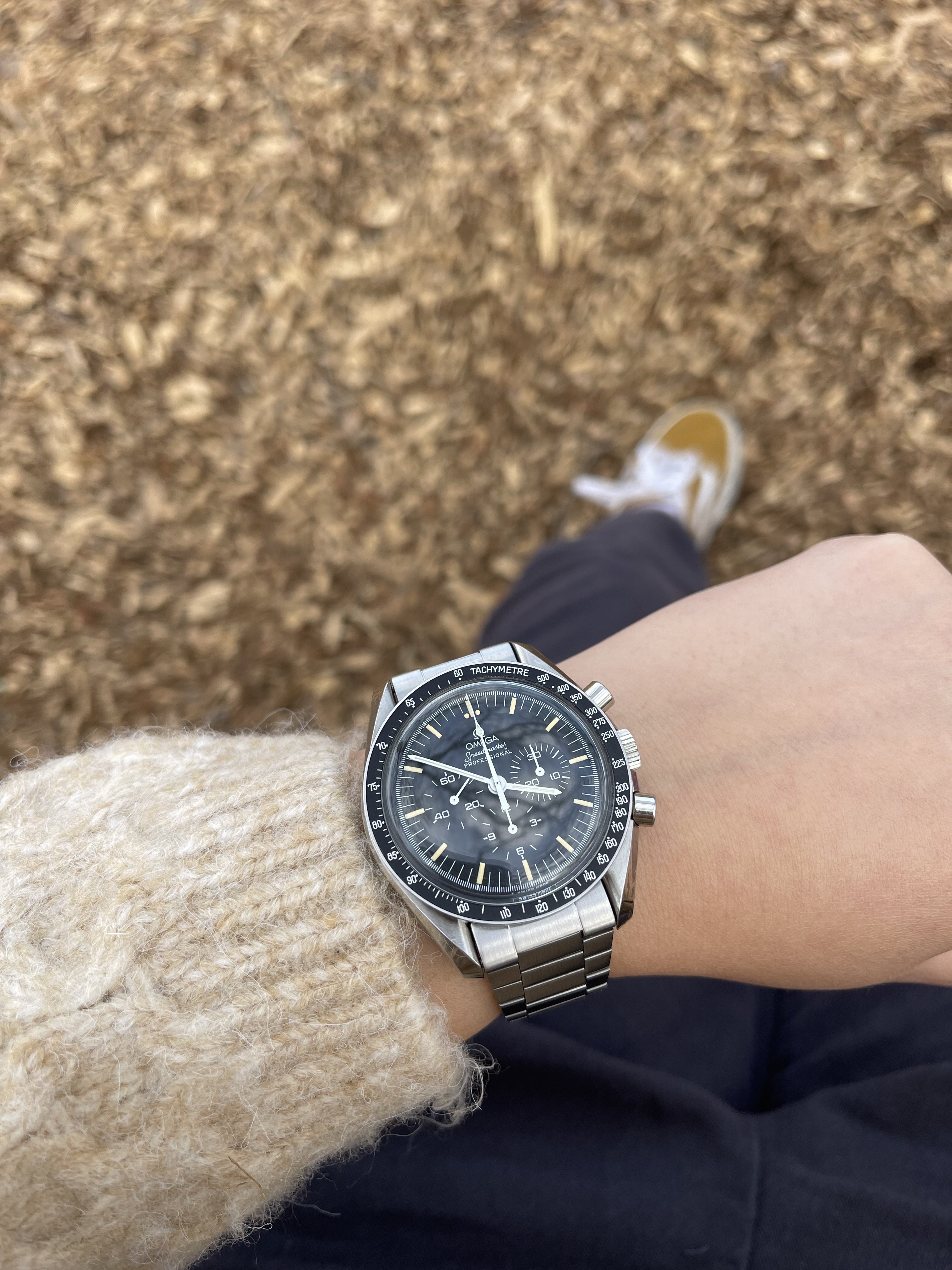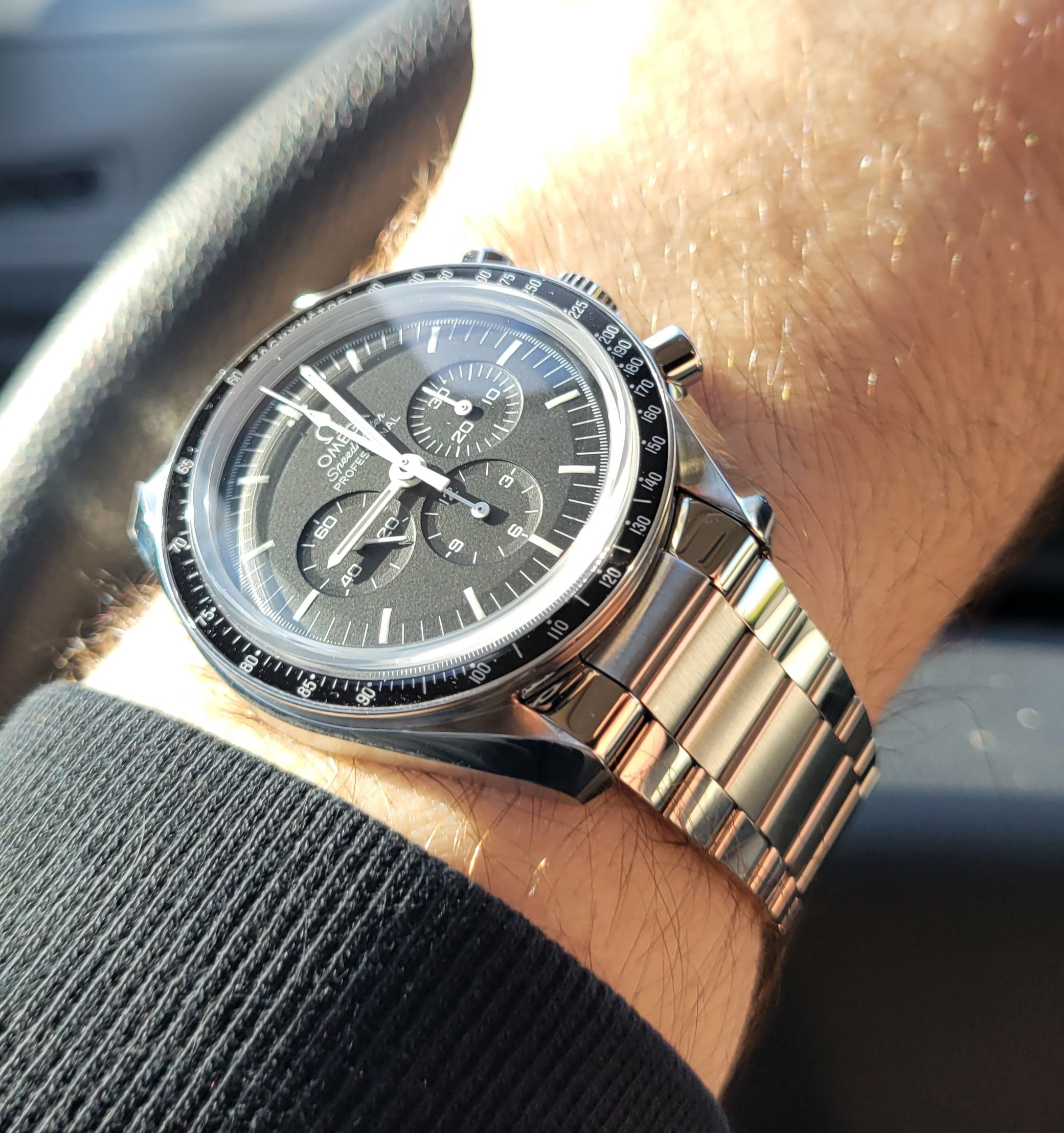 My Speedmaster has been my most worn watch for a span measured in decades, but, I haven't been wearing it that much lately - partially because my modest collection offers a few more choices these days...but, also, a year or so ago, I swapped out the OEM oyster-ish bracelet that came with the watch for the new, brushed, small-link Omega bracelet and I think that combo might have changed the "vibe" at a sub-conscious level. It's taken me a little while to realize this, becauseI like the new bracelet: . It is comfy, attractive ( although the finishing is a little "meh" for the expense) and the half-link slider is a plus...but somehow it has changed the watch for me in a bad direction.