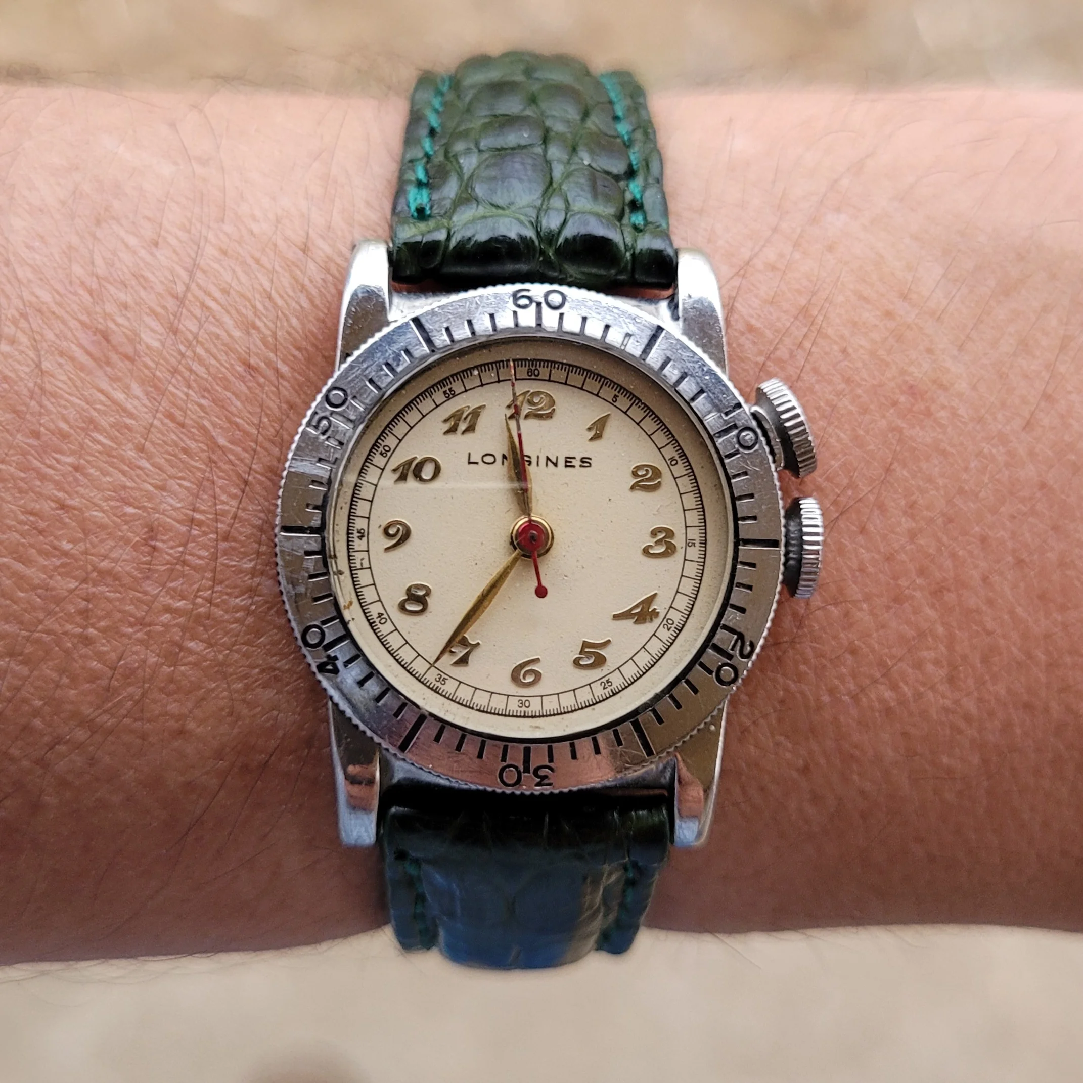 The white dials on these watches often look quite different in different types of light, but it’s more often a sepia tone that comes out in certain strong light and disappears in others.
