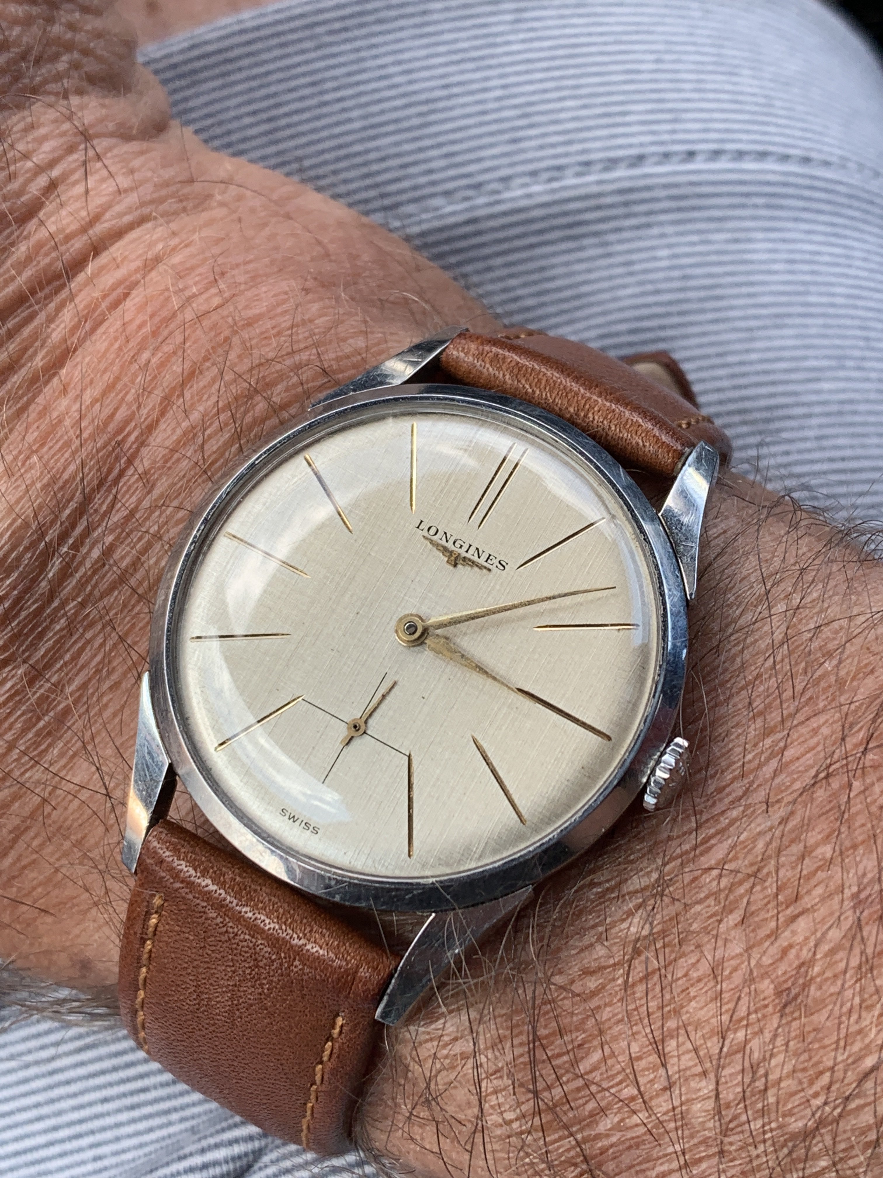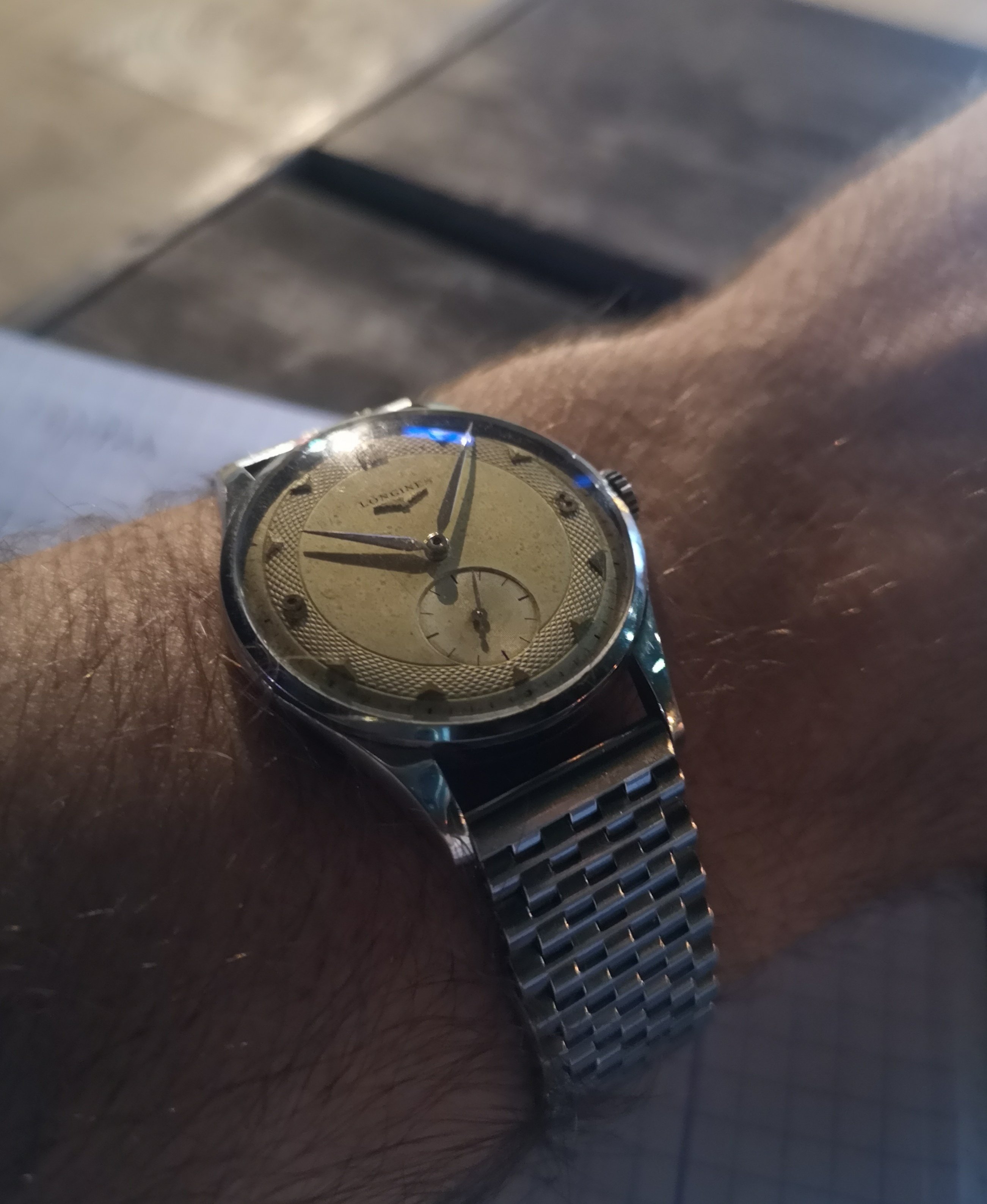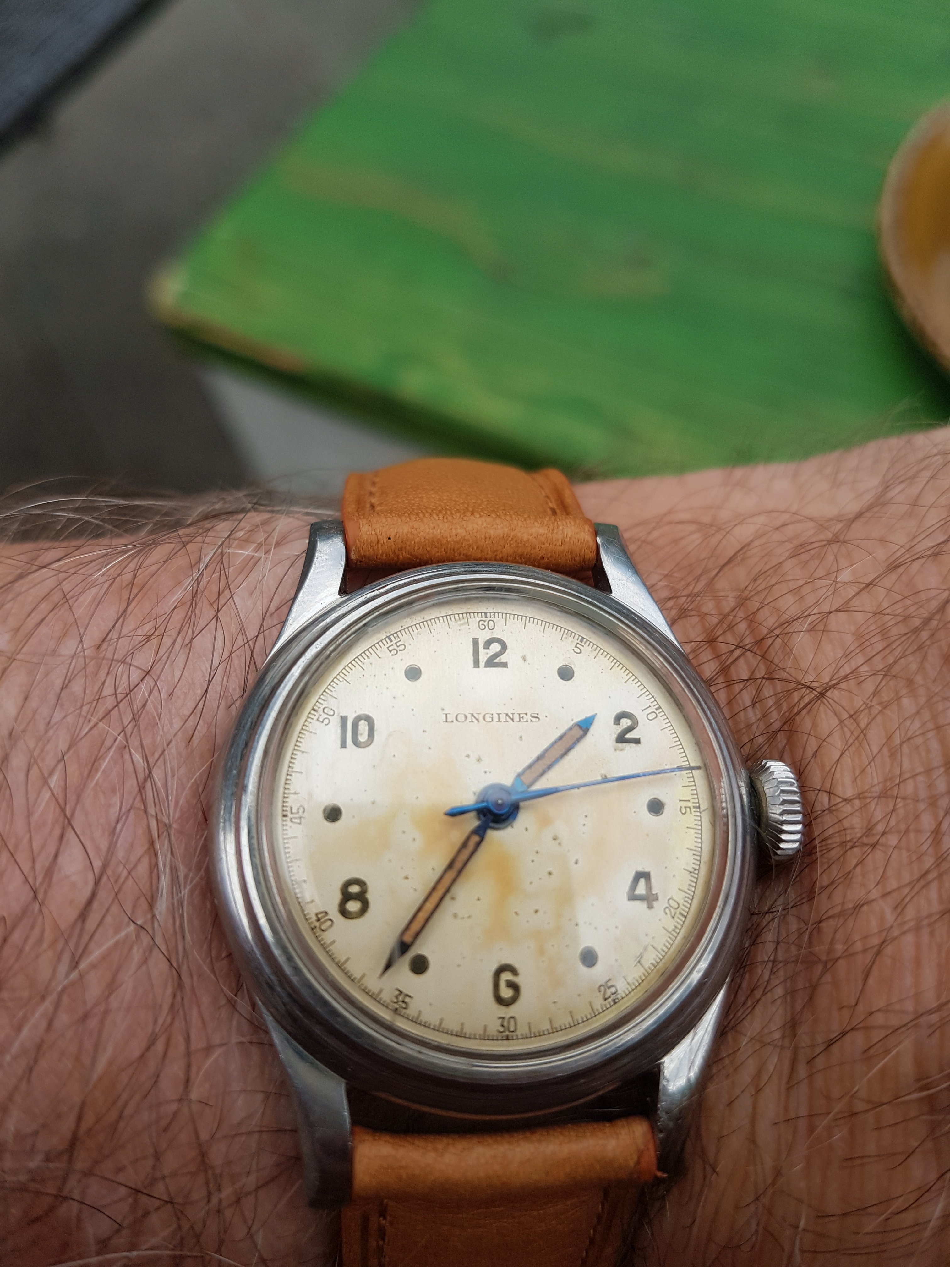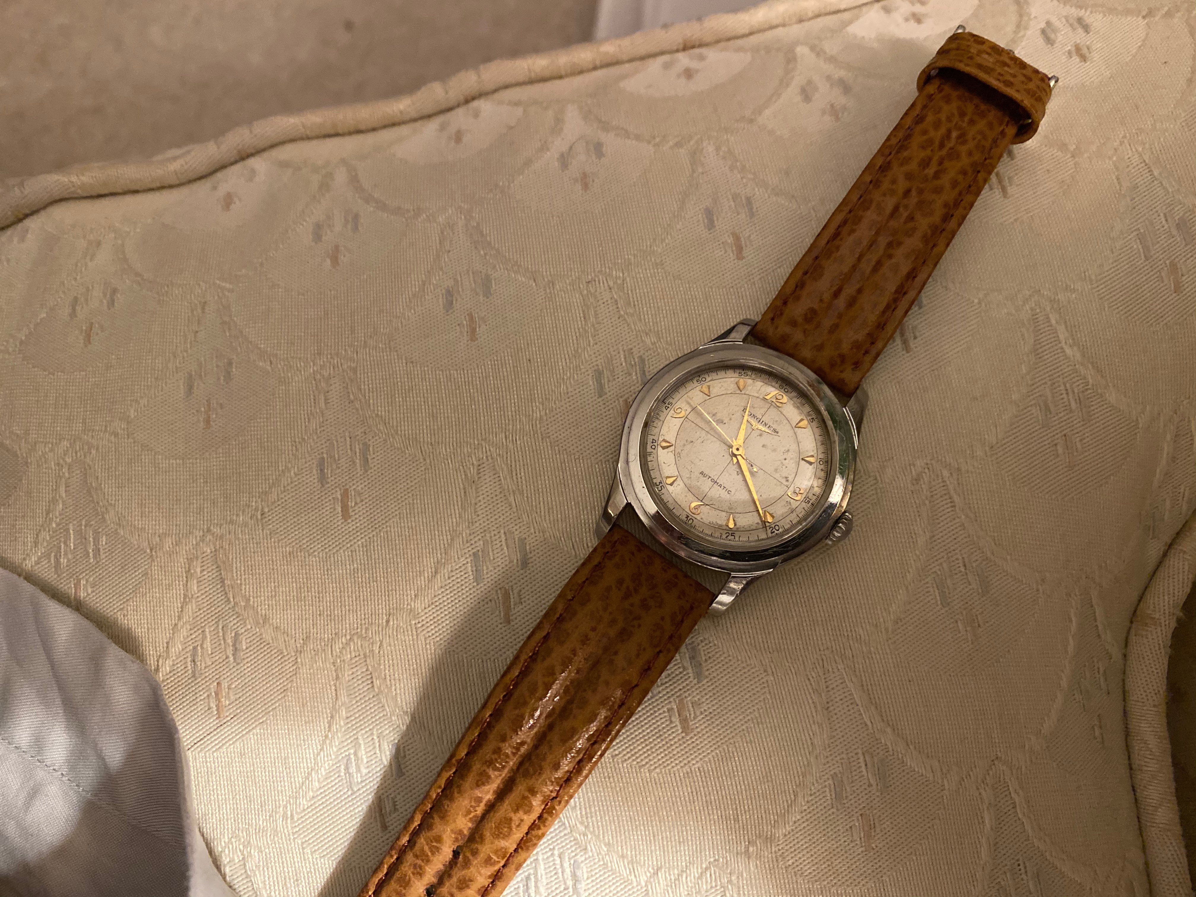 ·My grandfather passed away in 1978, his watch has just surfaced from my father's second wife and is now in my small collection. Quite tatty as can be seen but I like it as it appears to be all original, 12.68zs movement dates to 1950 that has suffered a little water ingress, Dennison 13322 stainless steel case which I like very much as I have a very early SmithS in the same (plated) case. It will go off for mvt service only when some spare cash appears.