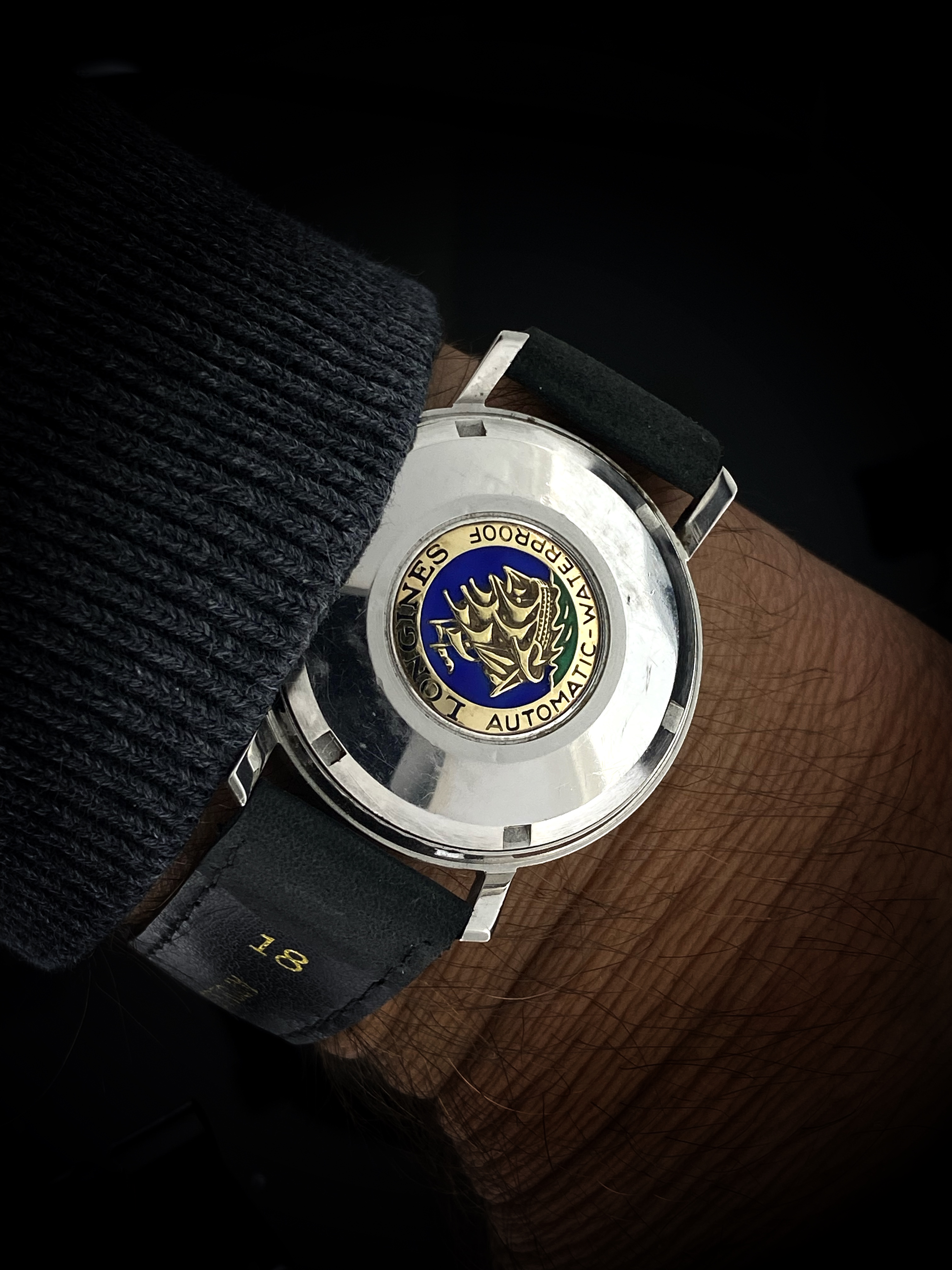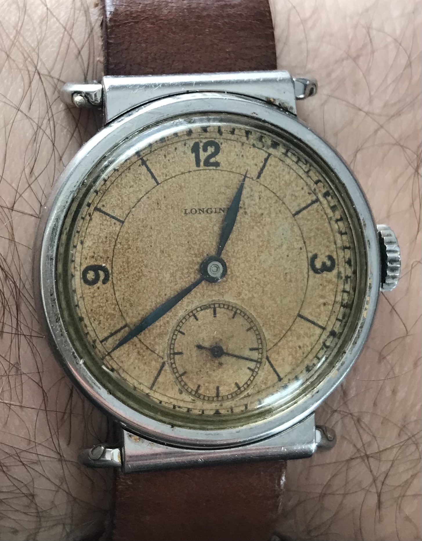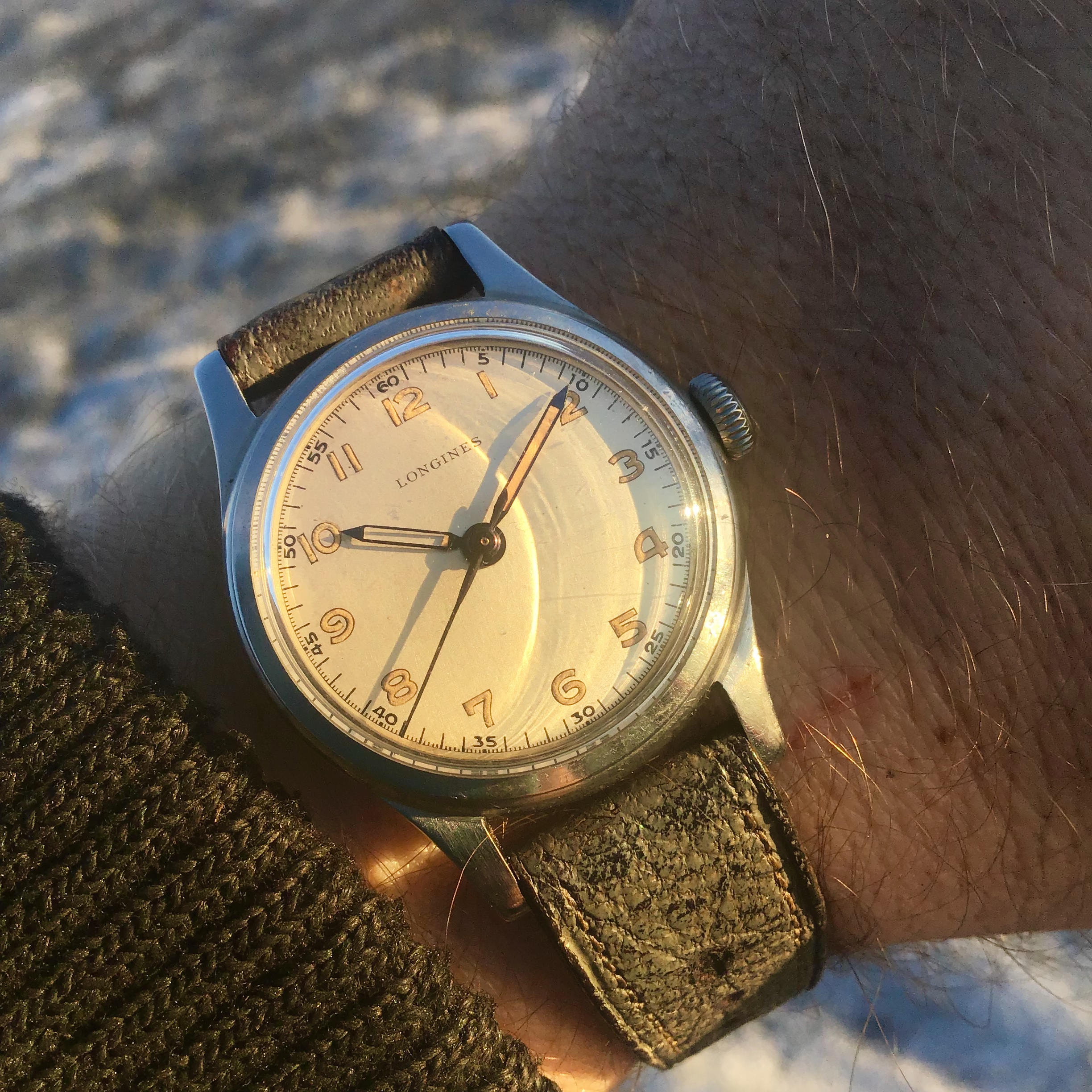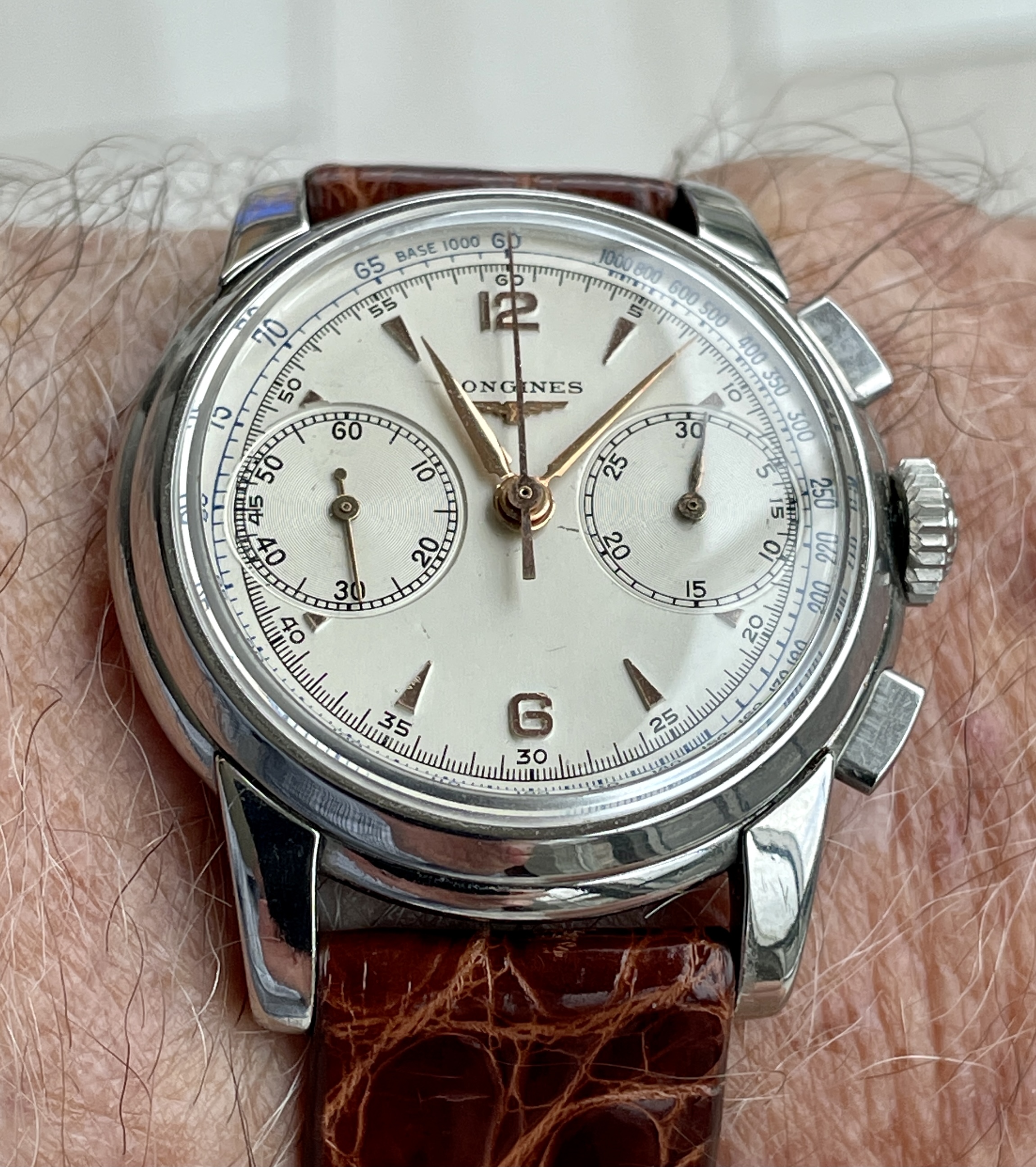 Vintage Longines Tre Tacche bearing the reference 5182 in a 35mm stainless steel step case. It is fitted with a Longines manually wound mechanical movement, caliber 12.687. It was invoiced on 16 June 1943 to the company Ostersetzer, which was at that time our agent for Italy according to the excerpt from Longines.