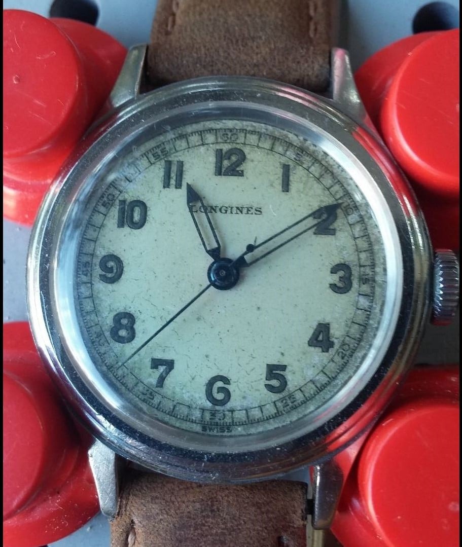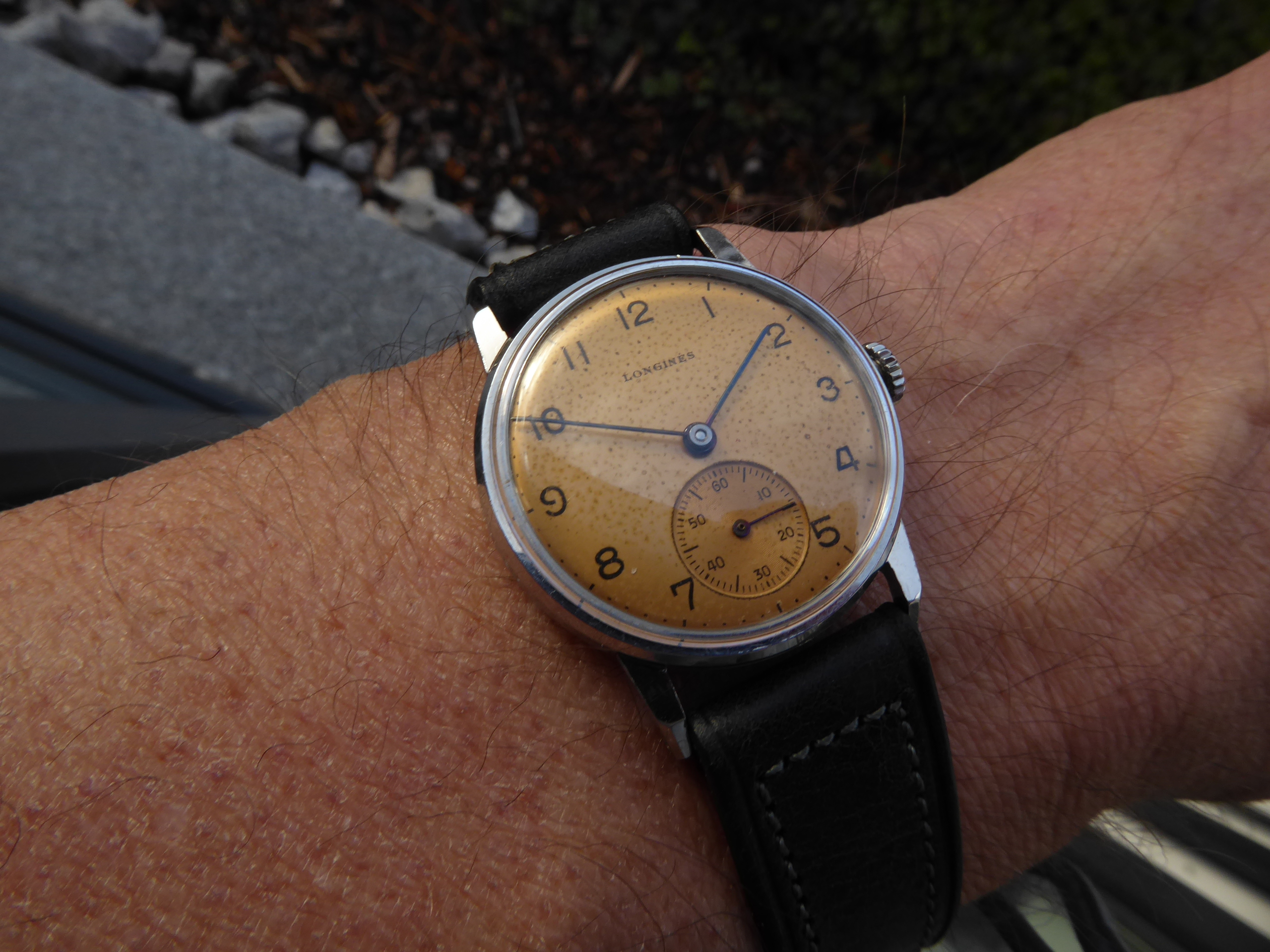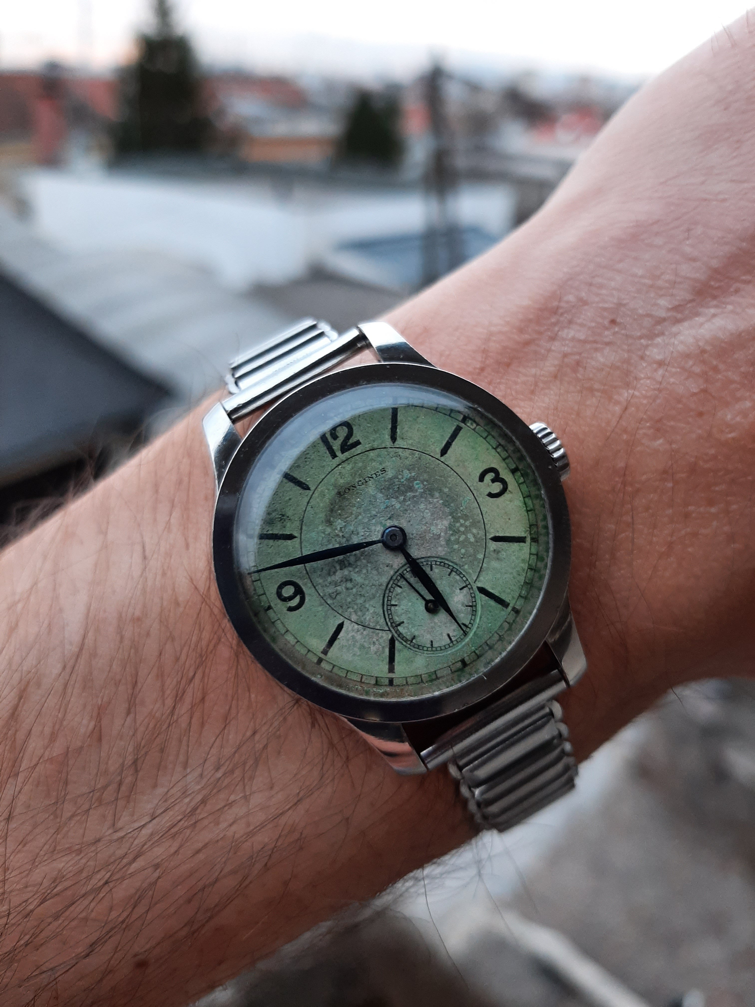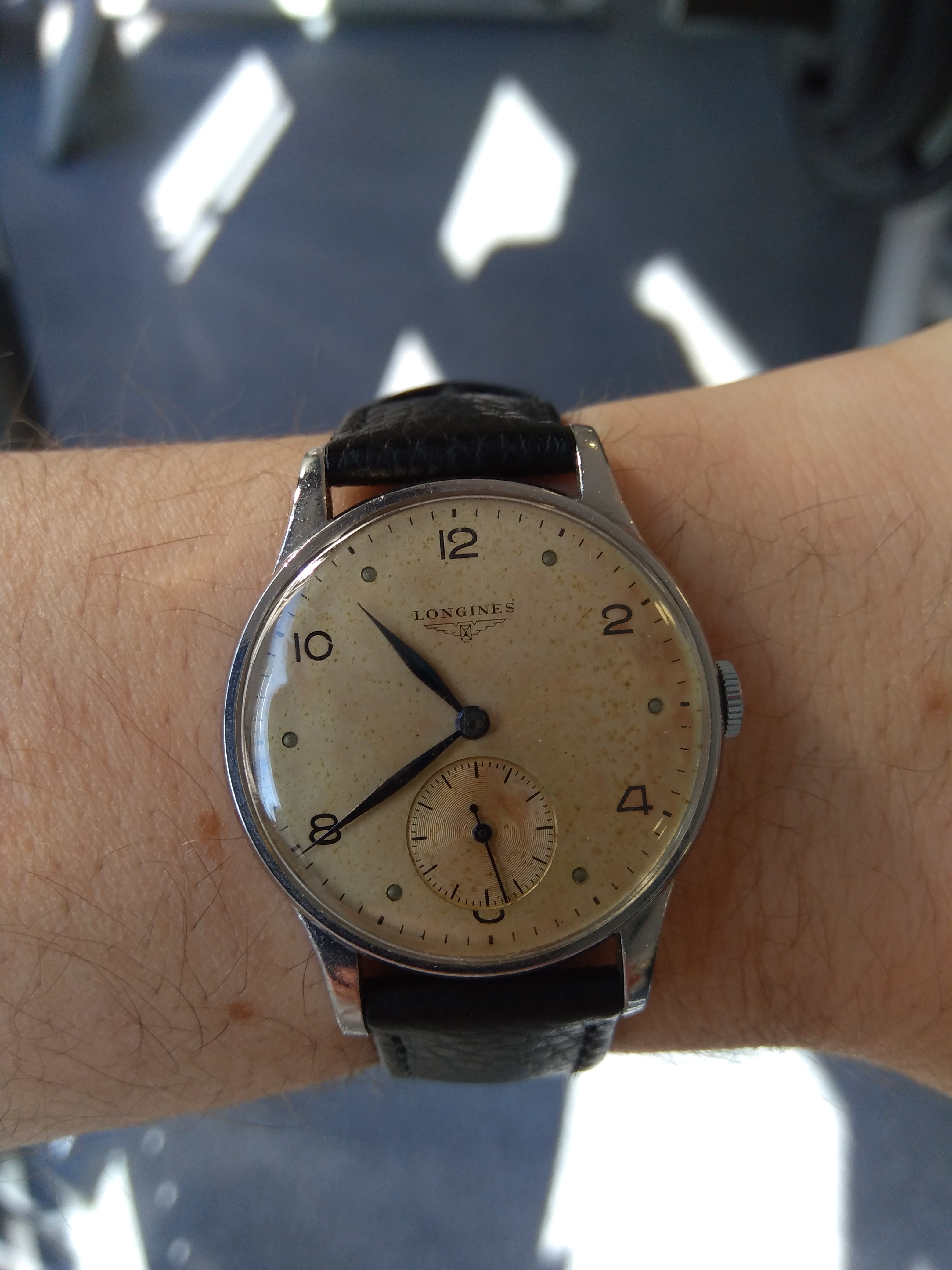 From 1929. White gold filled Canadian made case, white vitreous enamel dial, original hands, period correct expansion bracelet. This one was buried in a drawer for about 50 years, along with dozens of scrap watches, donor watches, and future prospects, until I acquired a replacement movement. My only Longines.