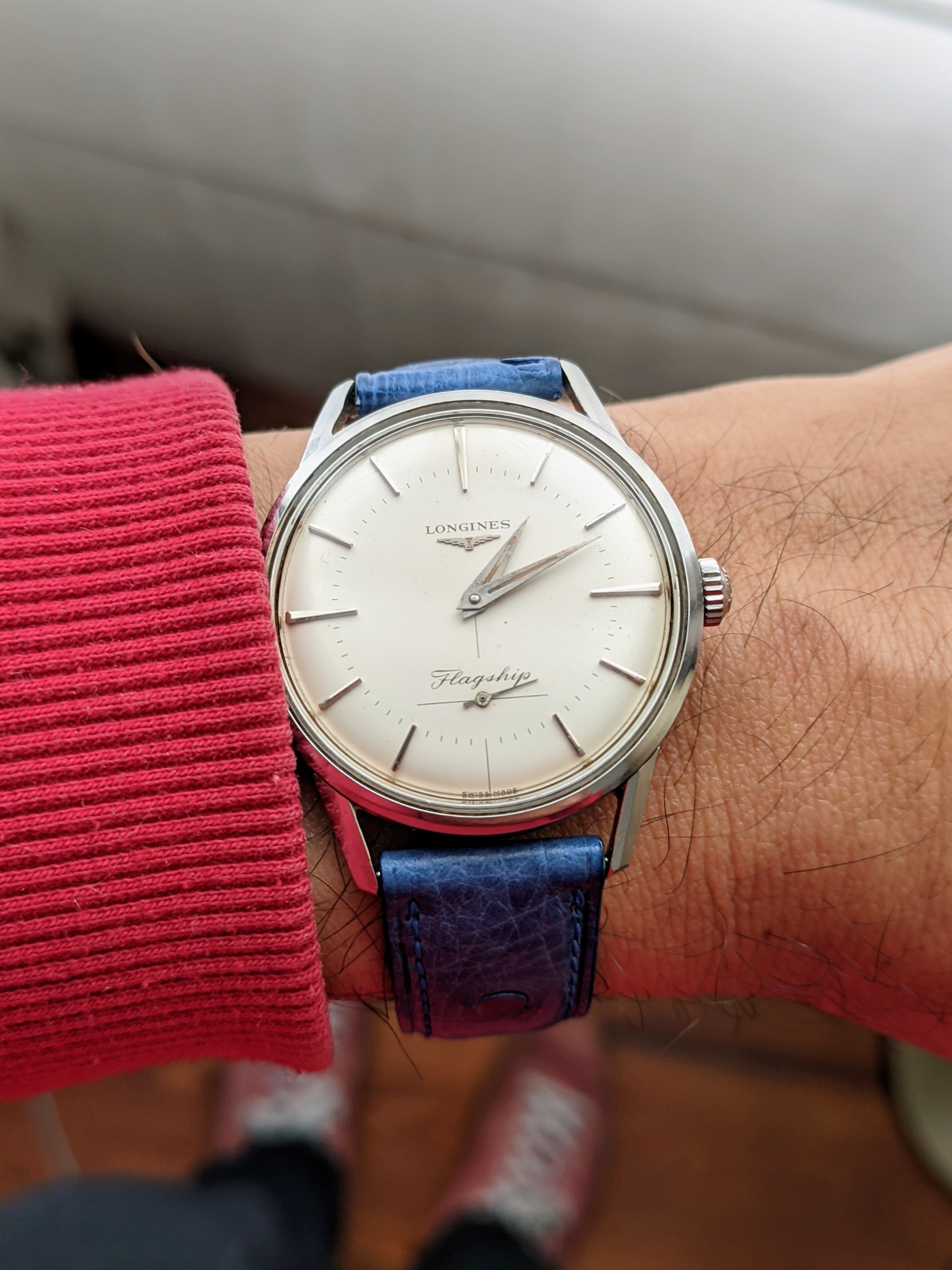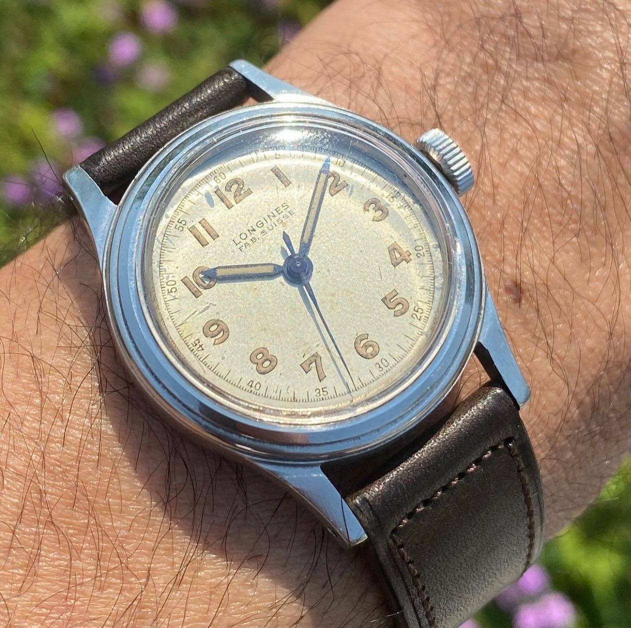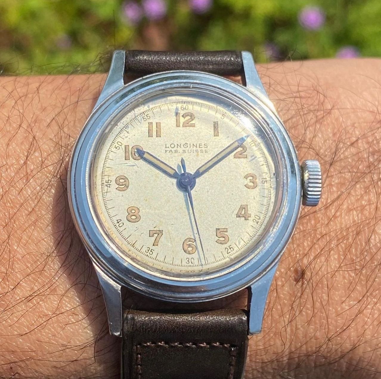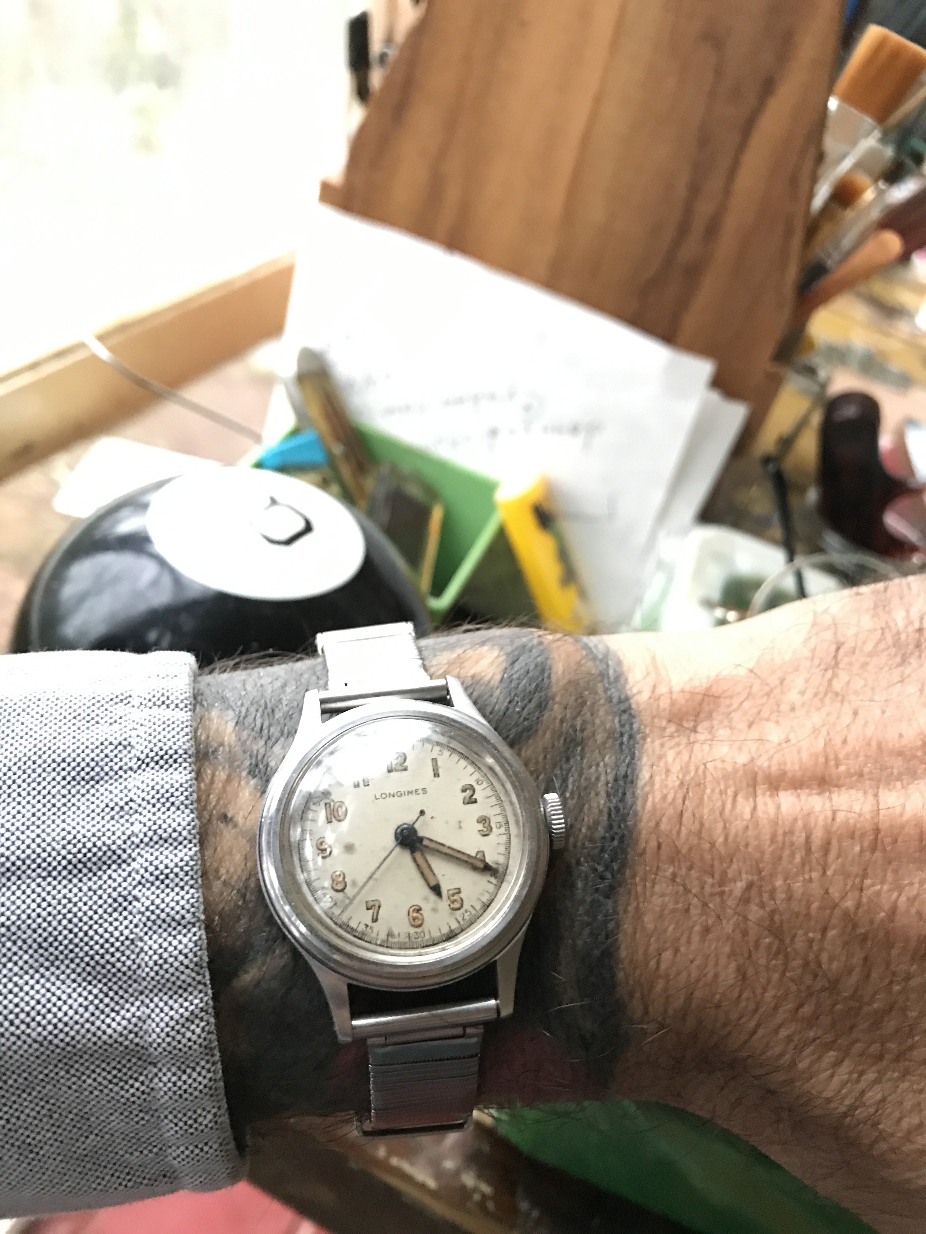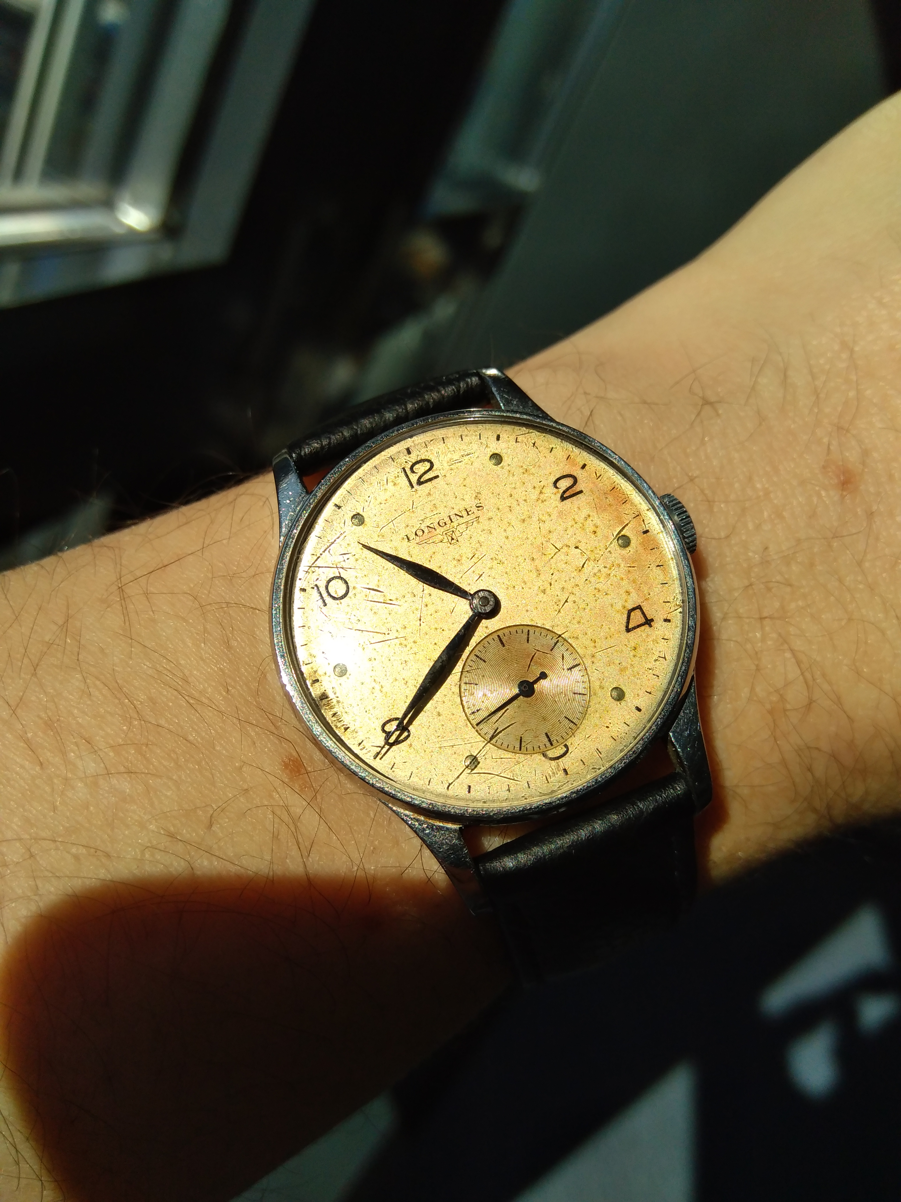 From 1929. White gold filled Canadian made case, white vitreous enamel dial, original hands, period correct expansion bracelet. This one was buried in a drawer for about 50 years, along with dozens of scrap watches, donor watches, and future prospects, until I acquired a replacement movement. My only Longines.