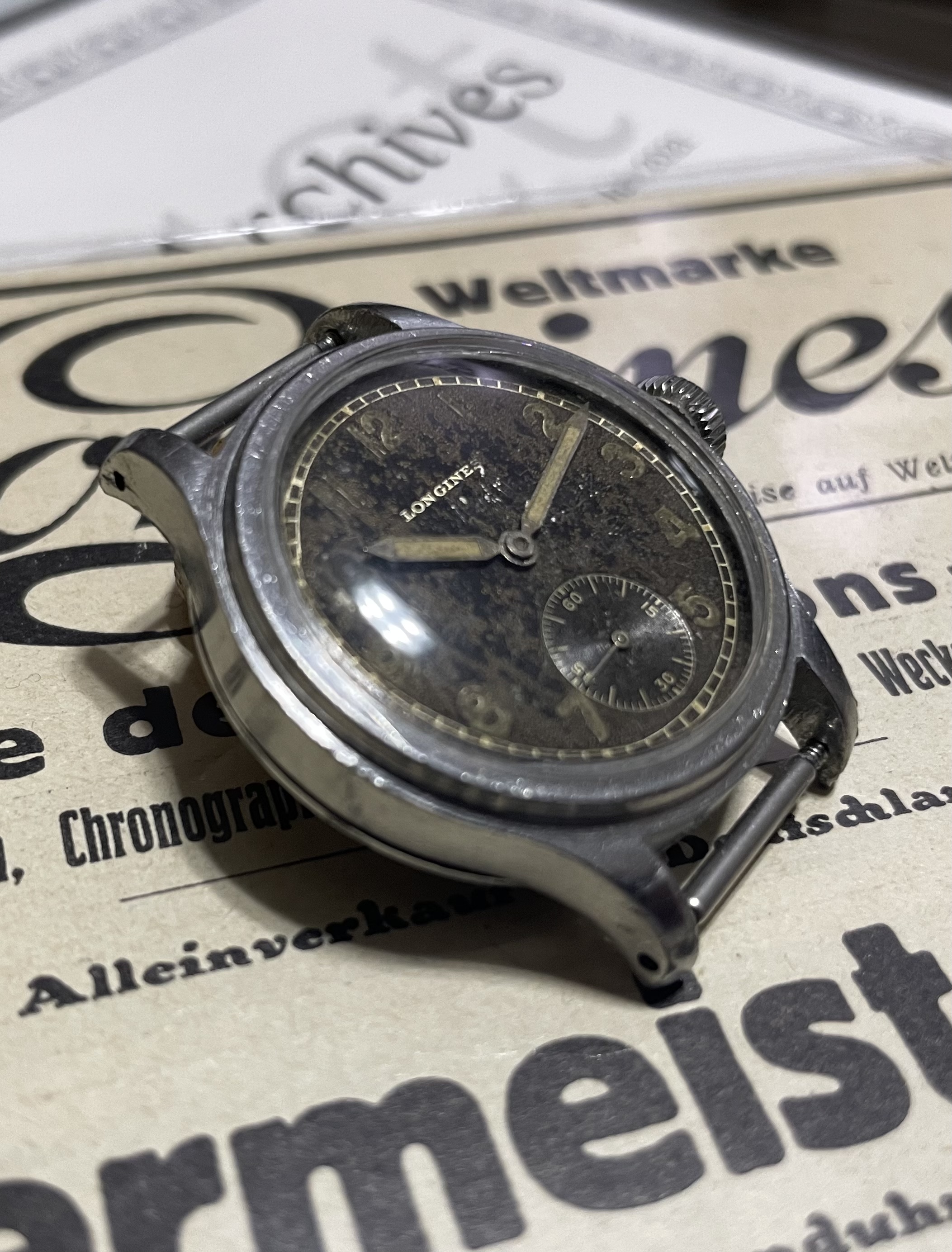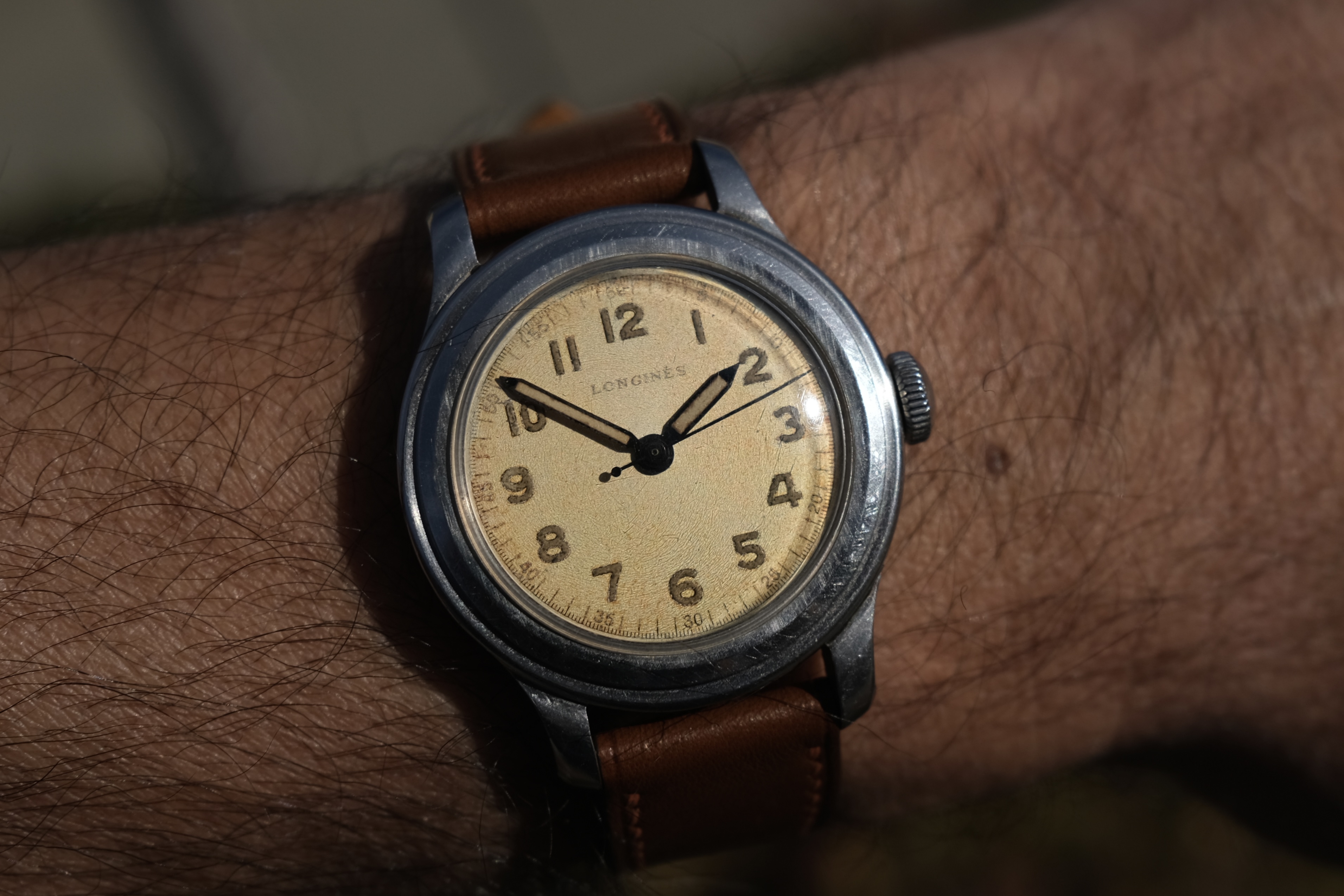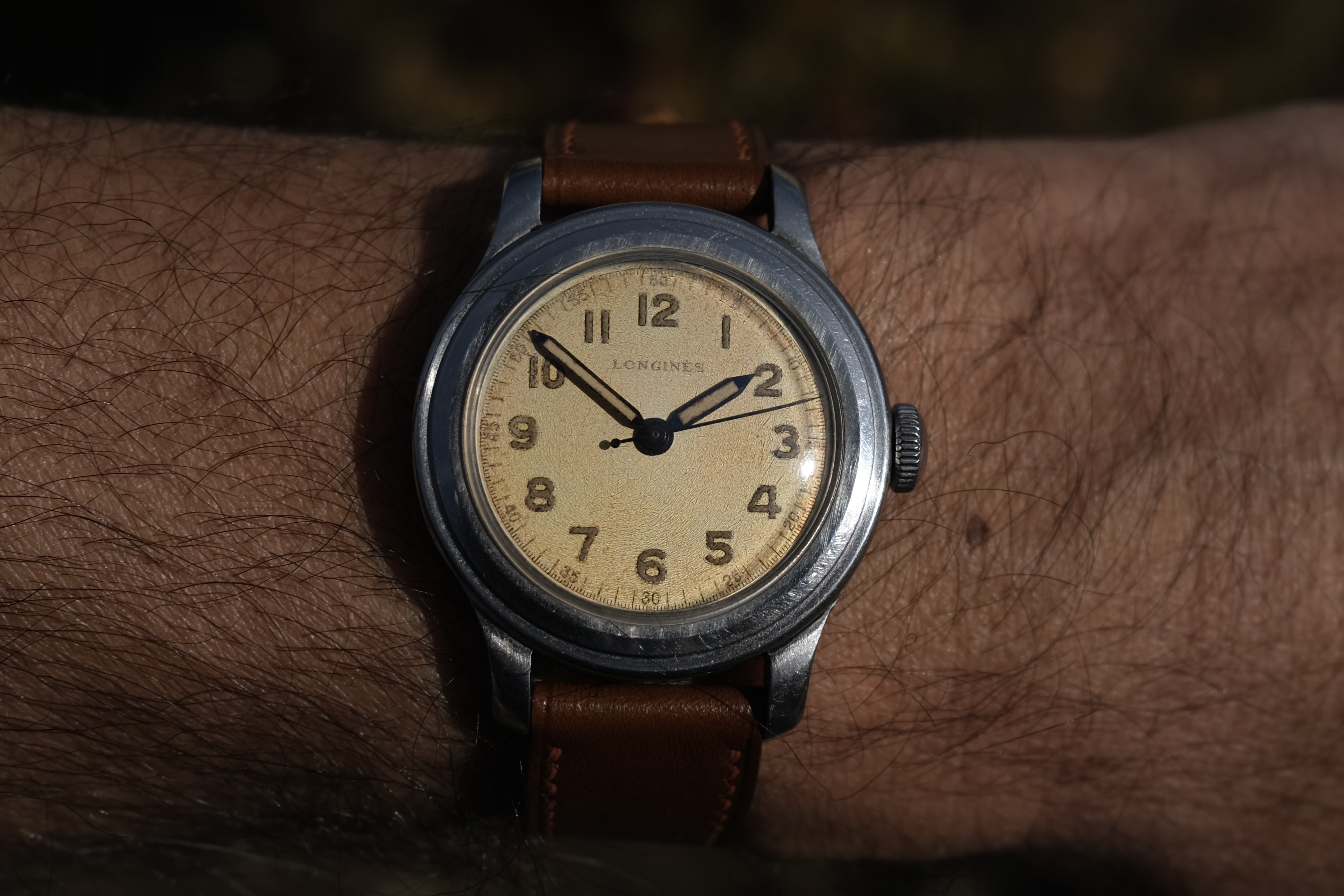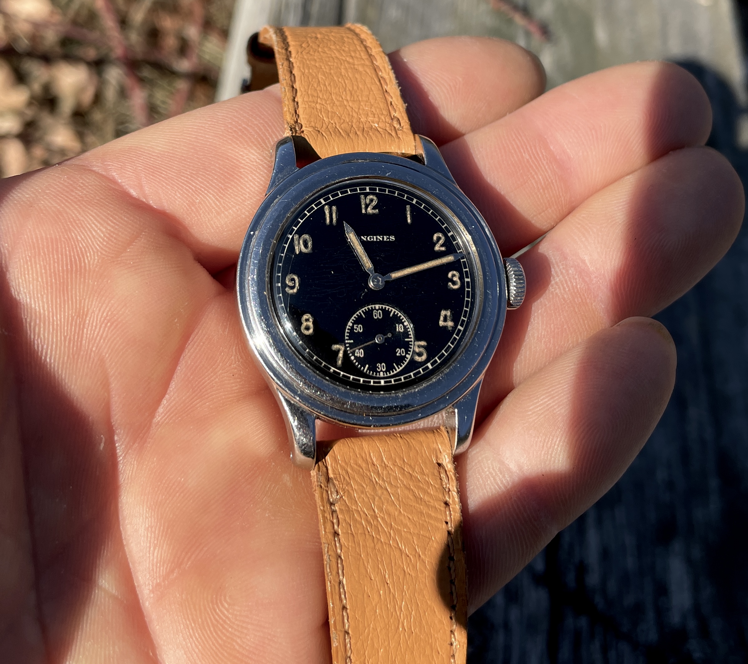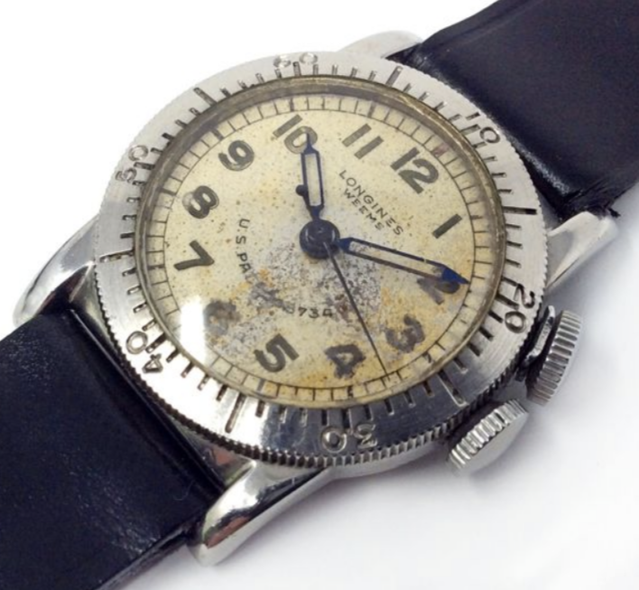 From 1929. White gold filled Canadian made case, white vitreous enamel dial, original hands, period correct expansion bracelet. This one was buried in a drawer for about 50 years, along with dozens of scrap watches, donor watches, and future prospects, until I acquired a replacement movement. My only Longines.