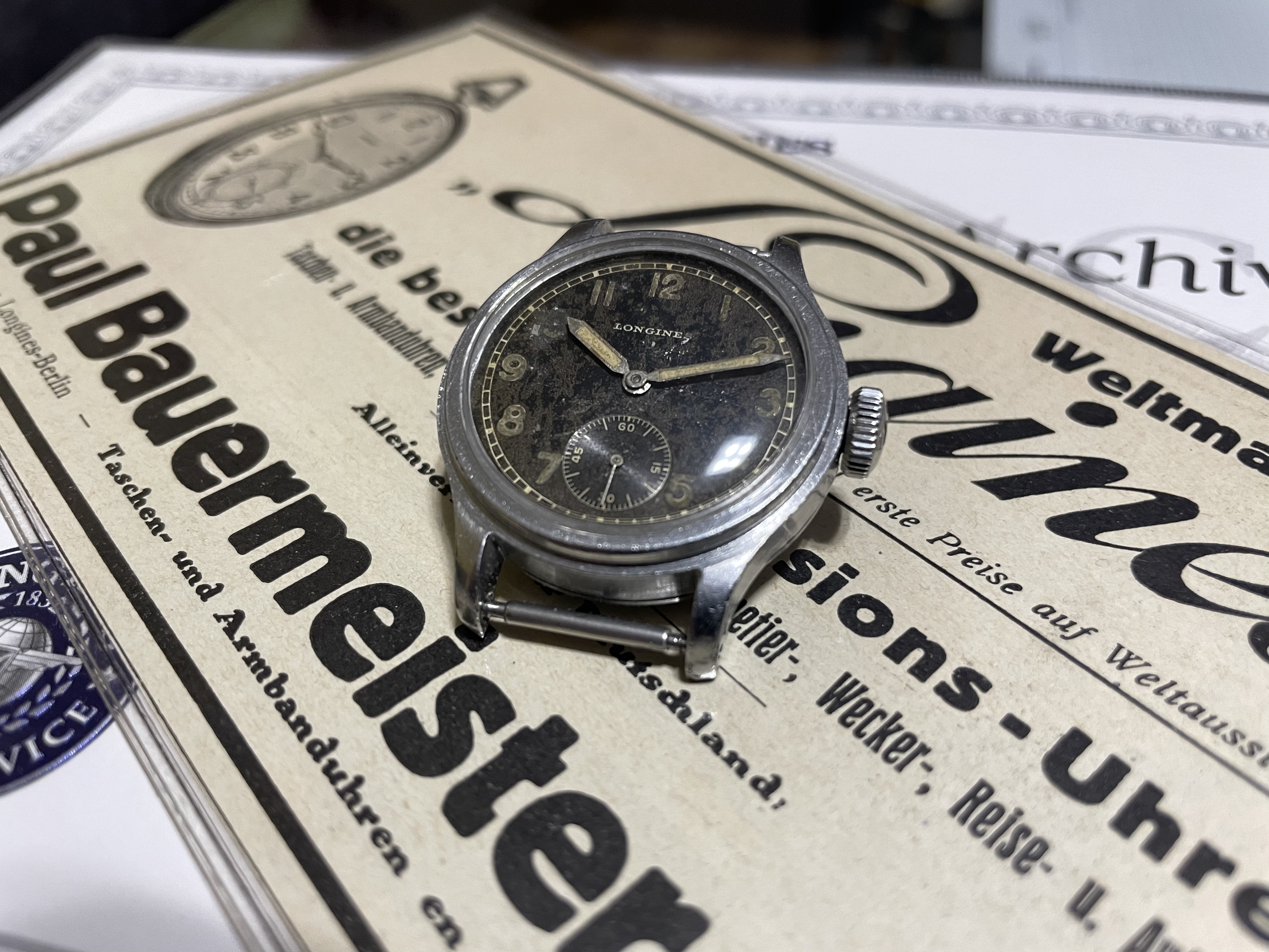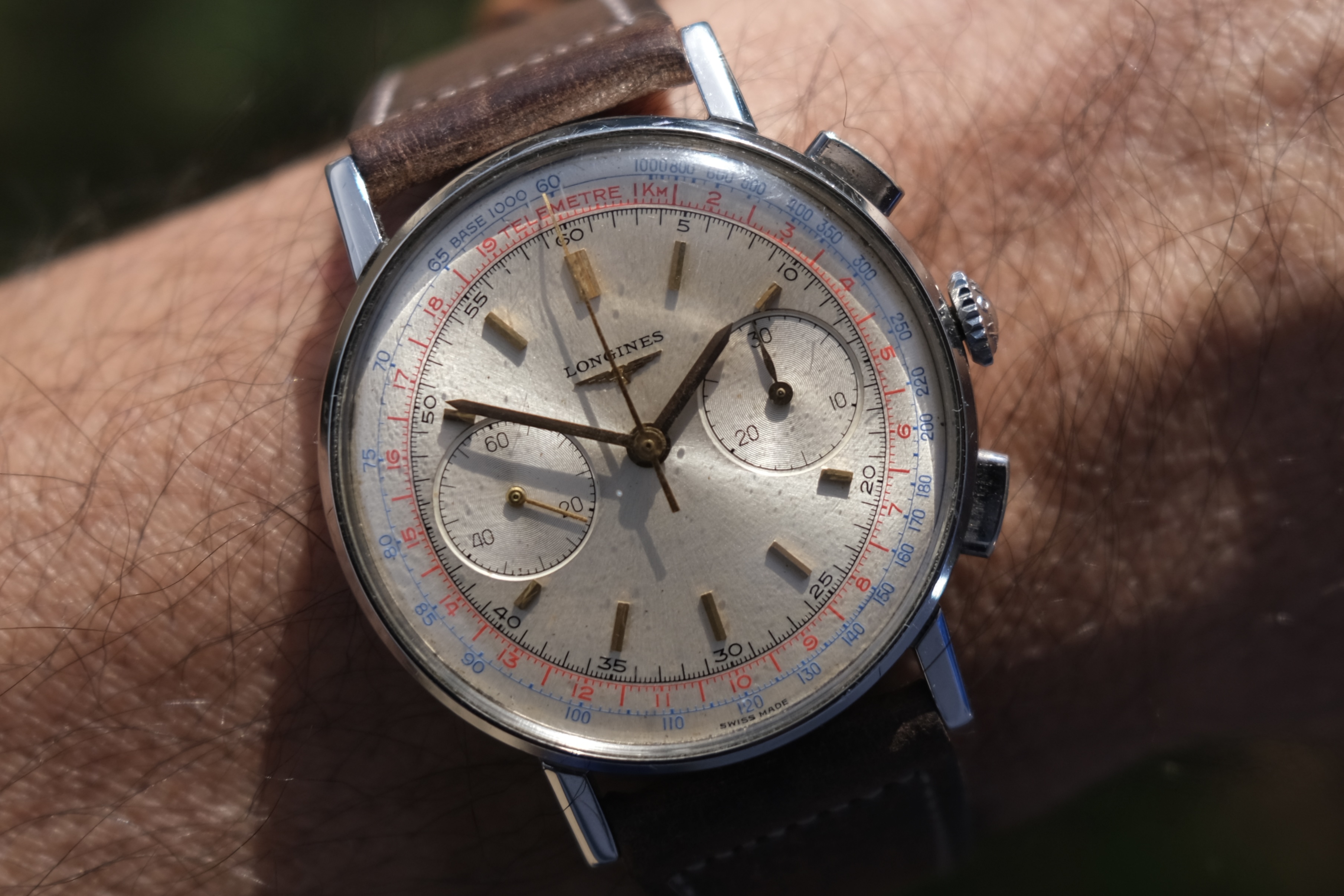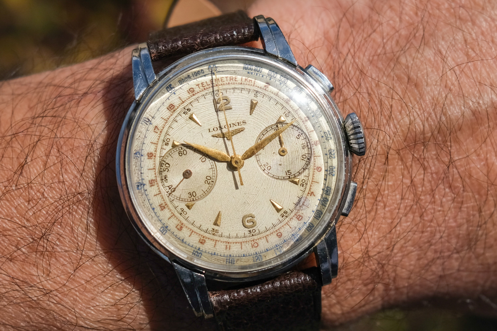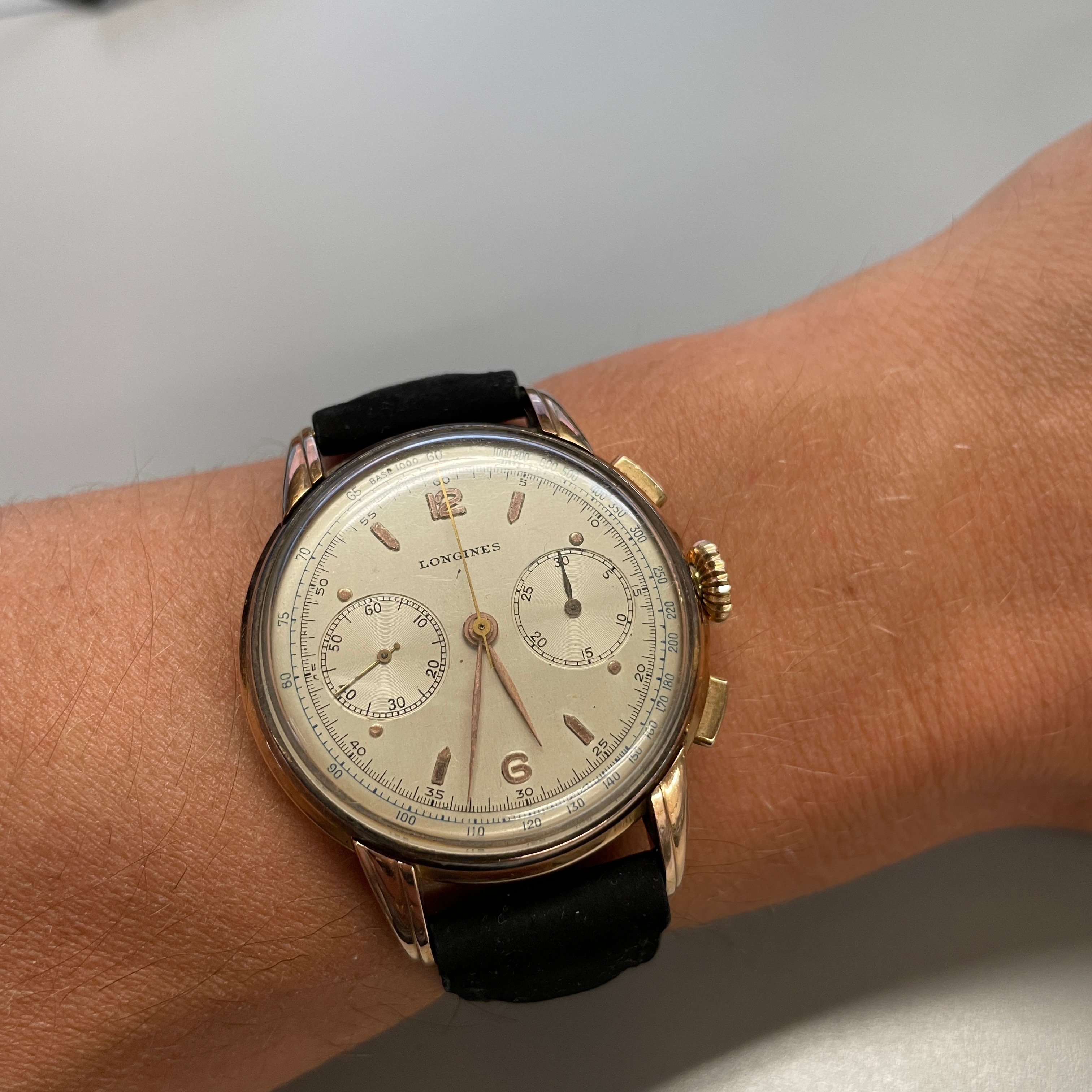 From 1929. White gold filled Canadian made case, white vitreous enamel dial, original hands, period correct expansion bracelet. This one was buried in a drawer for about 50 years, along with dozens of scrap watches, donor watches, and future prospects, until I acquired a replacement movement. My only Longines.