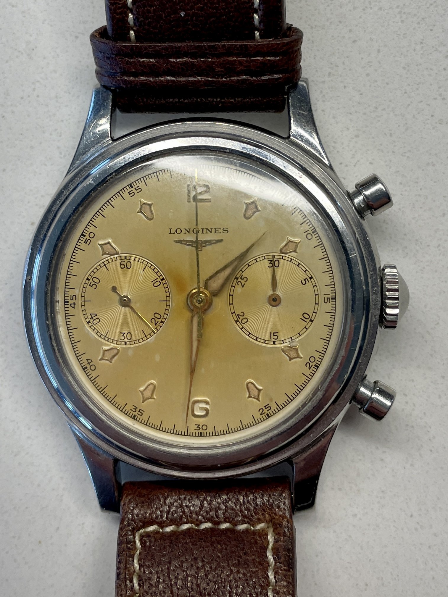 Longines! Ah yes! I have one Longines. I’ve owned the carcass of a distressed Longines for close to 50 years. Too far gone to do anything with until the stars aligned! Before and after. Circa late 1920s, Canadian white gold filled case, vitreous enamel dial that likely originally had radium numerals. (Edited to change CAR to CARCASS, and BILL to DIAL).