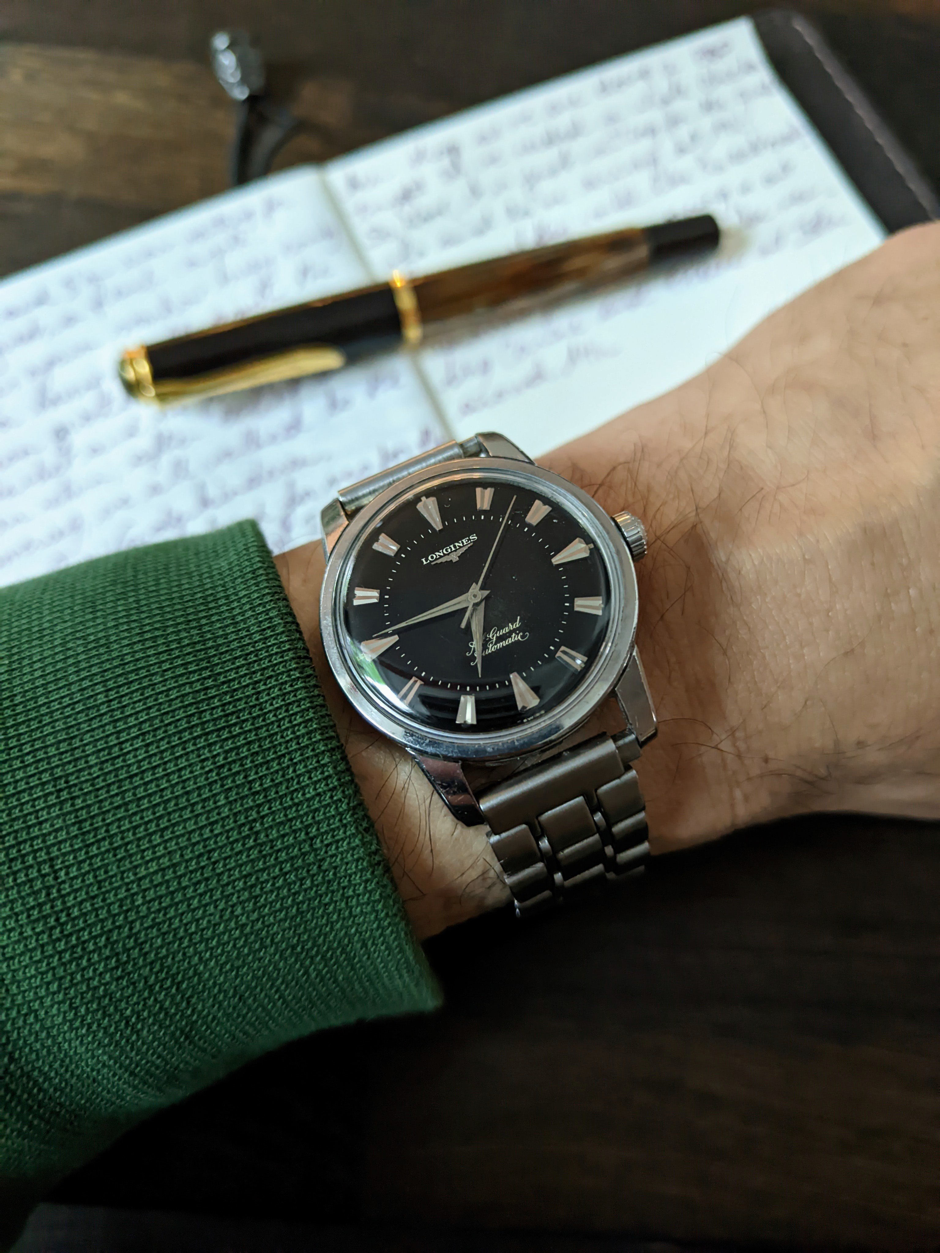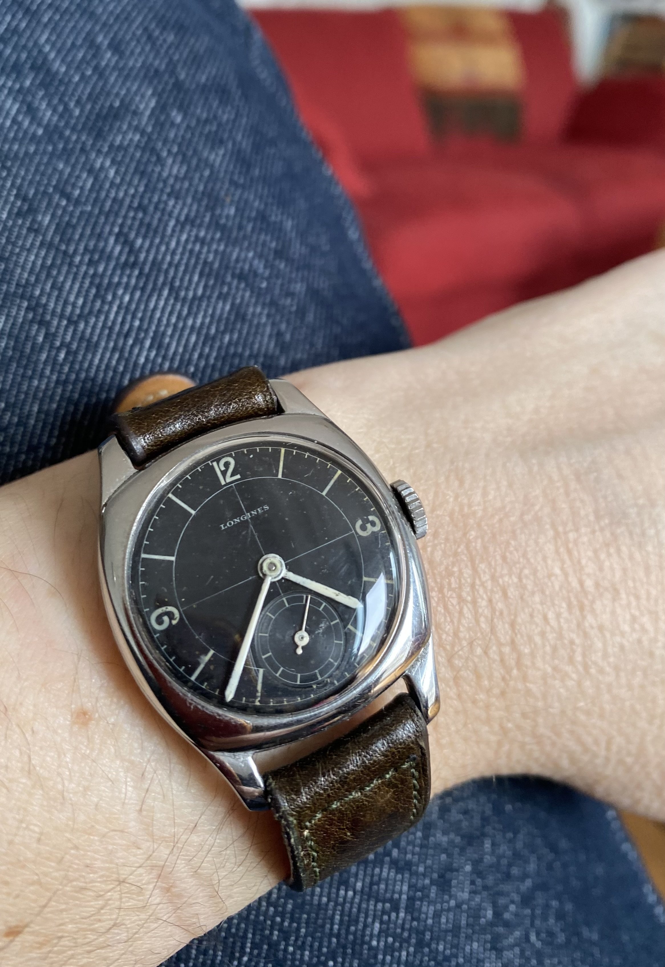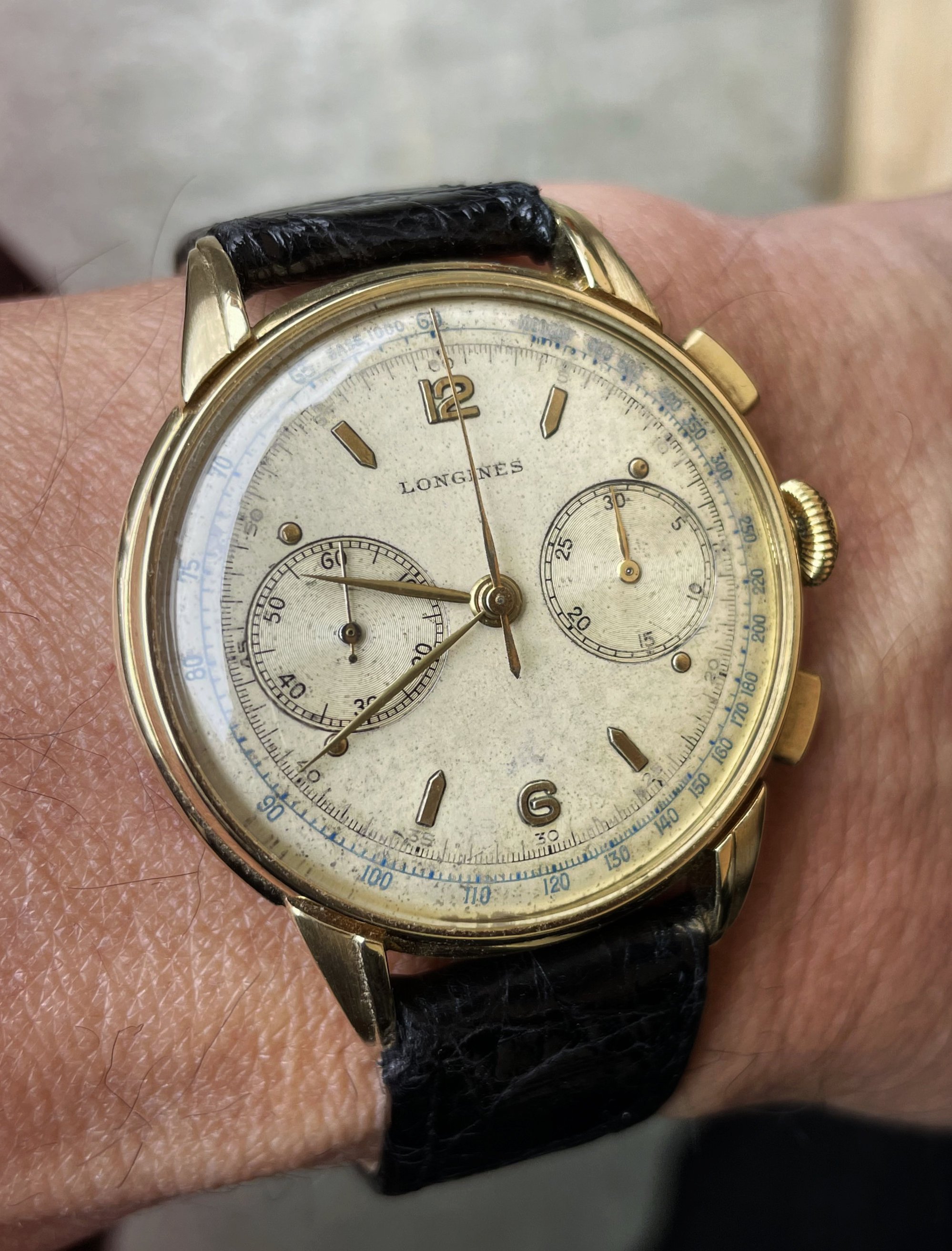 I only own the one on the right below but, with apologies to the Longines' true owner, the look of your watch just triggered me into posting this photo. The case style was not that enduring and didn't always work, but at its extravagant best this is what you got!