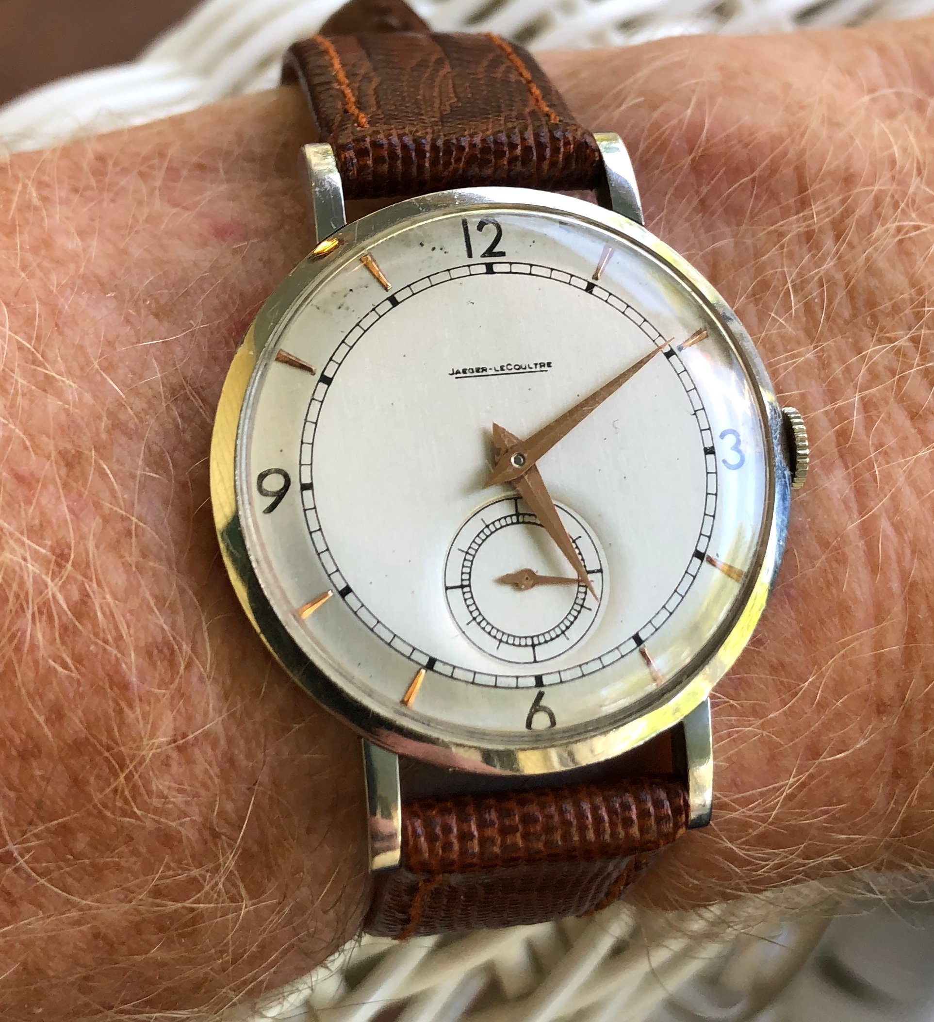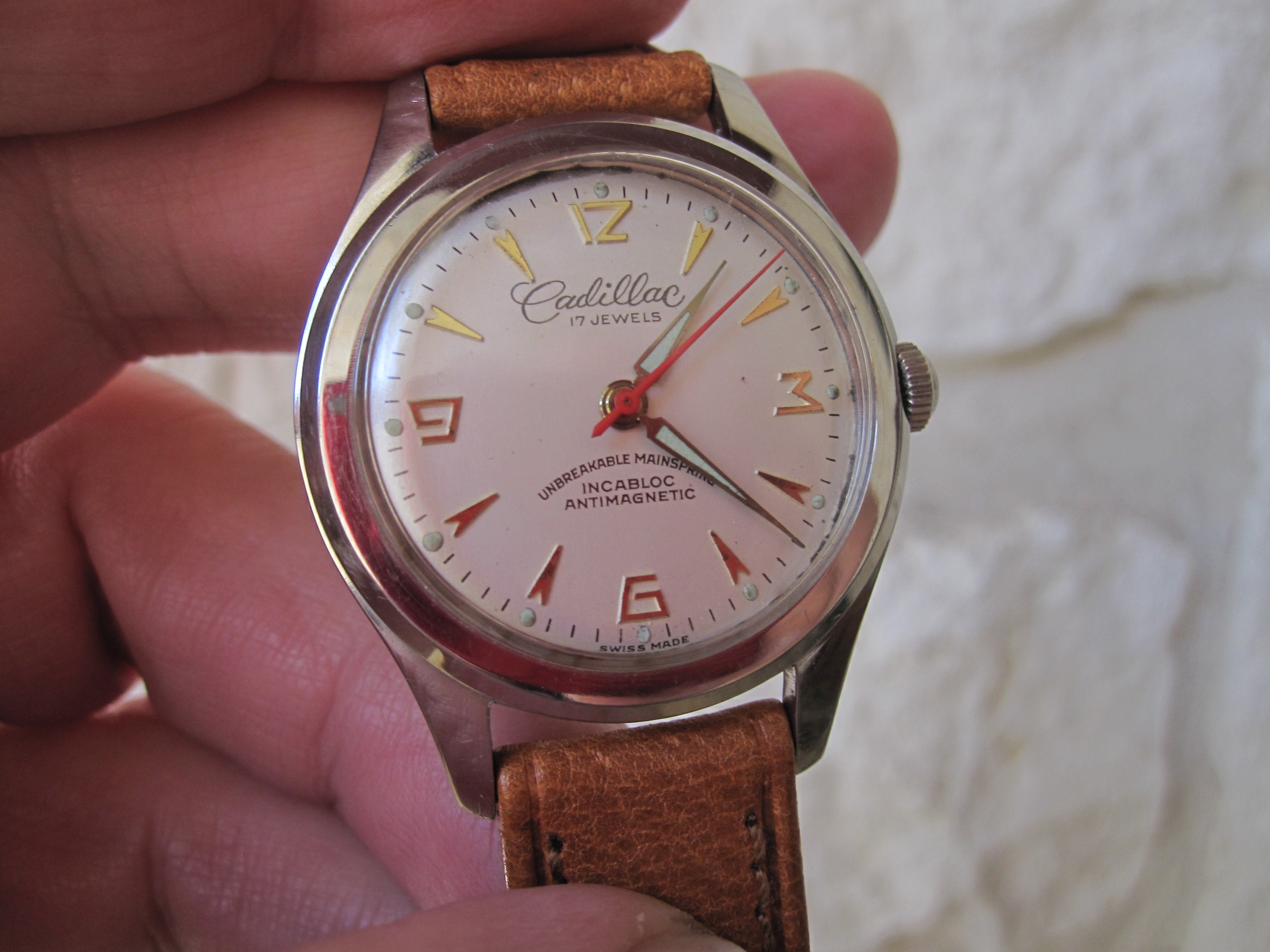 ·My grandmother walked me down to a small Wisconsin jewelry store in 1958 to buy me my first watch as I was seven years old and it was time for me to get a watch, so said my dad and grandmother. We walked back home and my dad asked to see my new watch. "This watch won't do, it's made in France, it has to be a Swiss Made watch", he said. We didn't know any better, so we walked back downtown and exchanged it for a 'proper' watch. It was $3 more than the first watch, for a total of $17. But I was the proud owner of a 17 jewel 'Cadillac' watch with modern, for the 50's, styling. Stainless steel case, screw back, it was a nice watch. Wore that watch until about 1972. During countless moves, foreign and domestic, I never lost track of the watch. I last had it cleaned in about 1983, but it still runs fine when I wind it up every few months. It still has the original crystal which I took some Polywatch to a couple of months ago, untouched dial, original hands and crown. Otherwise it sits in my display cabinet in my home office.