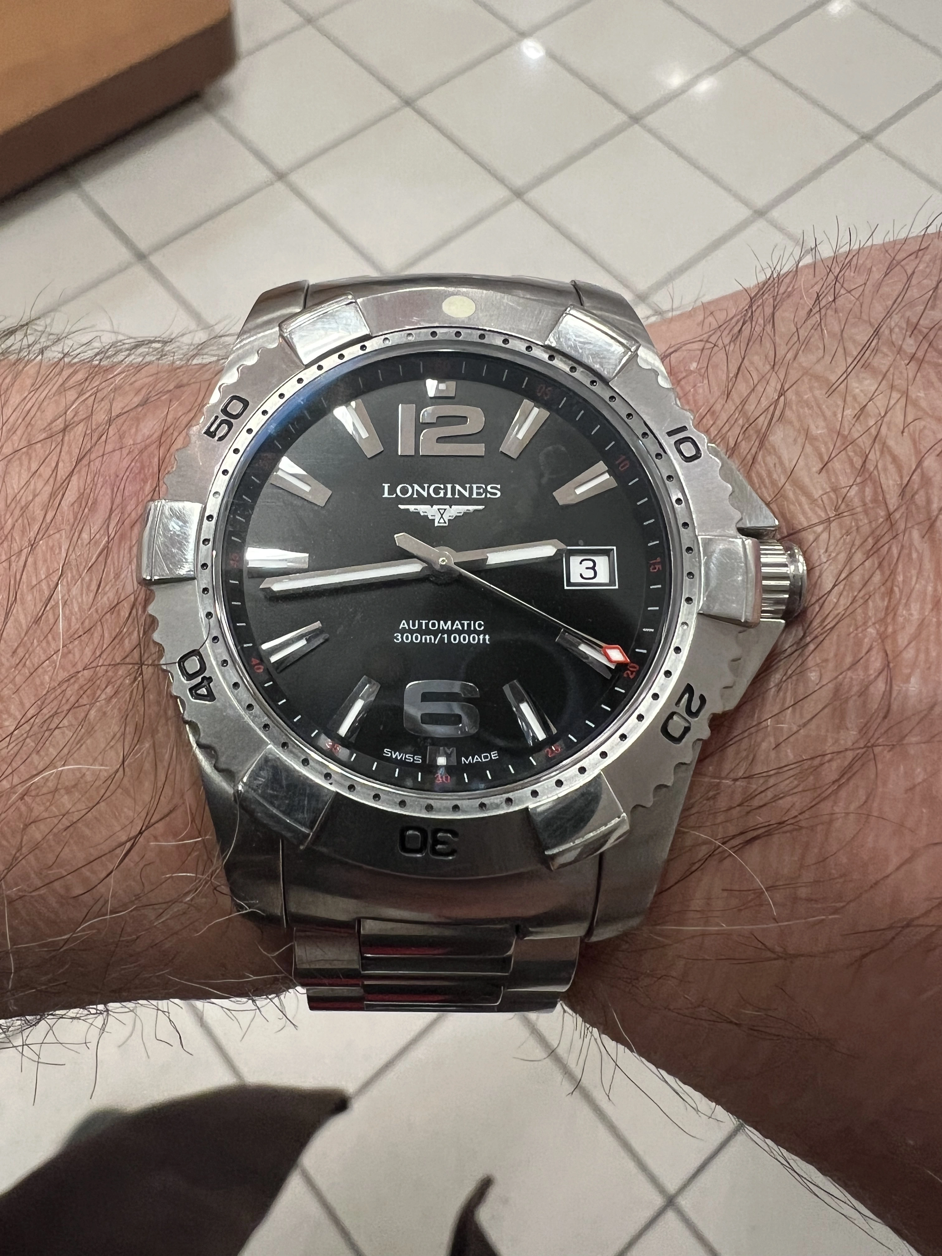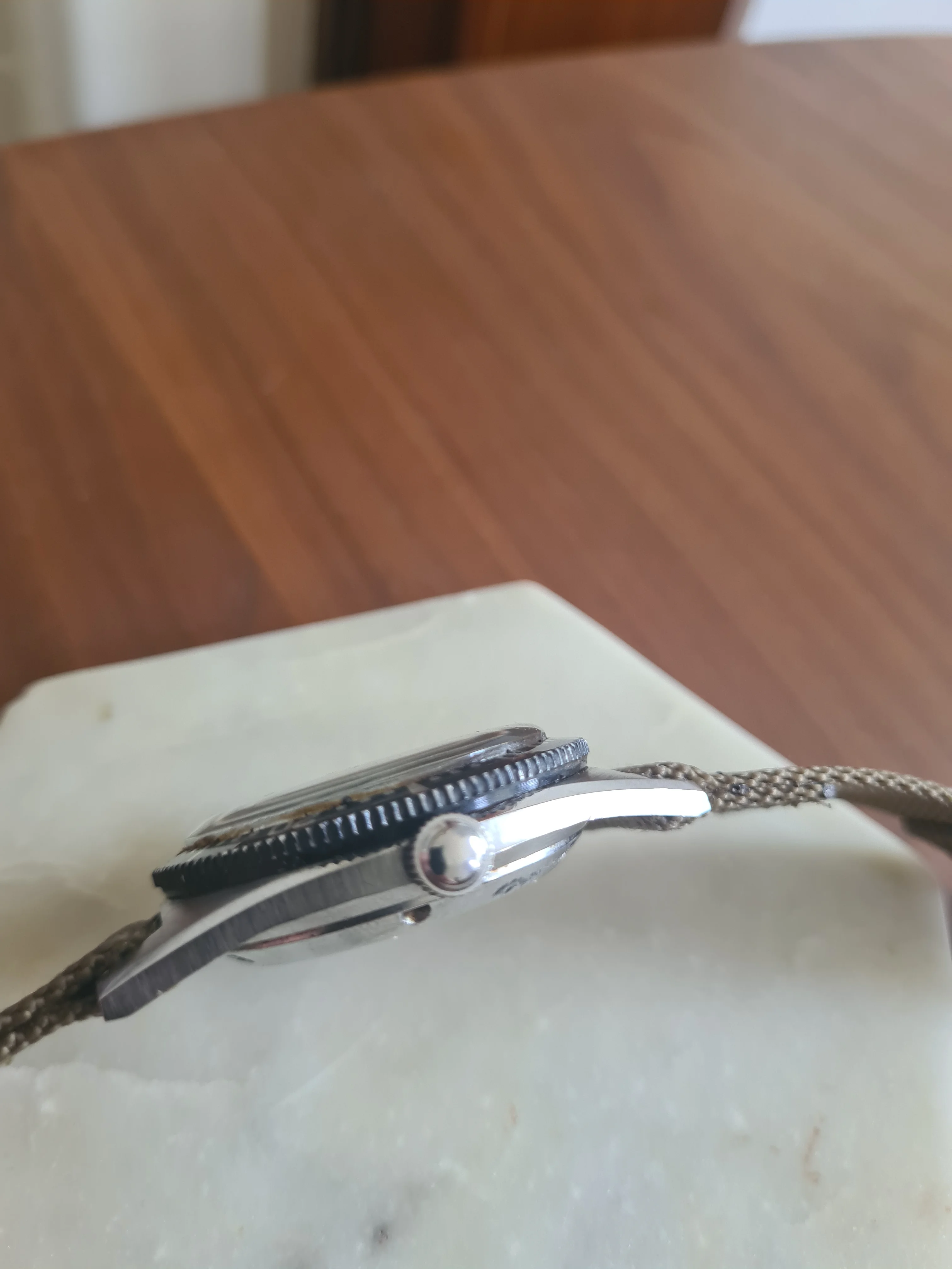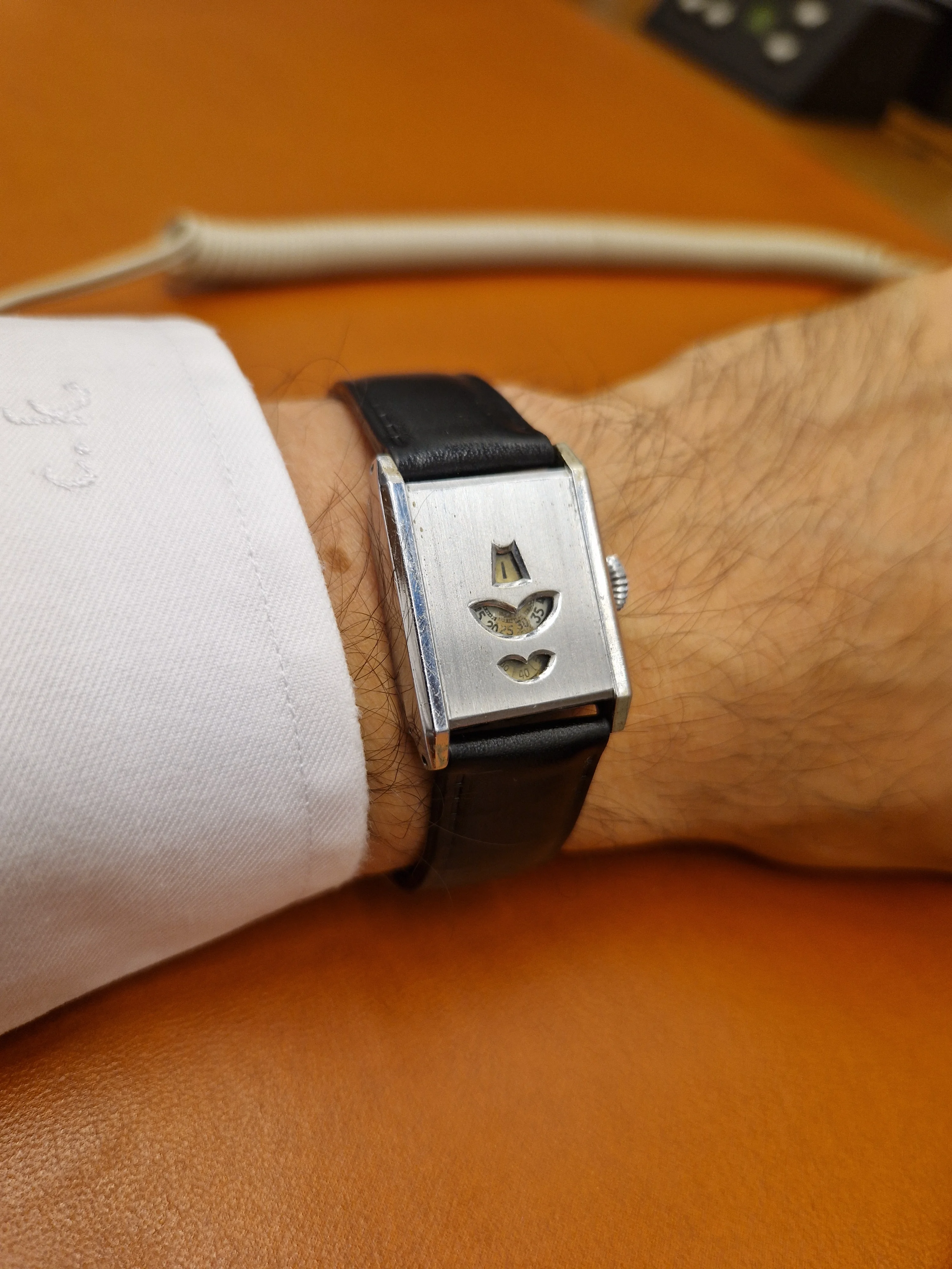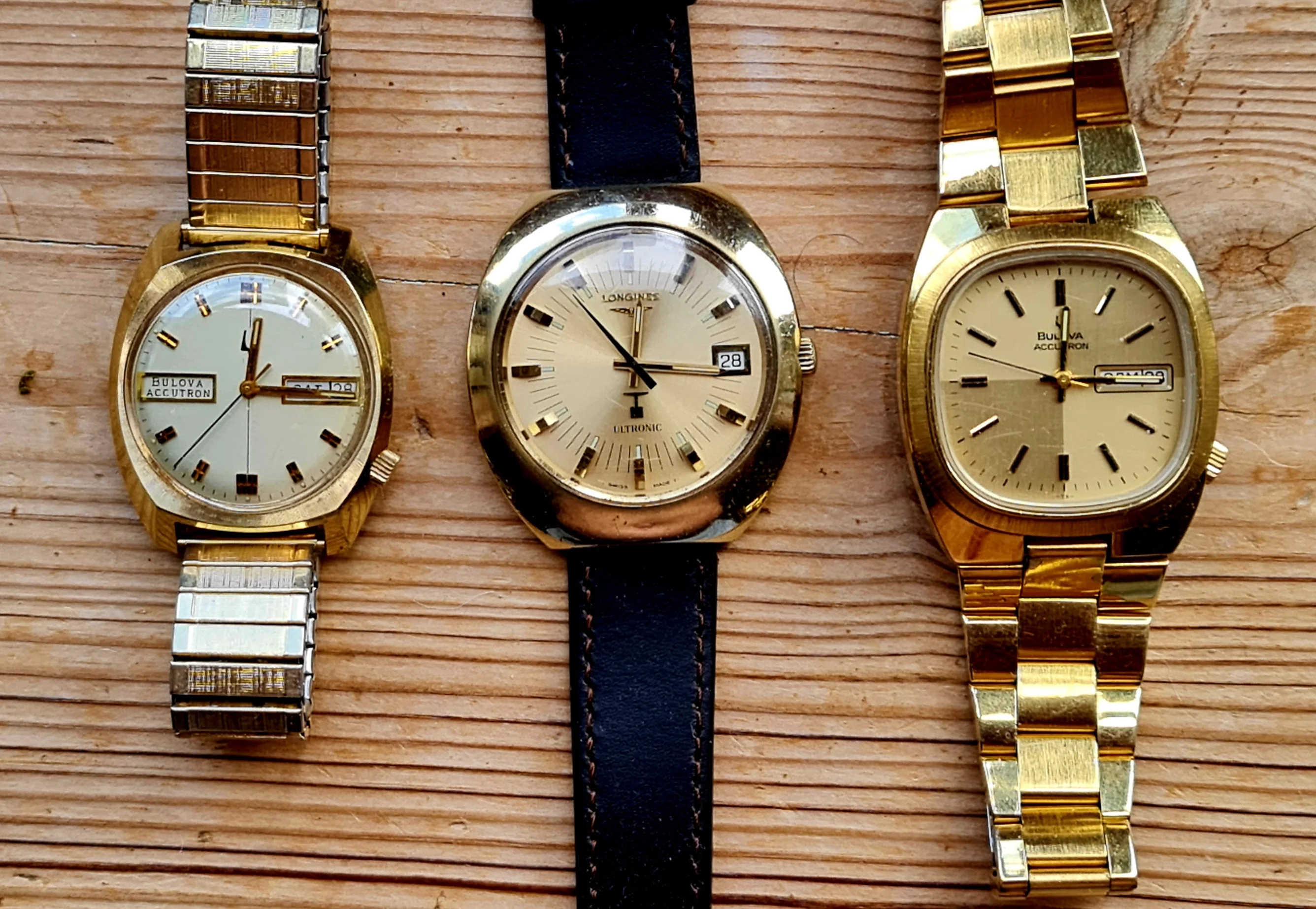Acquired, not working, for $25.00. It was destined for an auction at one point, but I gave the auction house a standing offer, and if it didn’t sell, I would be good for it. I took a bit of a chance on this Eterna Sonic, hoping I could resuscitate it. The circuit appeared to be okay, so I figured that cleaning it would do the trick. It has been a long time since I last encountered a watch that was so stuck together as this one was. But cleaning it did the trick. The crystal was poor, so I hoped I’d be able to find a replacement. I did! It was $90.00 (ouch), but the watch deserved it. I love the colour of the dial (taupe), and it is an excellent performer. The date is incorrect, but it is not on my wrist today. The tuning fork movement is a calibre ETA 9162, otherwise call F 300. Same movement used by Omega, and numerous other makers. (Come to think of it, the last time I paid more than $500 for a watch (Cdn., even) was 36 years ago! Call me a “bottom feeder”).