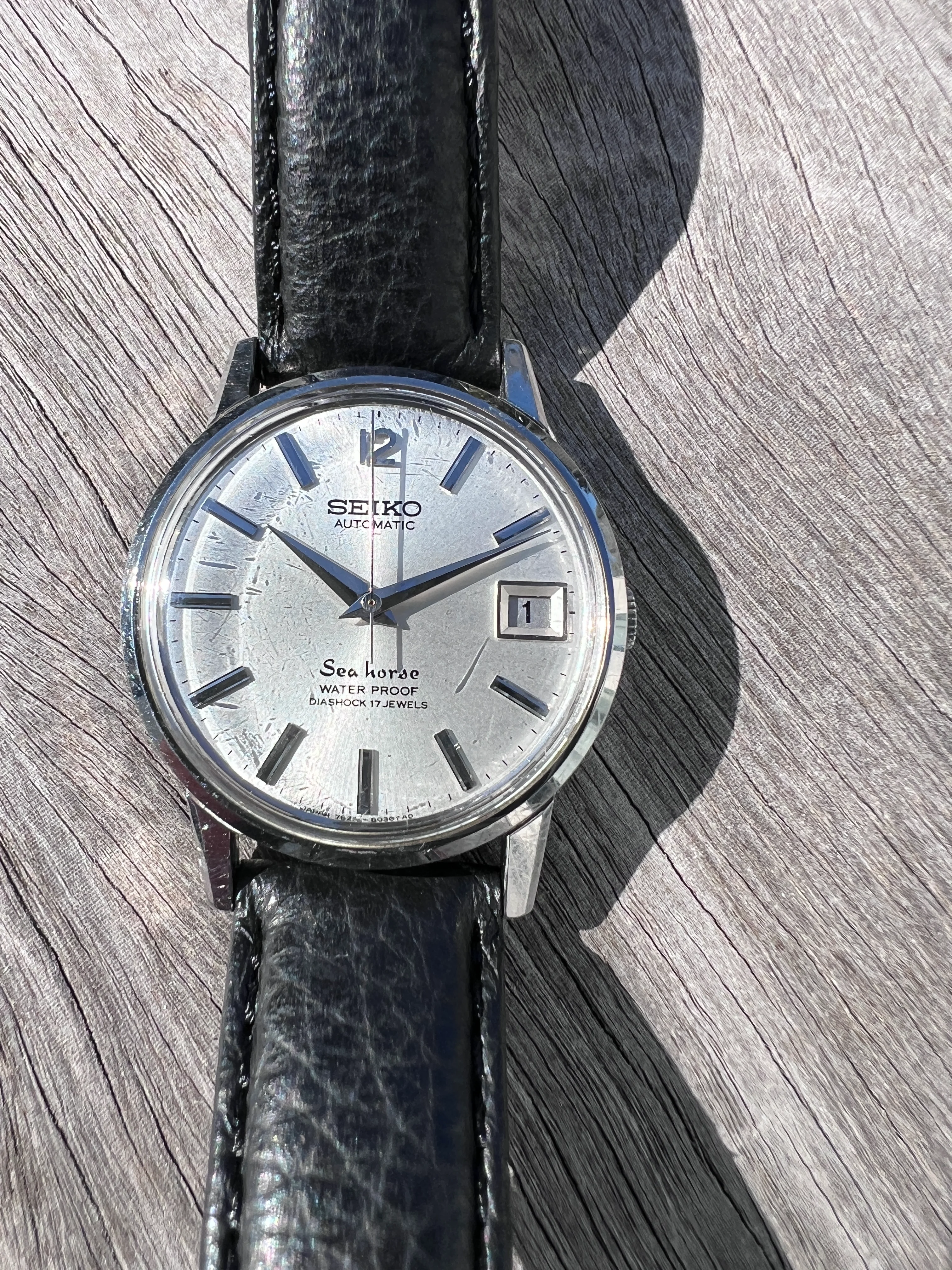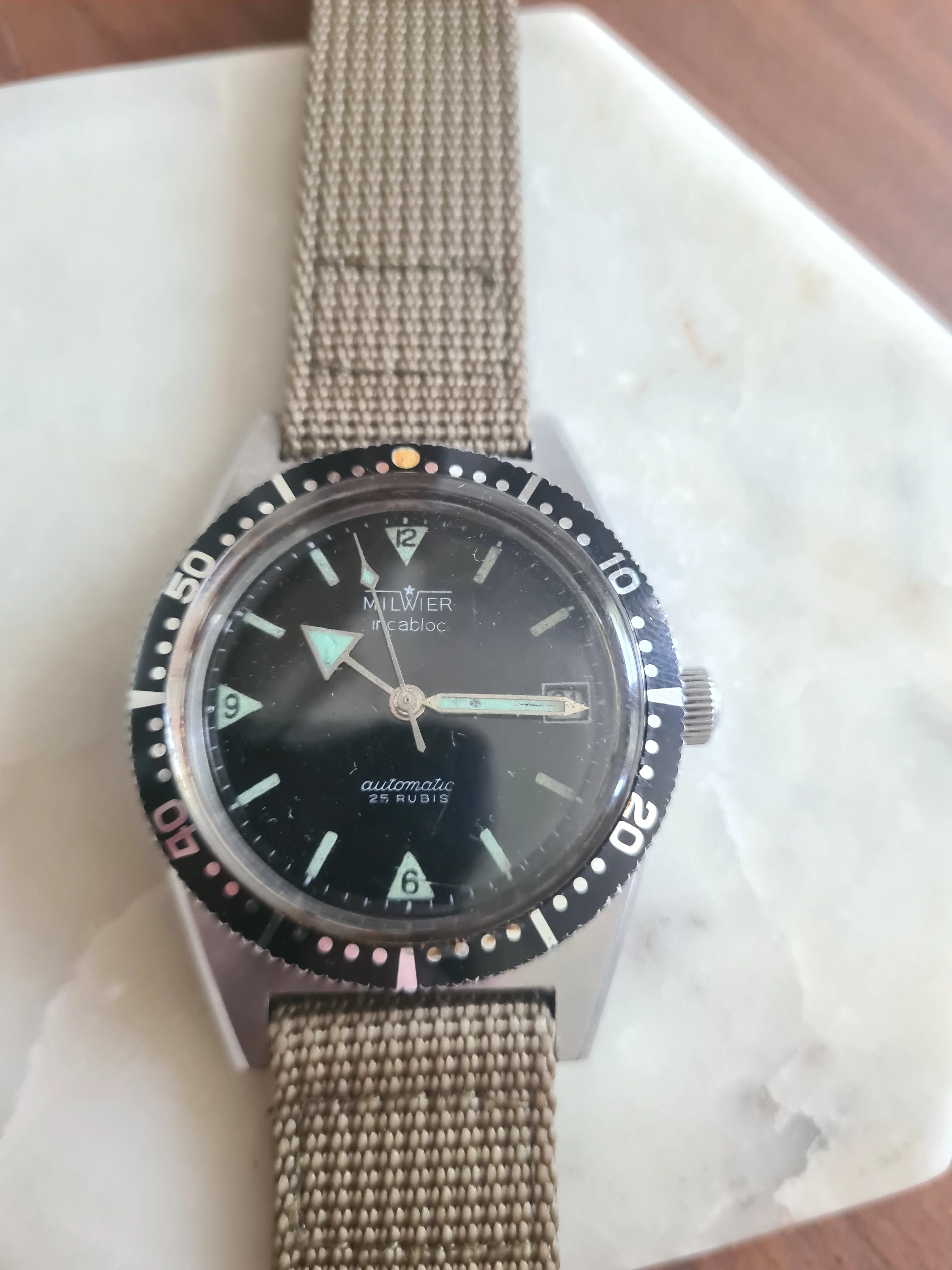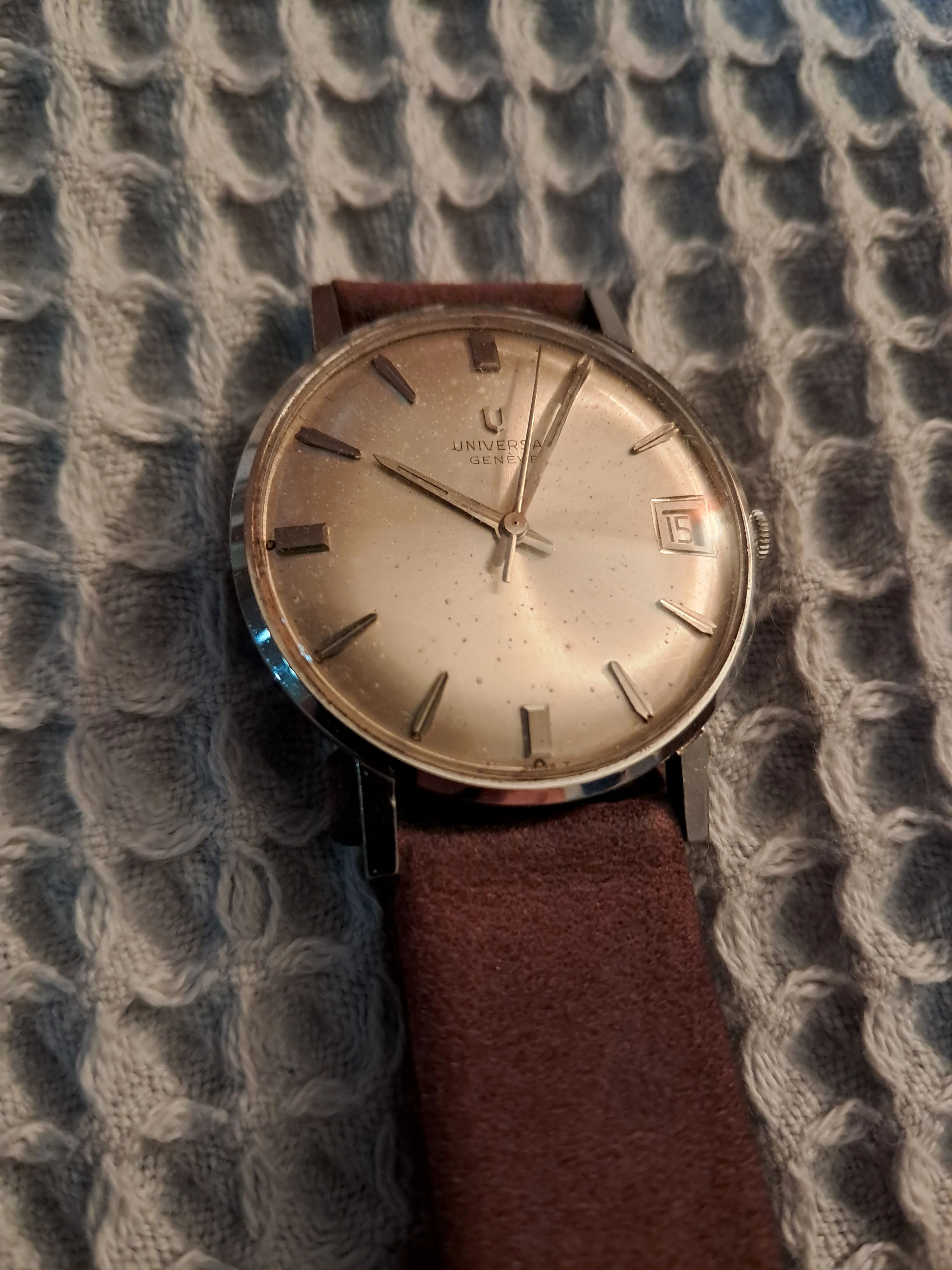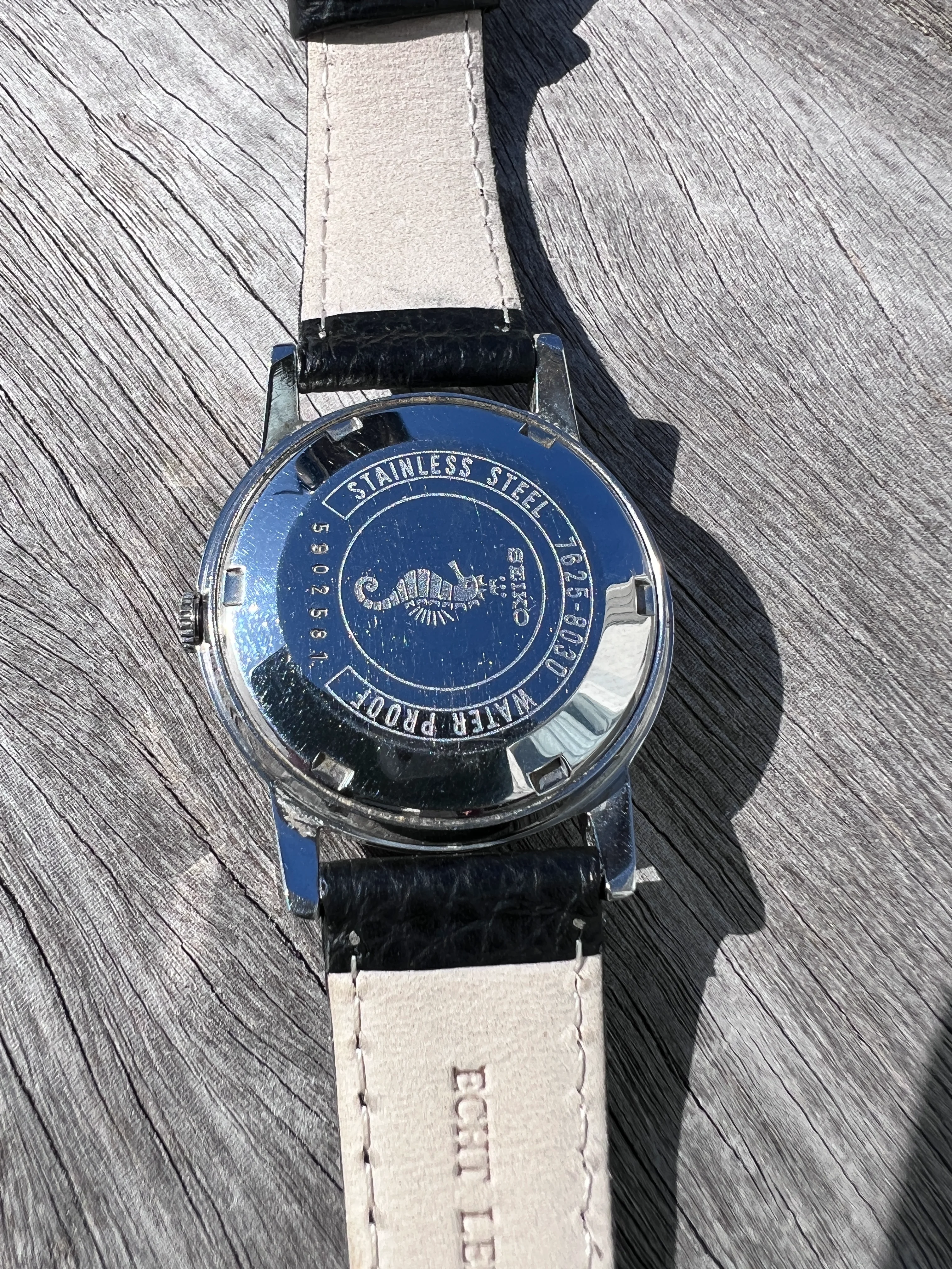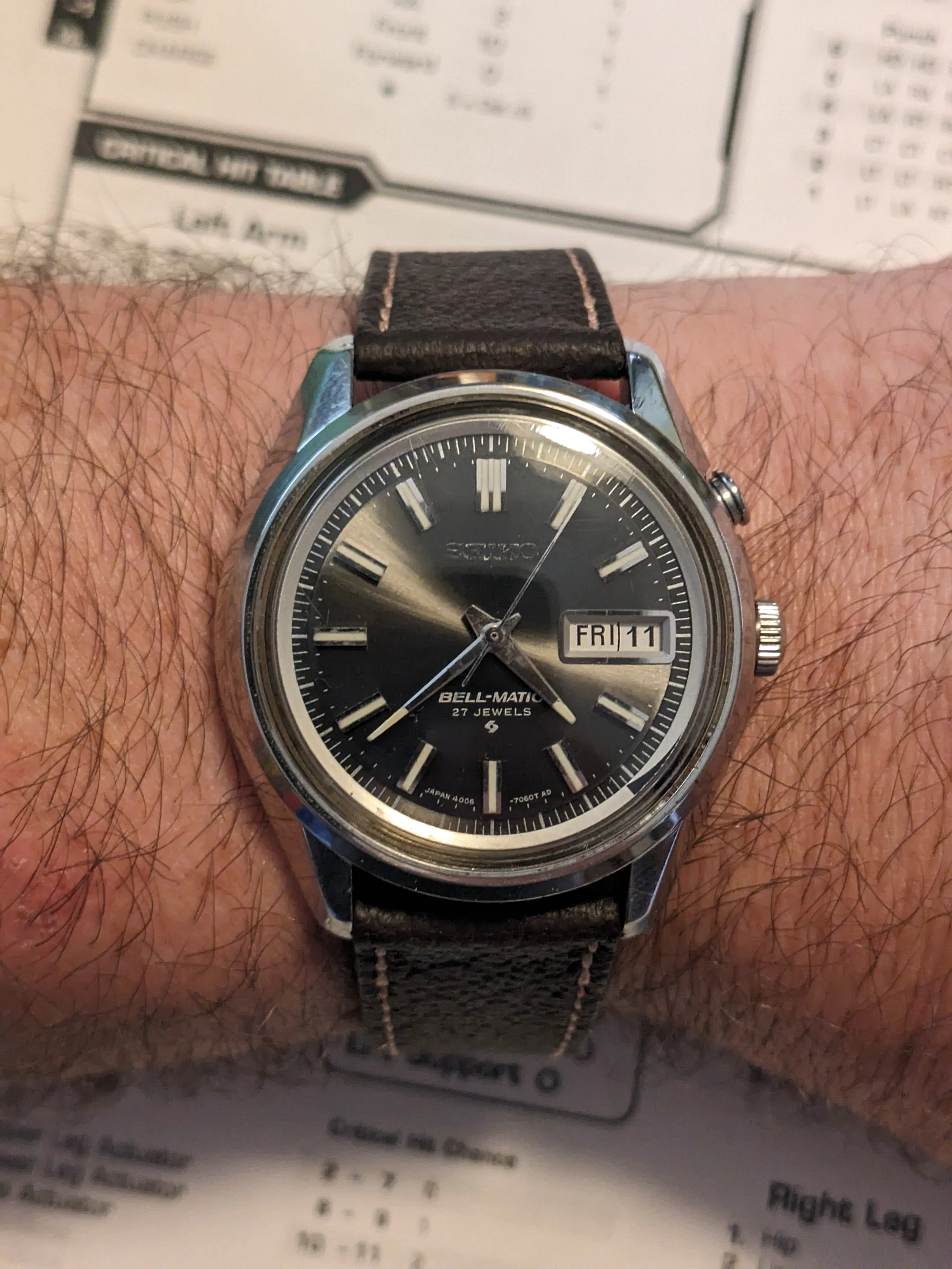 1960s Austin Premier Double Date running on an AS 1885 engine and a Citizen Fujitsubo titanium. The Citizen is destined to be sold. Lovely, light watch that takes these old eyes to long to pick up the time.