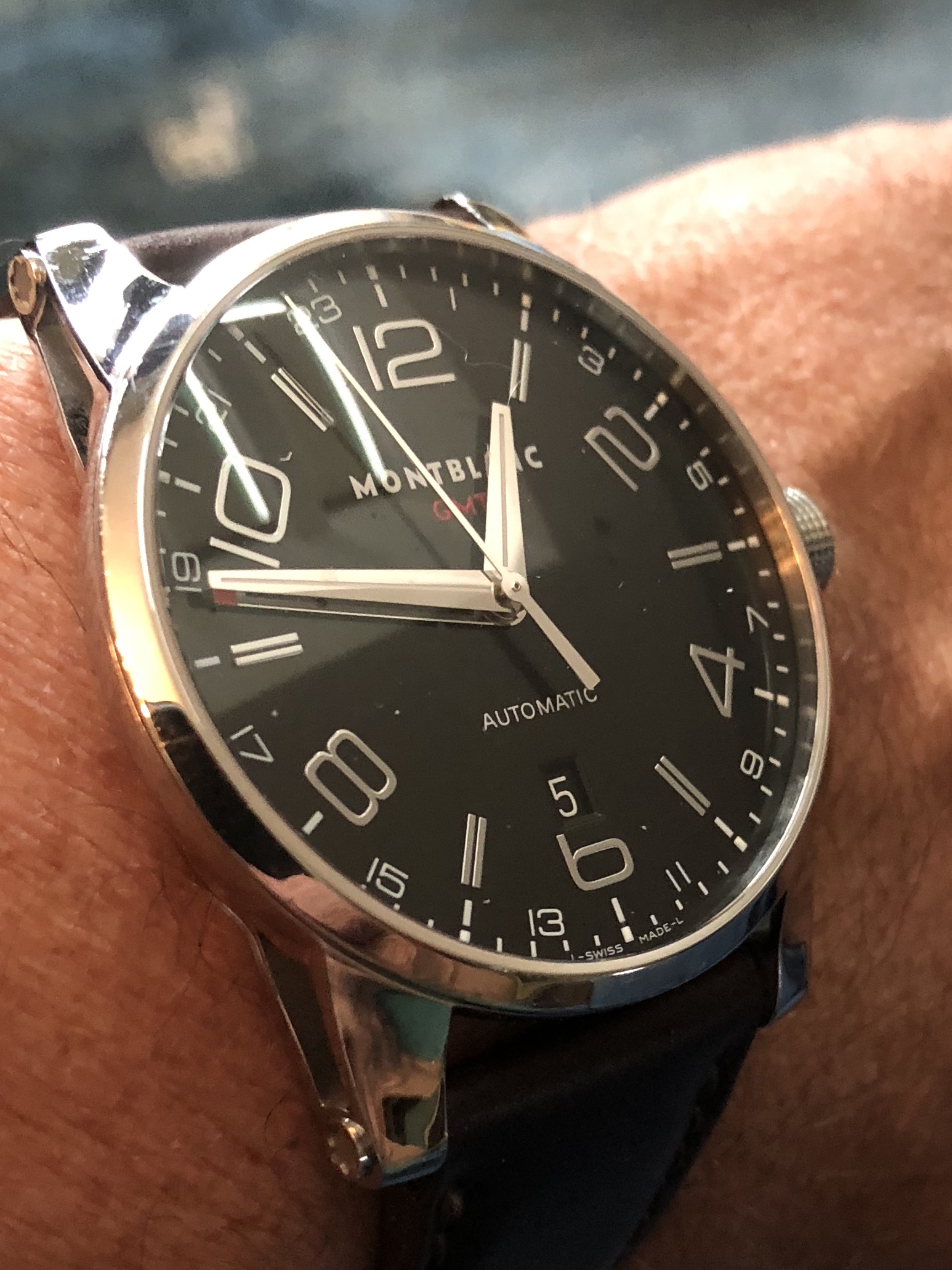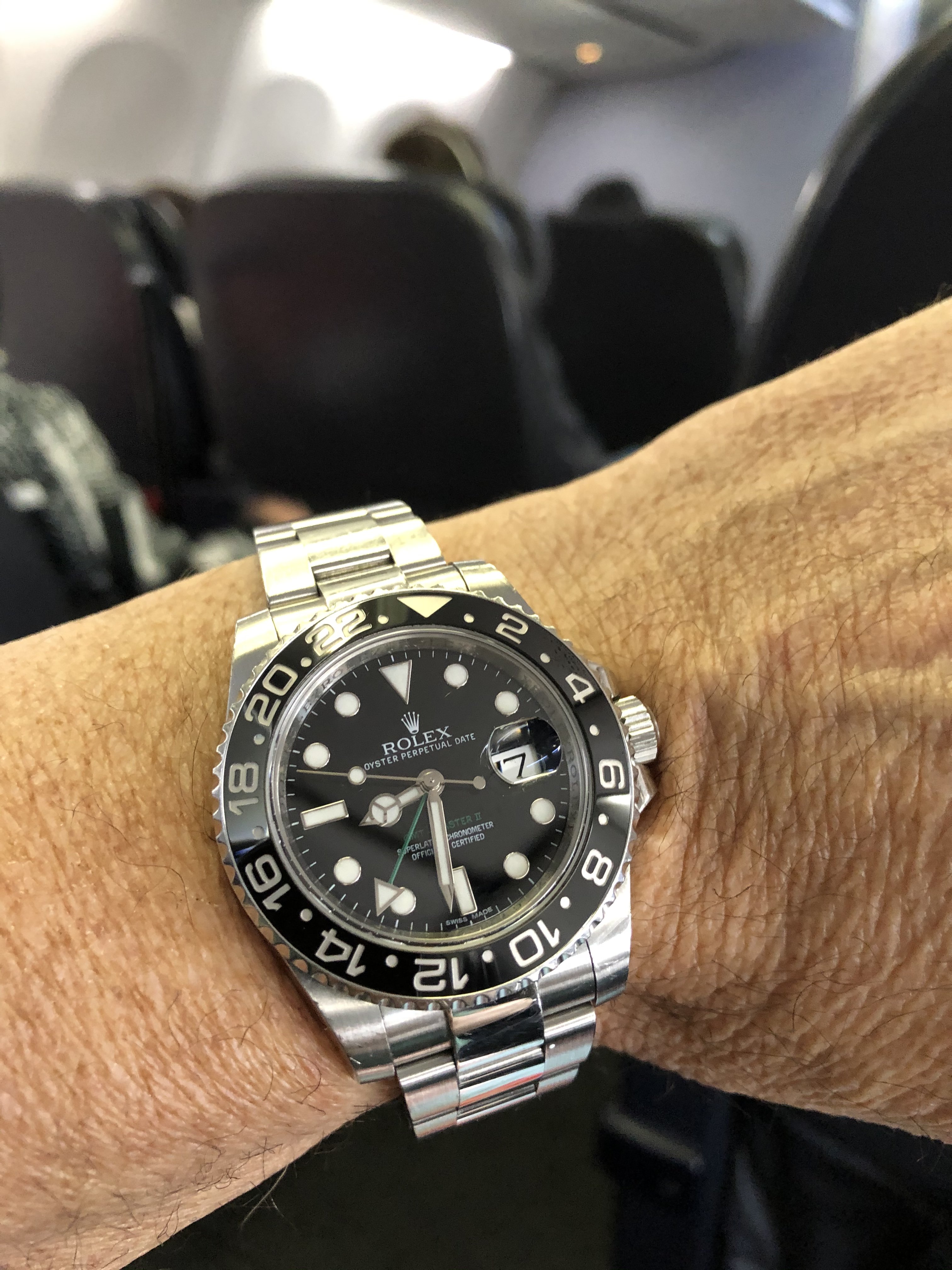 Was on a three week business trip and the battery in my Victorinox Maveric ran out leaving me to rely on my crackberry. Bought this in a boutique. ETA movement and a massive lemon. Still have it because no one wants it. Its not a bad looking piece though. Basically a fashion watch with ETA movement. The GMT Master II quickly followed, long layover in Frankfurt, Wempe, because the MB was unreliable. Things mushroomed from there. JLC/RGM and then Vintage with my 2998-6.