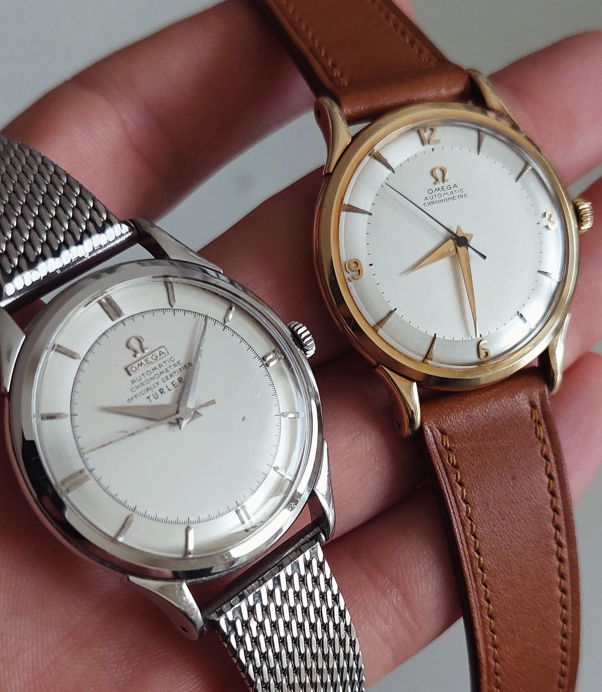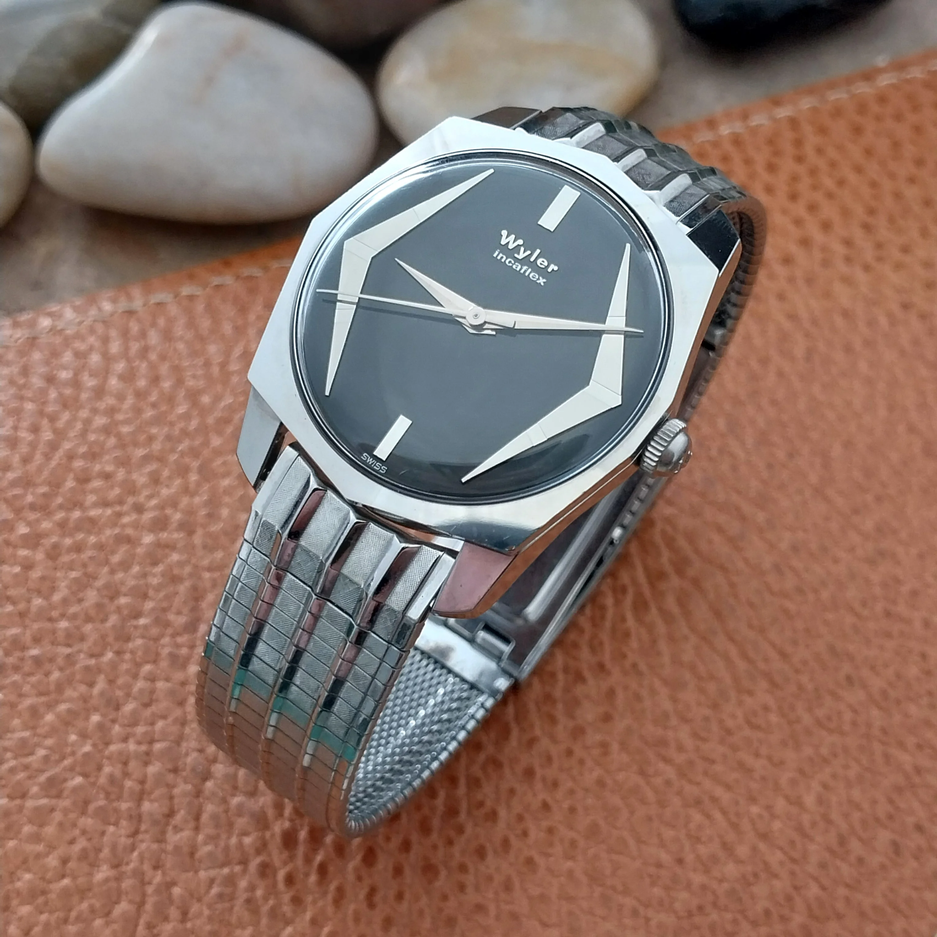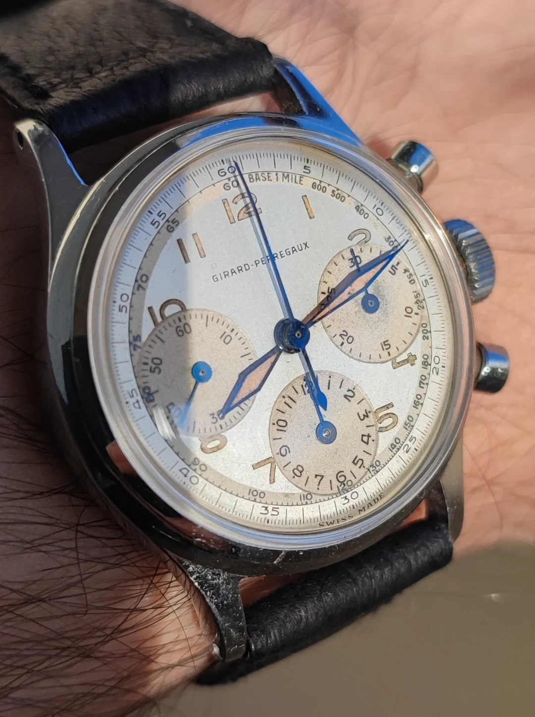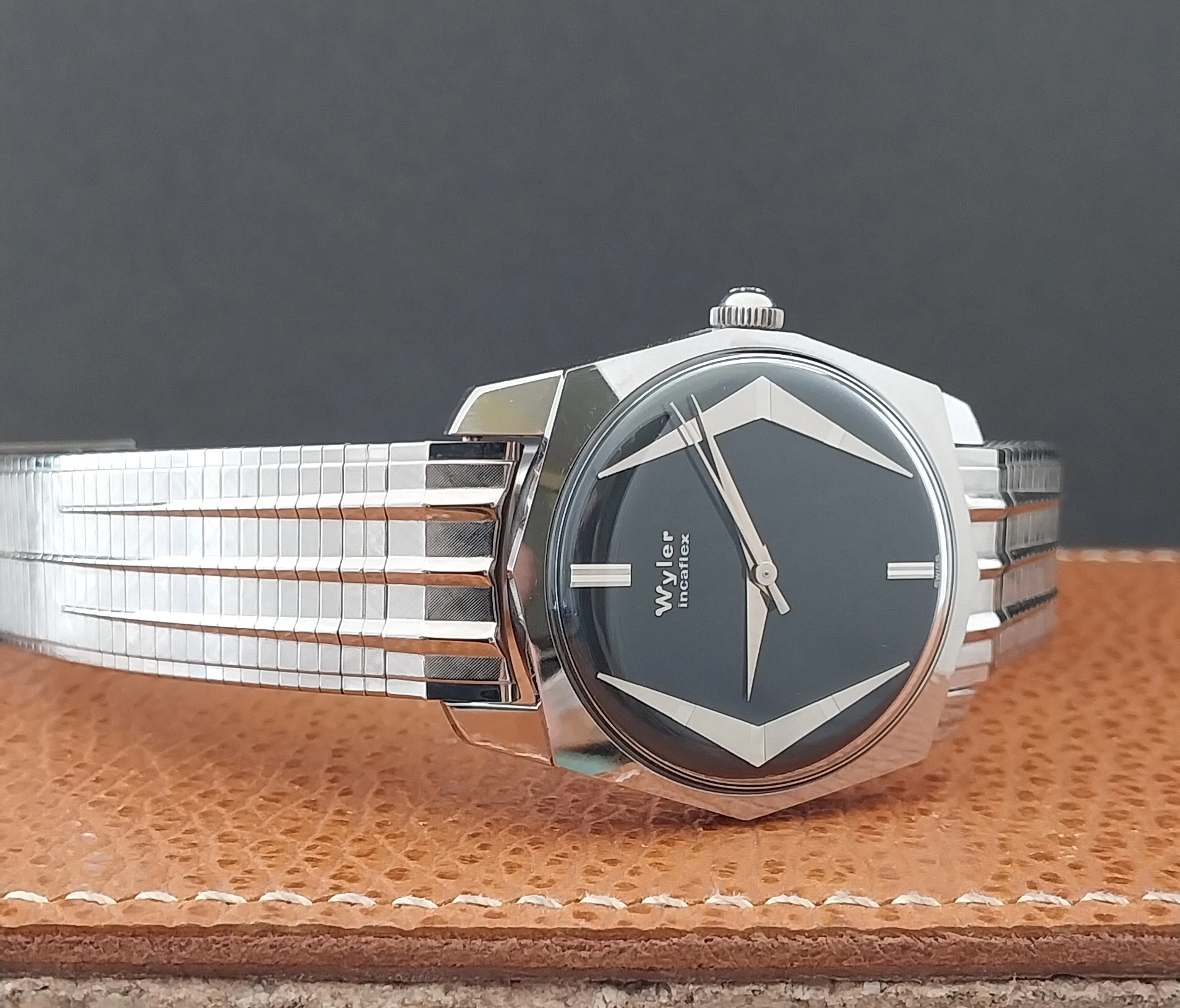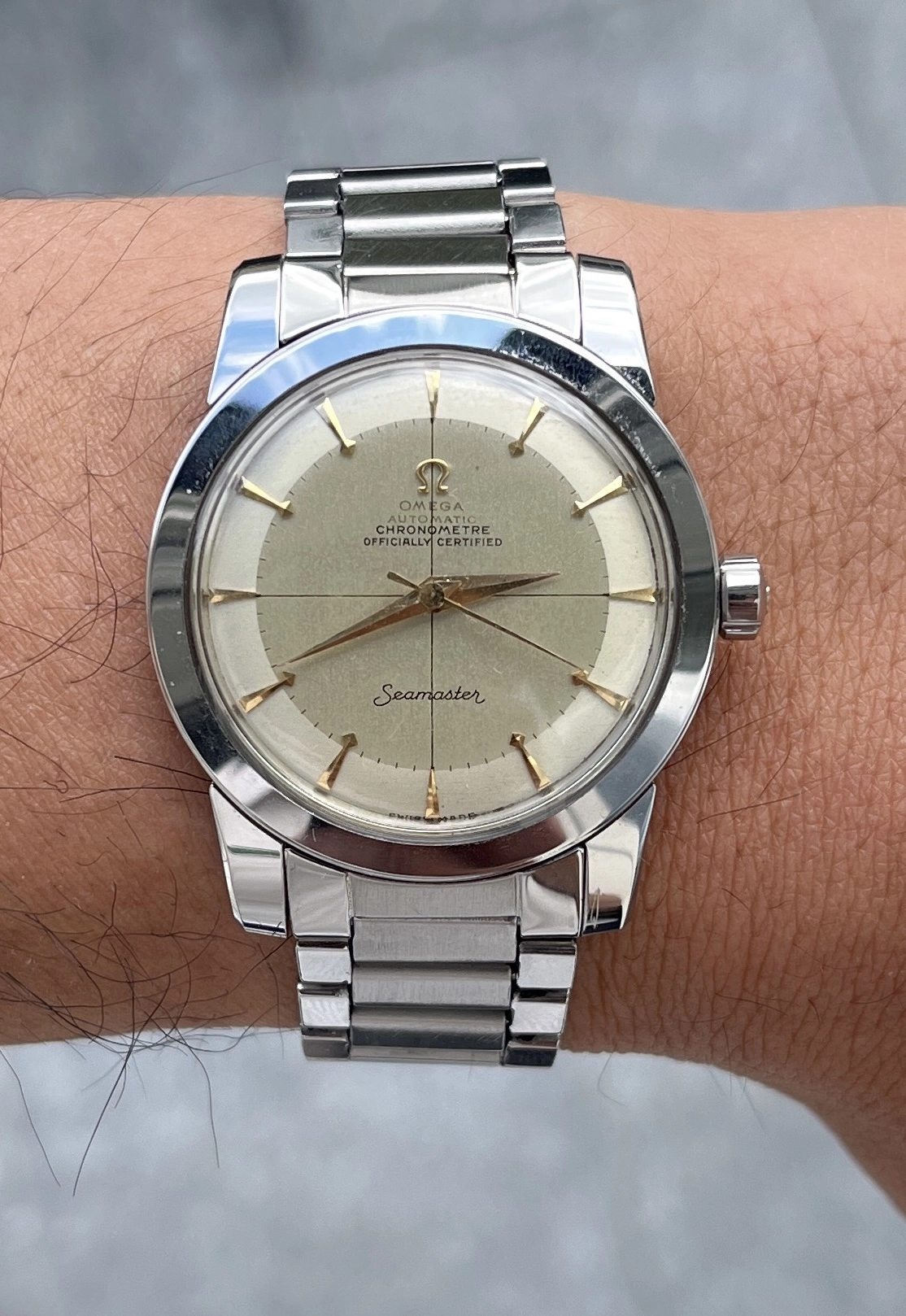 @MtV for honoring my dibs on this nice chronometre rated 2577 with non-lume dial and funky "shooting star" indices. The 352 movement is a bonus. The case appears unpolished so I had to pair it with my best flat link bracelet in my collection.