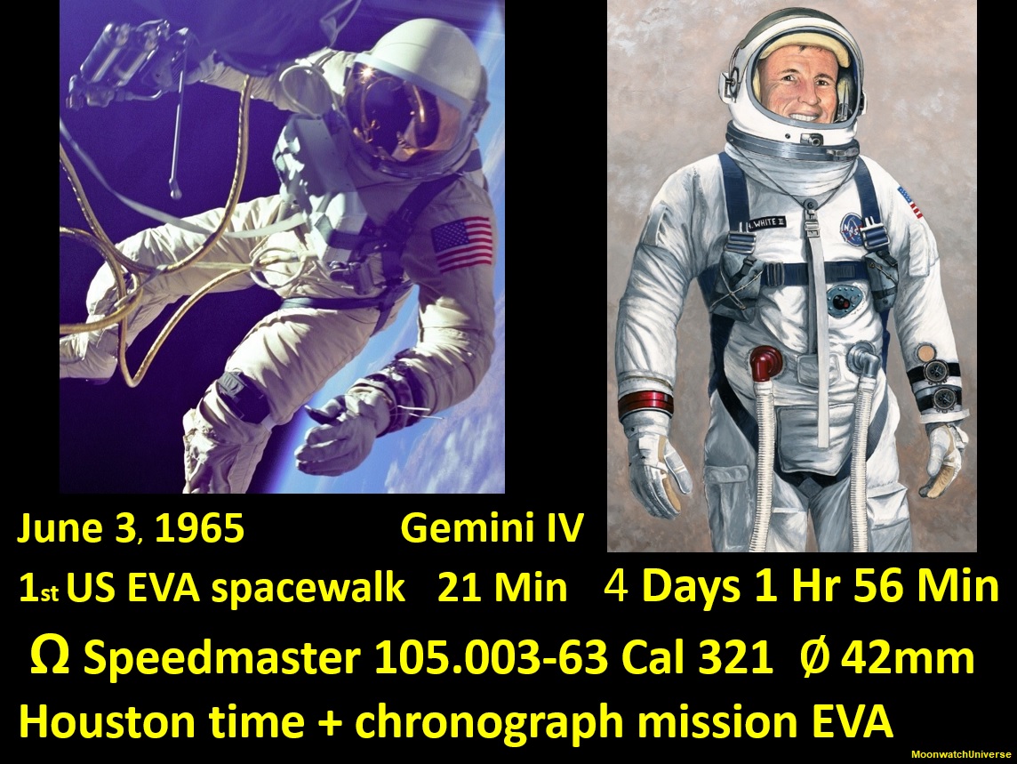 couple of weeks after the Gemini IV mission, June 7 to June 20, astronaut Edward White was seen wearing his NASA-issued Omega Speedmaster 105.003 on a