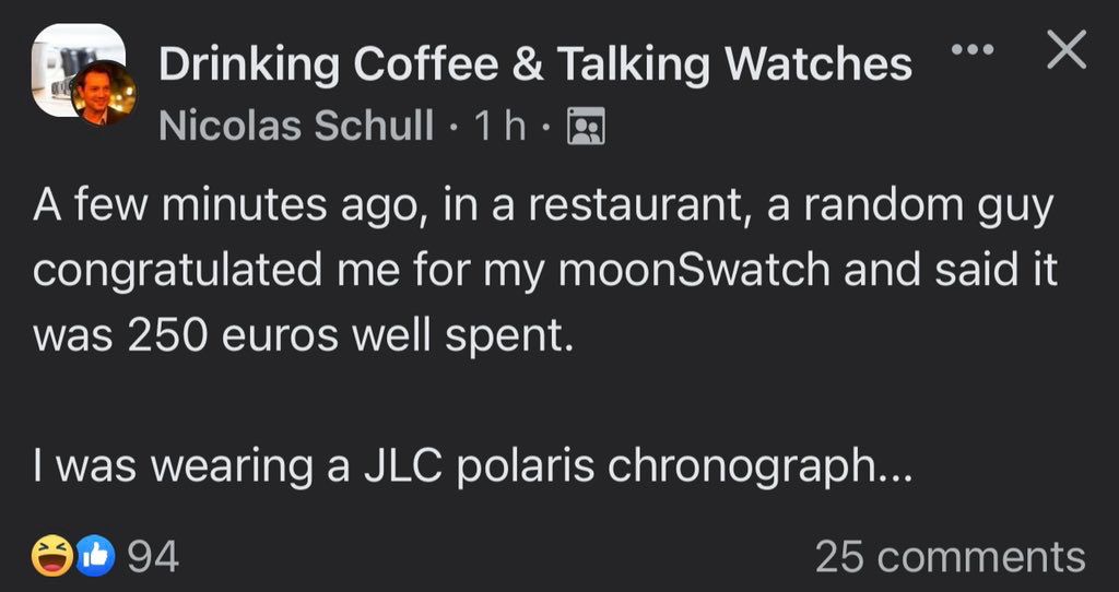 I think one simple thing would have made this move palatable for just about everyone...making exactly the same watch, but leaving the Omega name and logo off of the watch completely. It could say "MoonSwatch Speedy" for example with everything else identical and it becomes an instant cult classic Swatch. The Speedmaster configuration is so instantly recognizable that diluting the Omega brand power with their labeling on a Swatch seems not only unnecessary, but perhaps even a major marketing blunder. I own a half dozen Omegas, including a reduced, and I have enjoyed the slow but obvious regaining of status that Omega gifted to Rolex with the introduction of the Cal 1000's in the 70's. Having the Greek Omega symbol on a dial now seems somehow less relevant. If Omega wants to do something spectacular to make up for this misstep they could always reissue the Cal. 551 with modern hi-beat timing. It was a hit with the 321. I could not think of anything better than a vintage homage Seamaster in a 39mm case, with an exhibition back displaying the pinkish gold looking mechanicals of this iconic movement----from an era that Omega was generally considered preferable to a Rolex. Very little development cost, so sell it for $2200, and sit back and enjoy years long waiting lists of enthusiasts trying to get their wrists wrapped by one. Instant classic. Much better way to garner raves from the masses than conning them into a gimmicky quartz watch with allusions to being an actual Omega. These might be selling on ebay for a $100 a year from now. Swatch could react quickly and take the misleading name off the dial, and make that first run of "SwatchMasters" an oddity that actually does become a collector item. In my humble opinion
