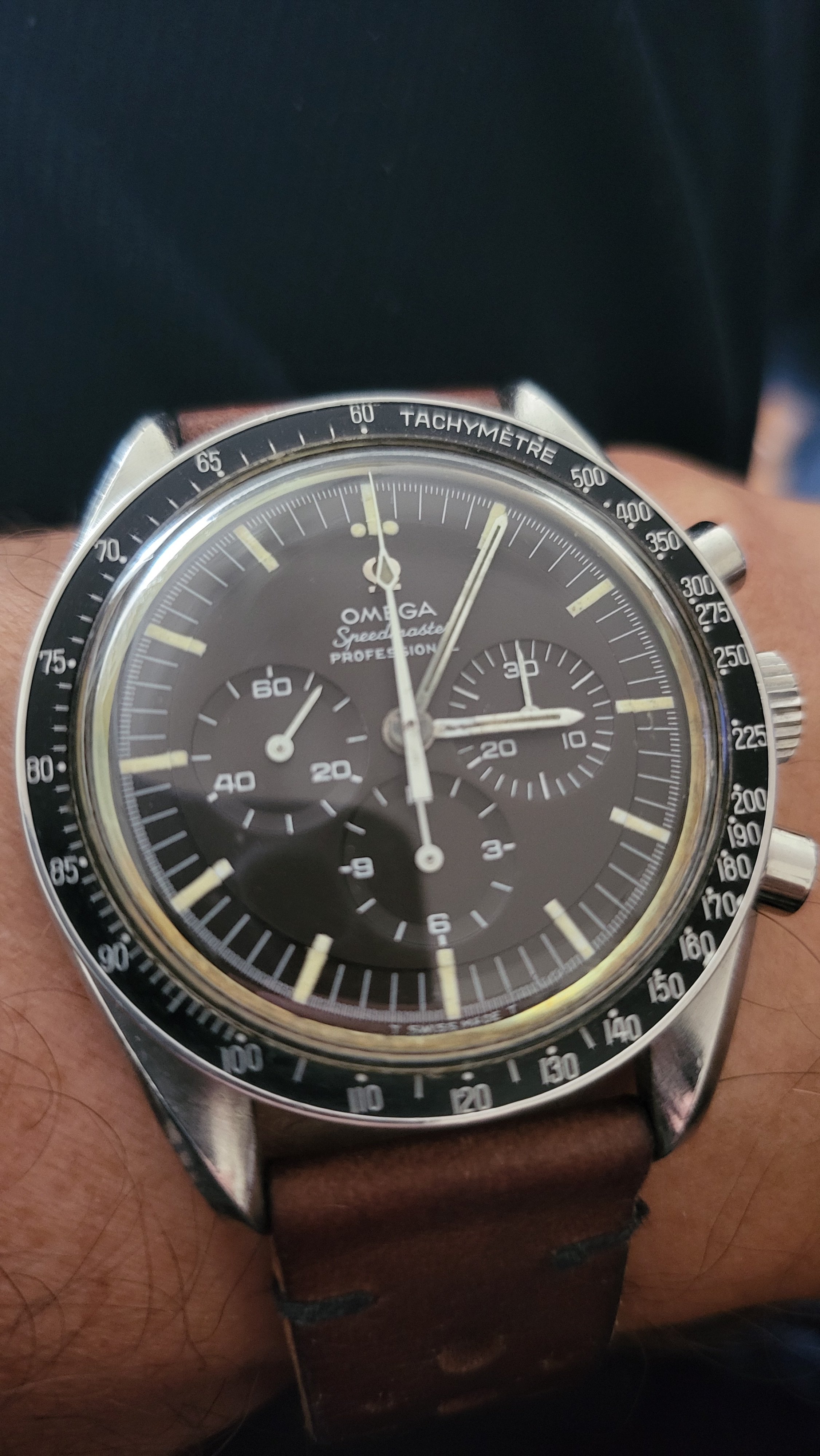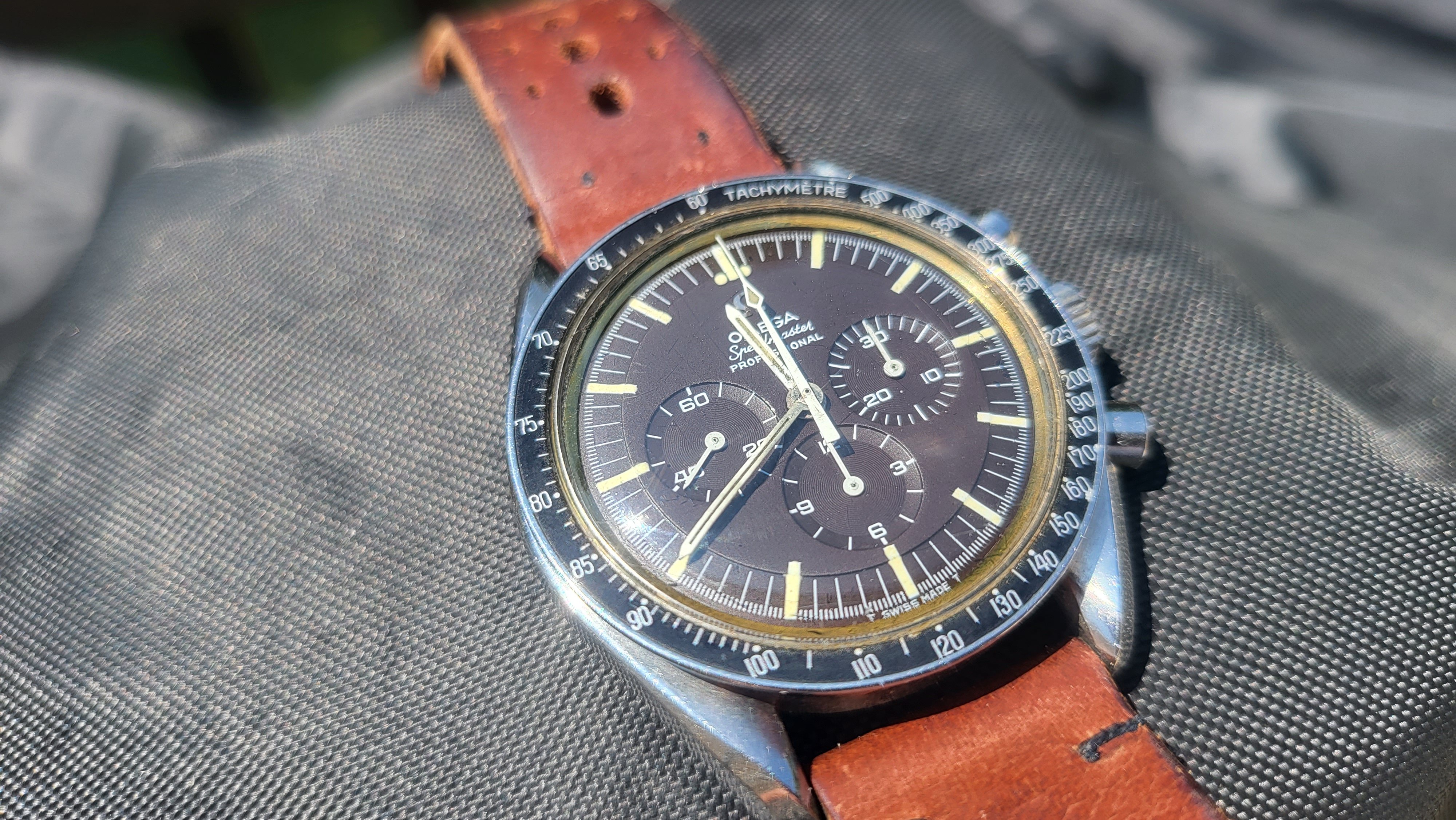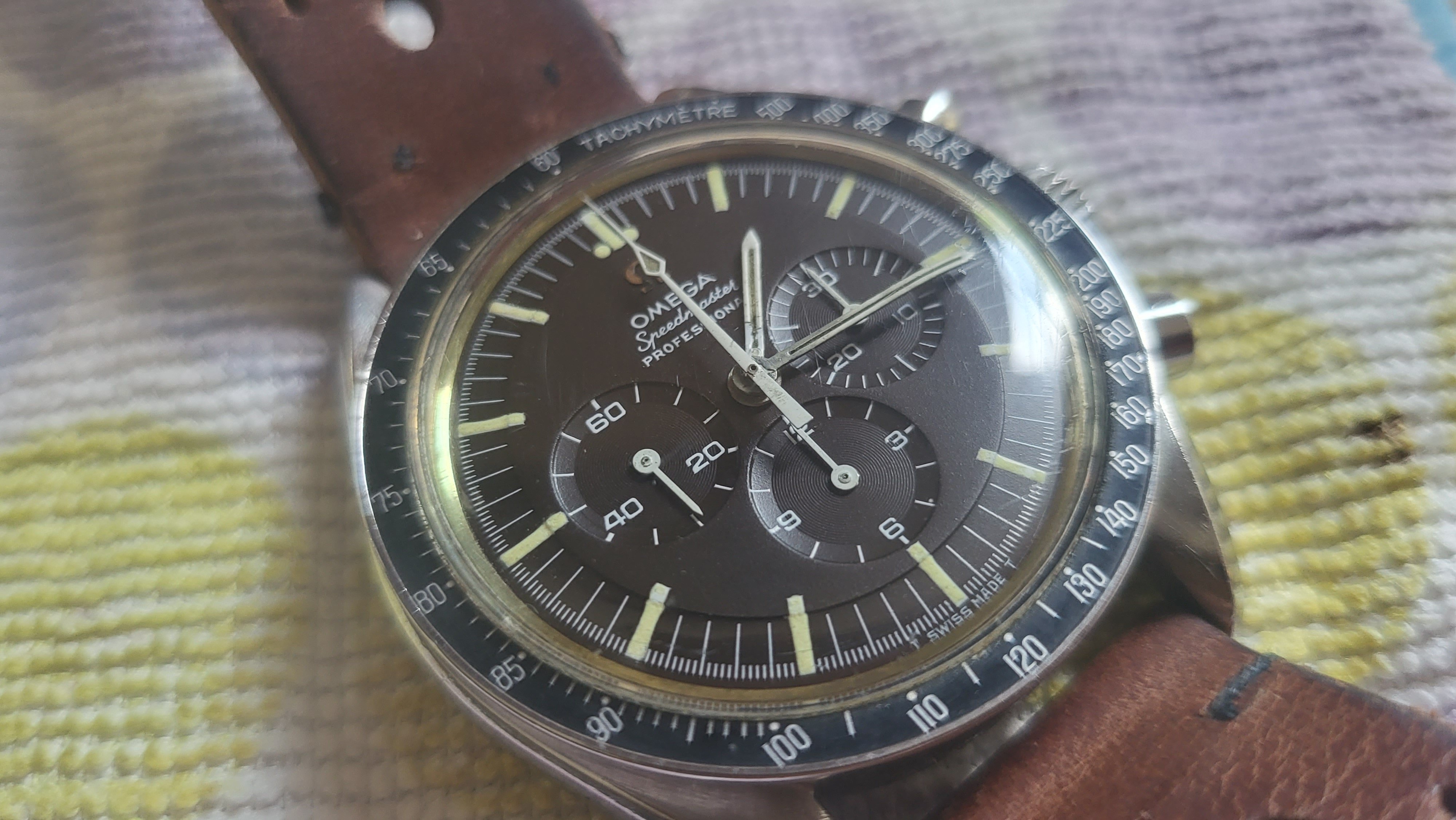 2. Is the crystal original: Marked in the center with a flat feet Omega logo? Yes. Patina'd too. Hard to see but on top of the hour hand in dial closeup pic. Also shows well the even choco tropcality of the dial. I do need to poly watch the crystal as I see a couple of fine scratches on the macro.
