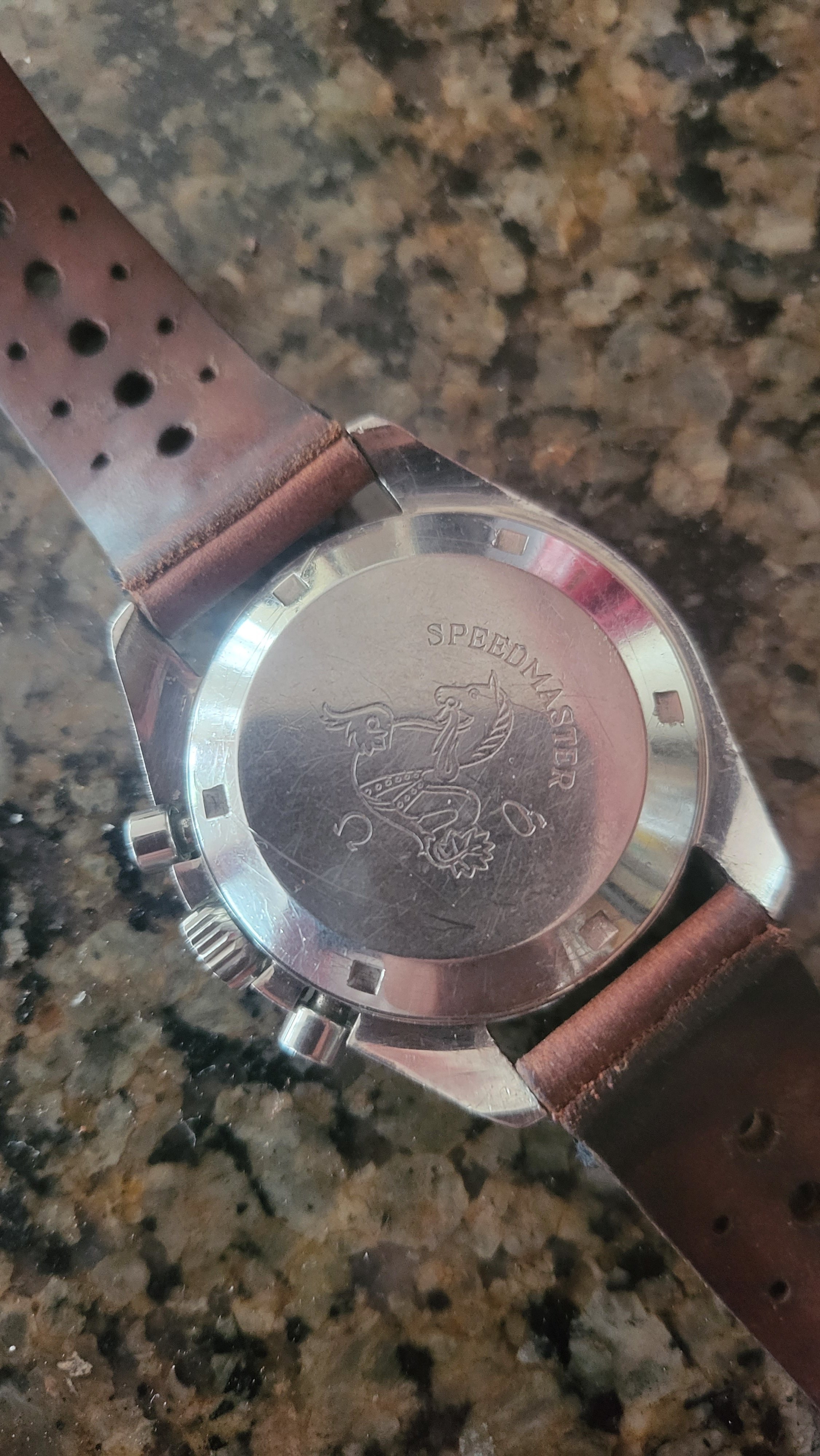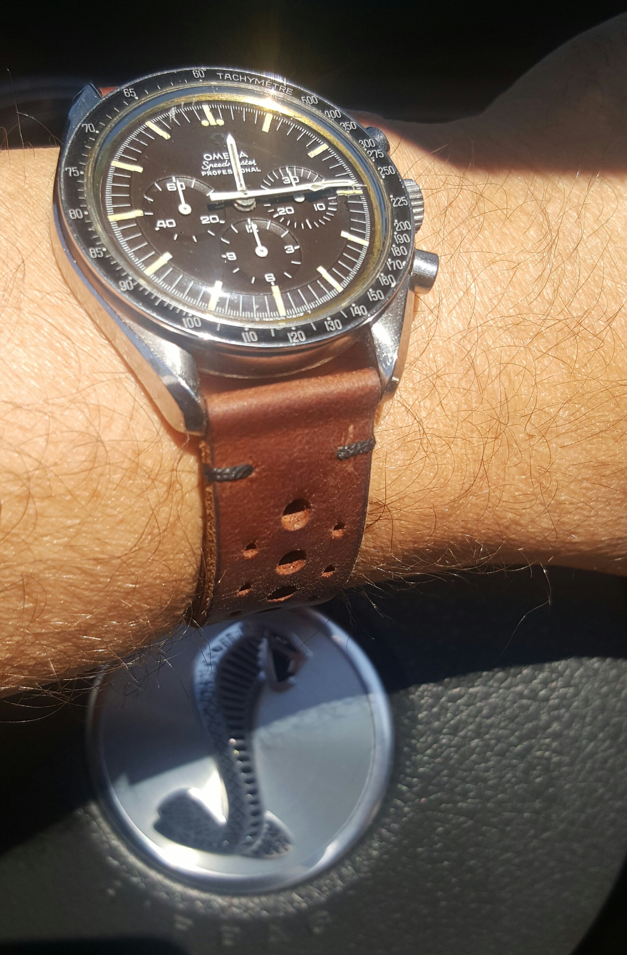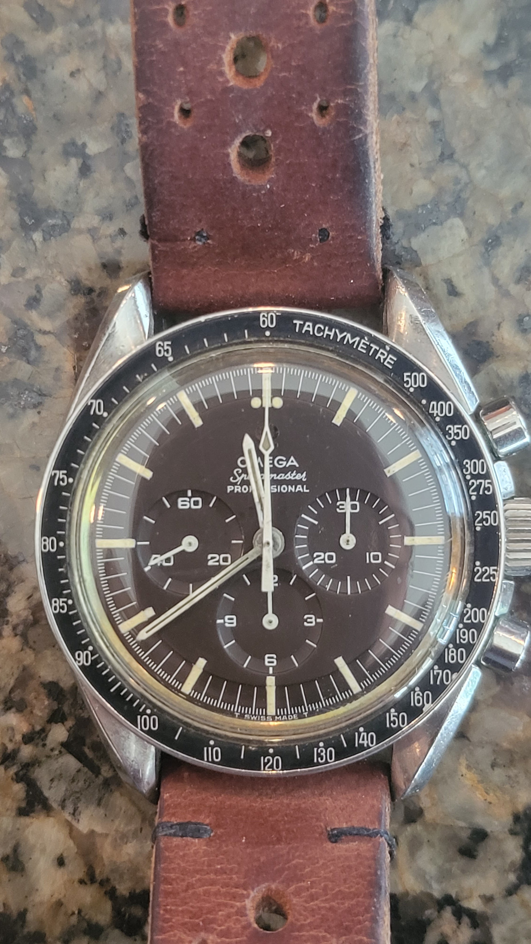 2. Is the crystal original: Marked in the center with a flat feet Omega logo? Yes. Patina'd too. Hard to see but on top of the hour hand in dial closeup pic. Also shows well the even choco tropcality of the dial. I do need to poly watch the crystal as I see a couple of fine scratches on the macro.