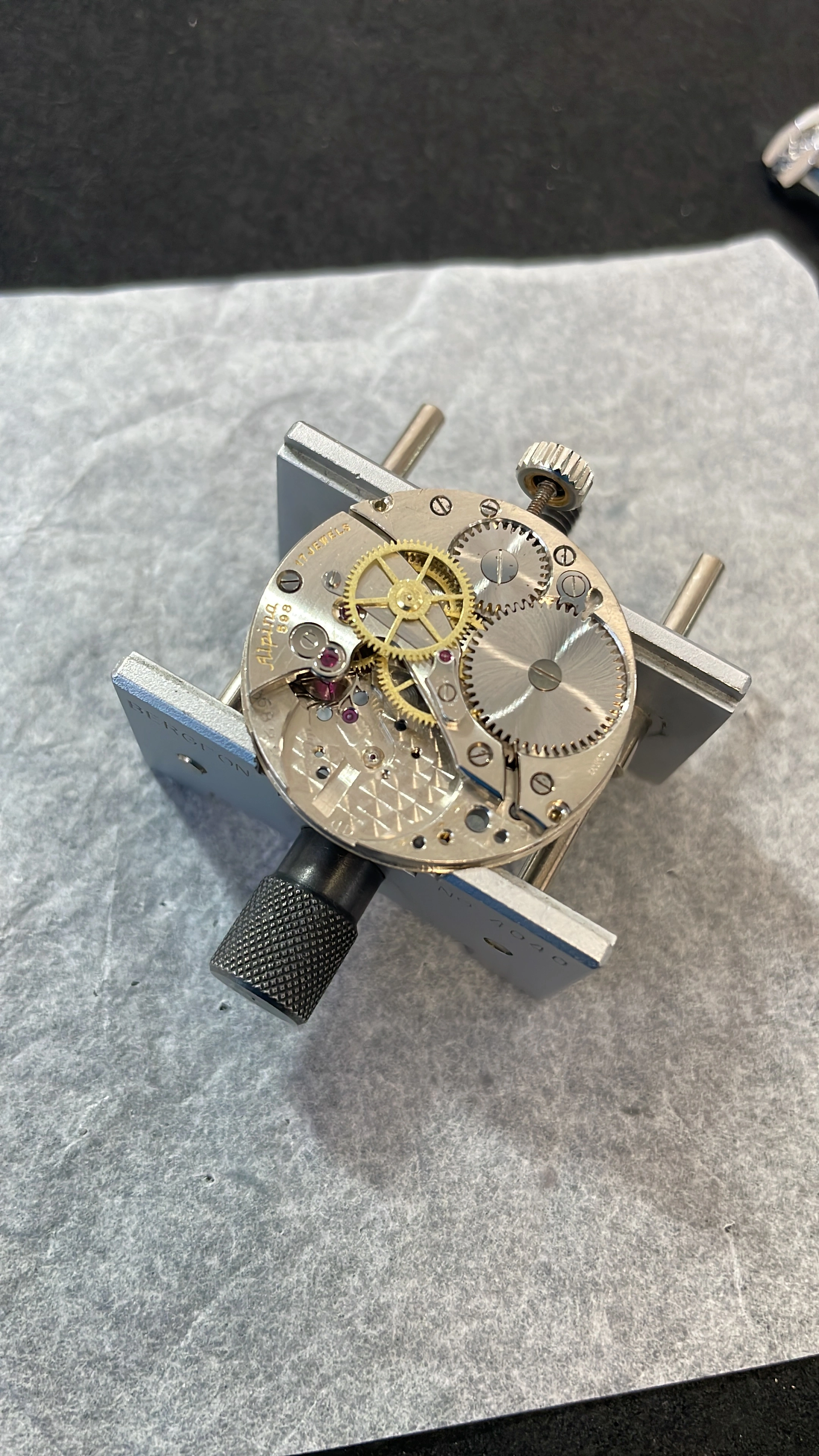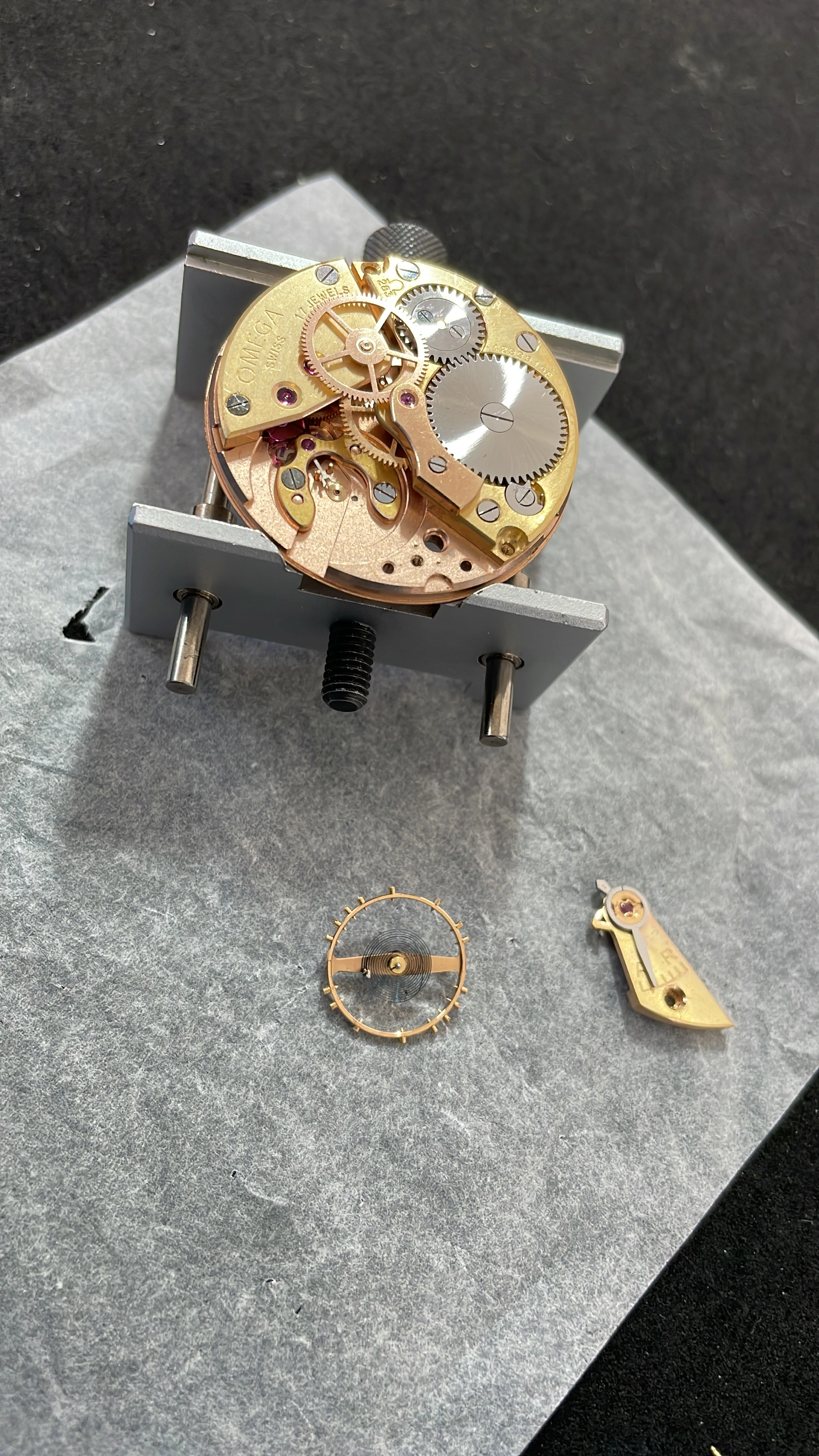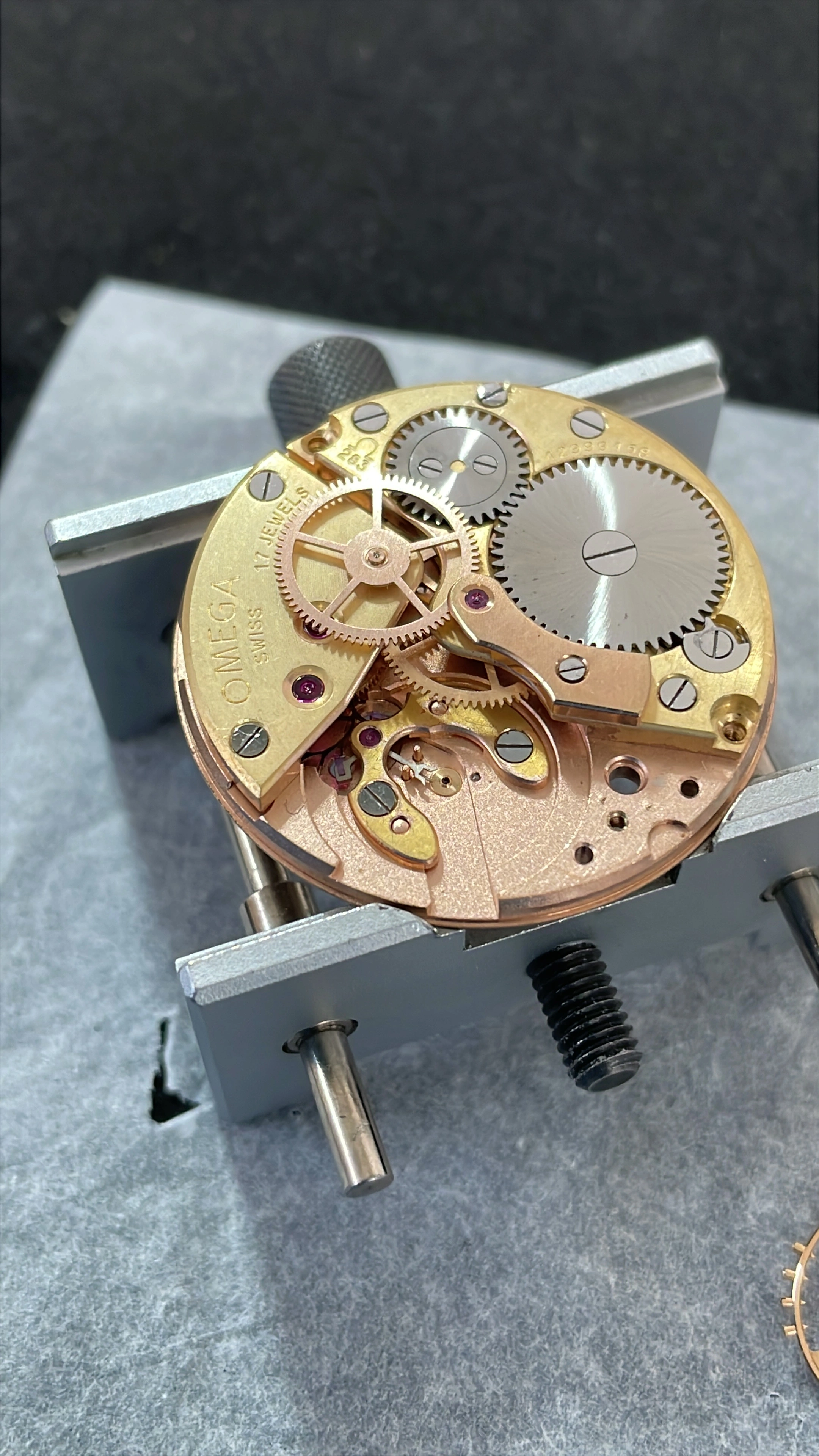 -Cleaned, jewels pegged, jewel chatons polished, through the cleaning and drying process. Ready for assembly.