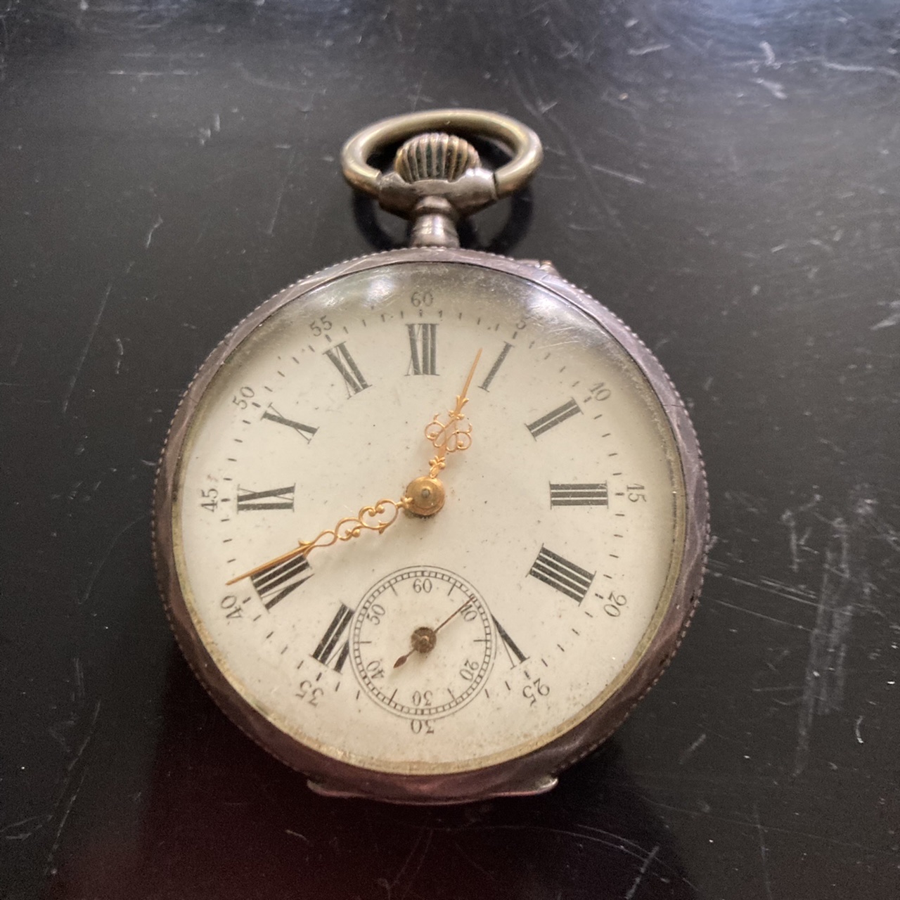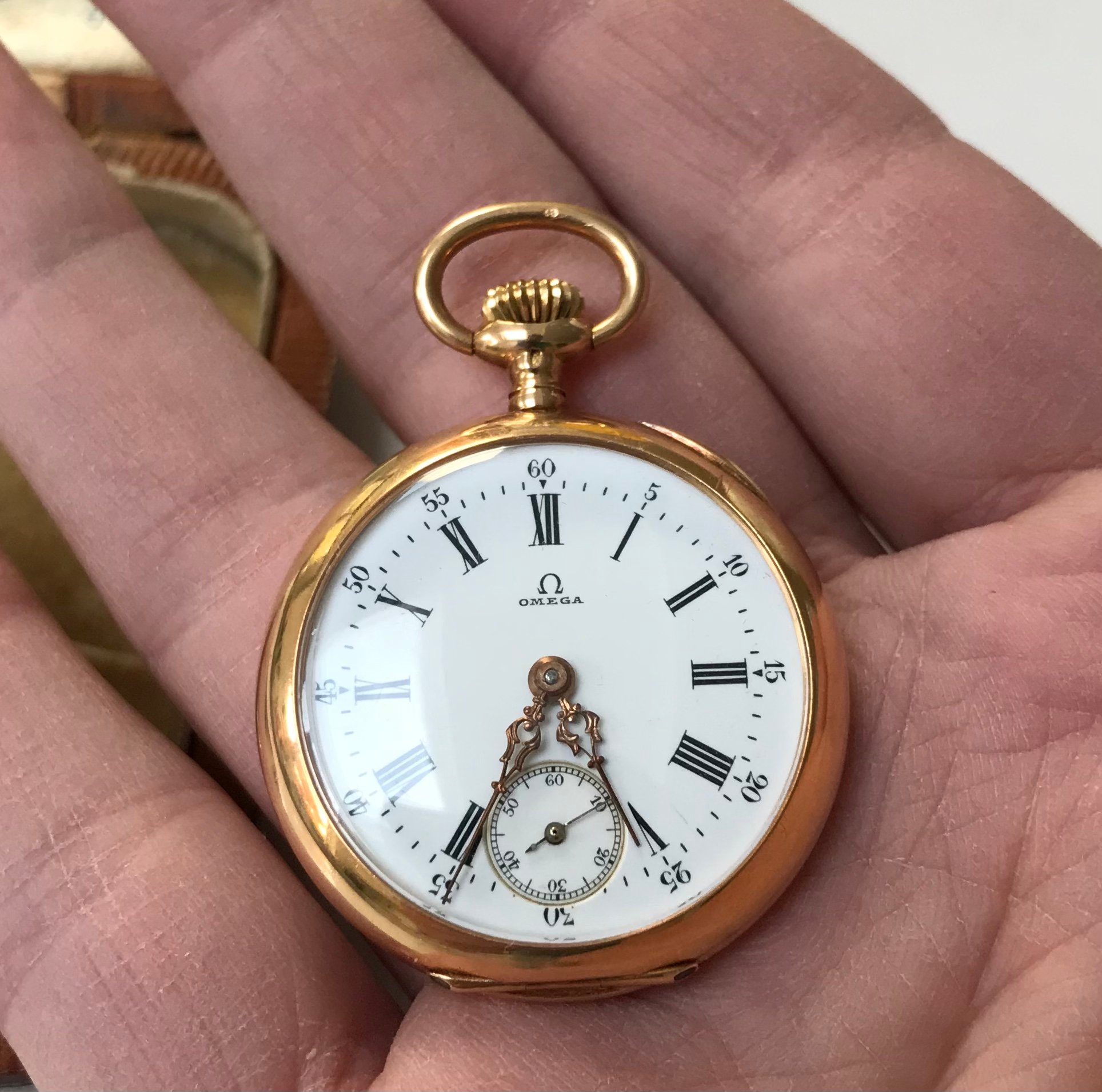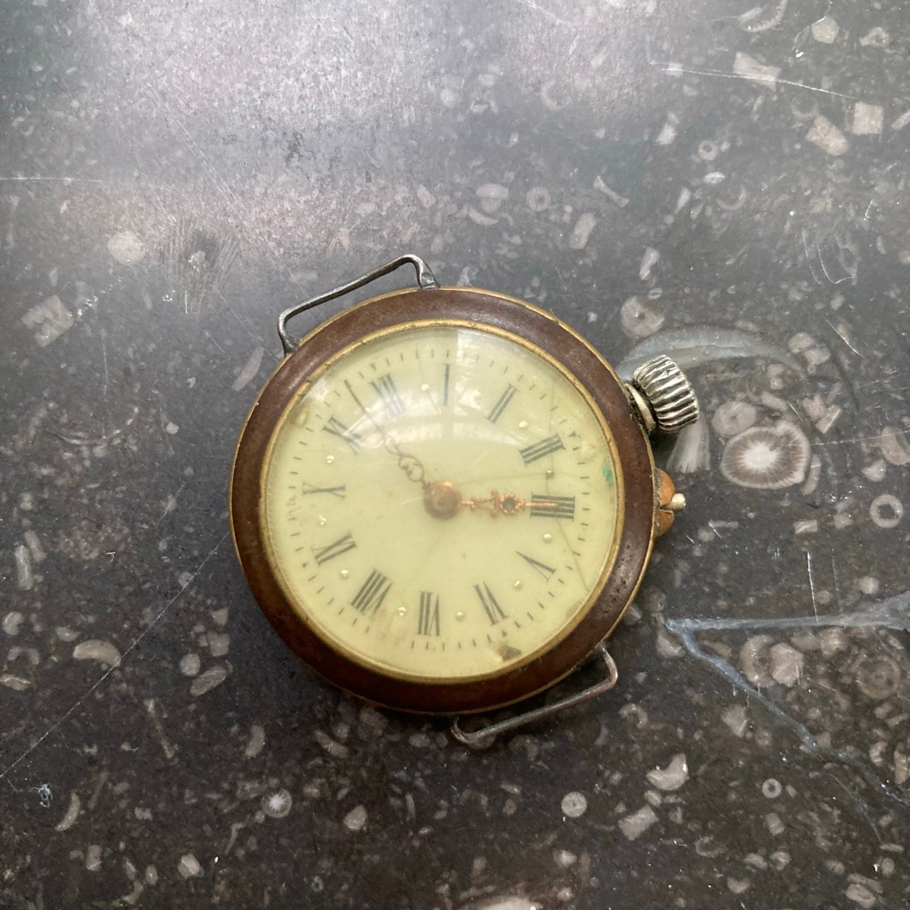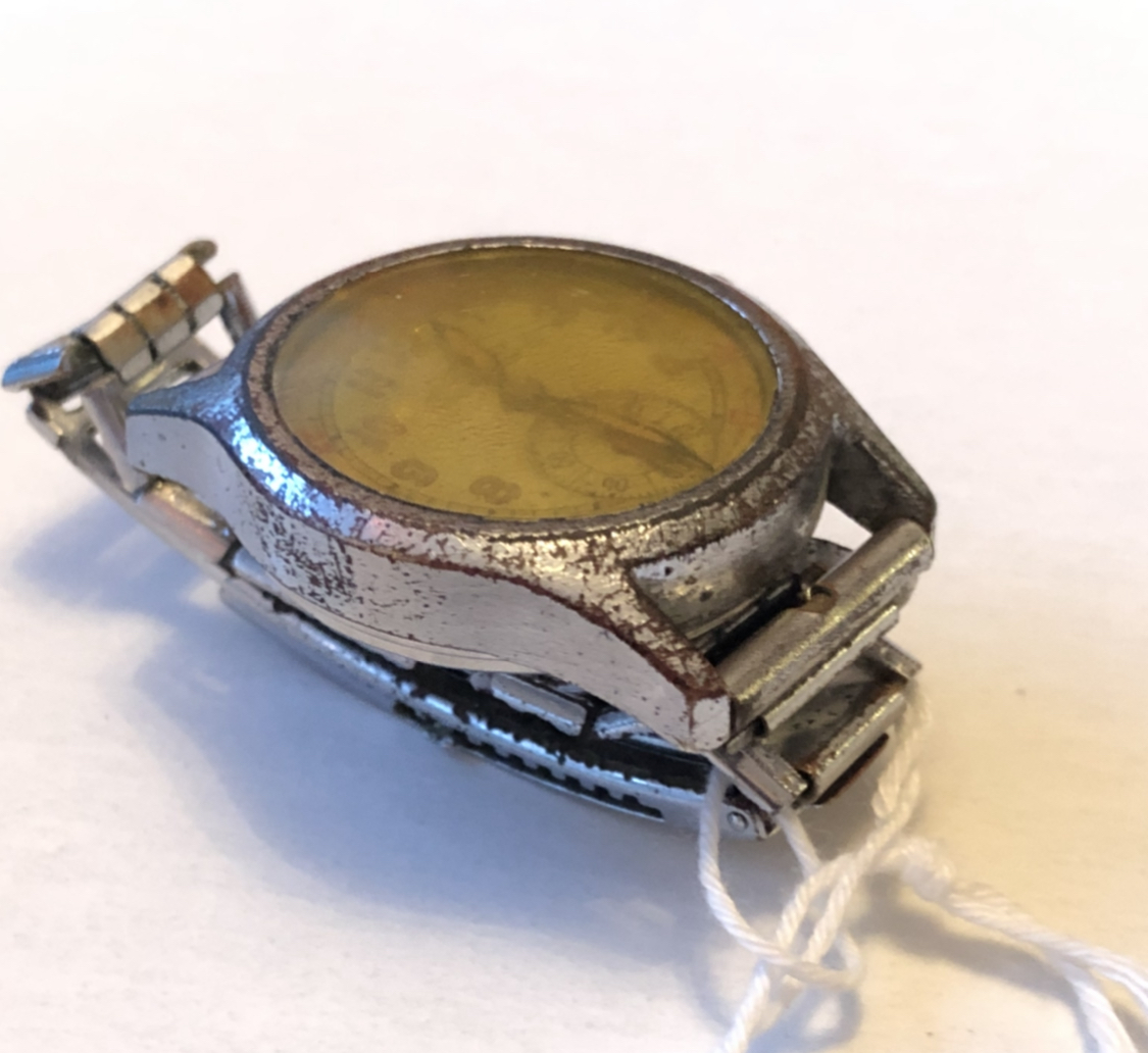 This 1906 Dueber Hampden, which started out its life as a pocket watch but was re-cased as a wristwatch probably in the early 1920s. Mail-order conversion kits for transforming pocket watches to wristwatches, such as the kit used to transform this piece, were popular in the 1920s. The movement is "The Four Hundred", which is a "lever-set" movement -- i.e., the time is set by first pulling out a small lever then rotating the crown, rather than pulling out the crown and rotating it as with modern movements. The lever can be seen at the 5:00 position.