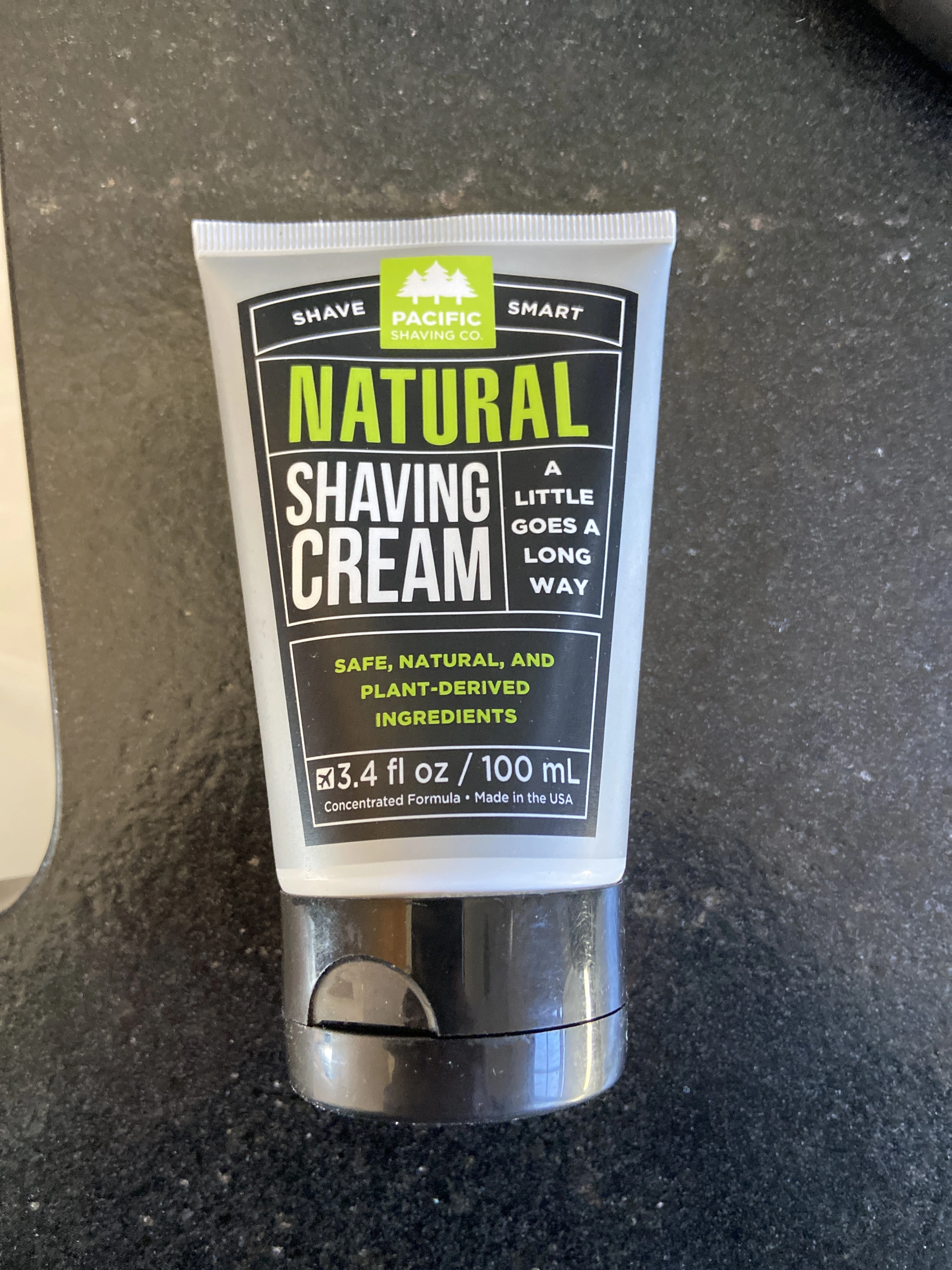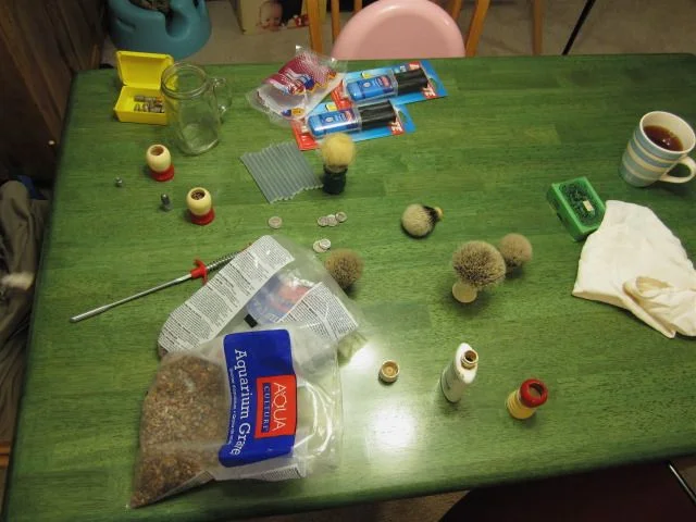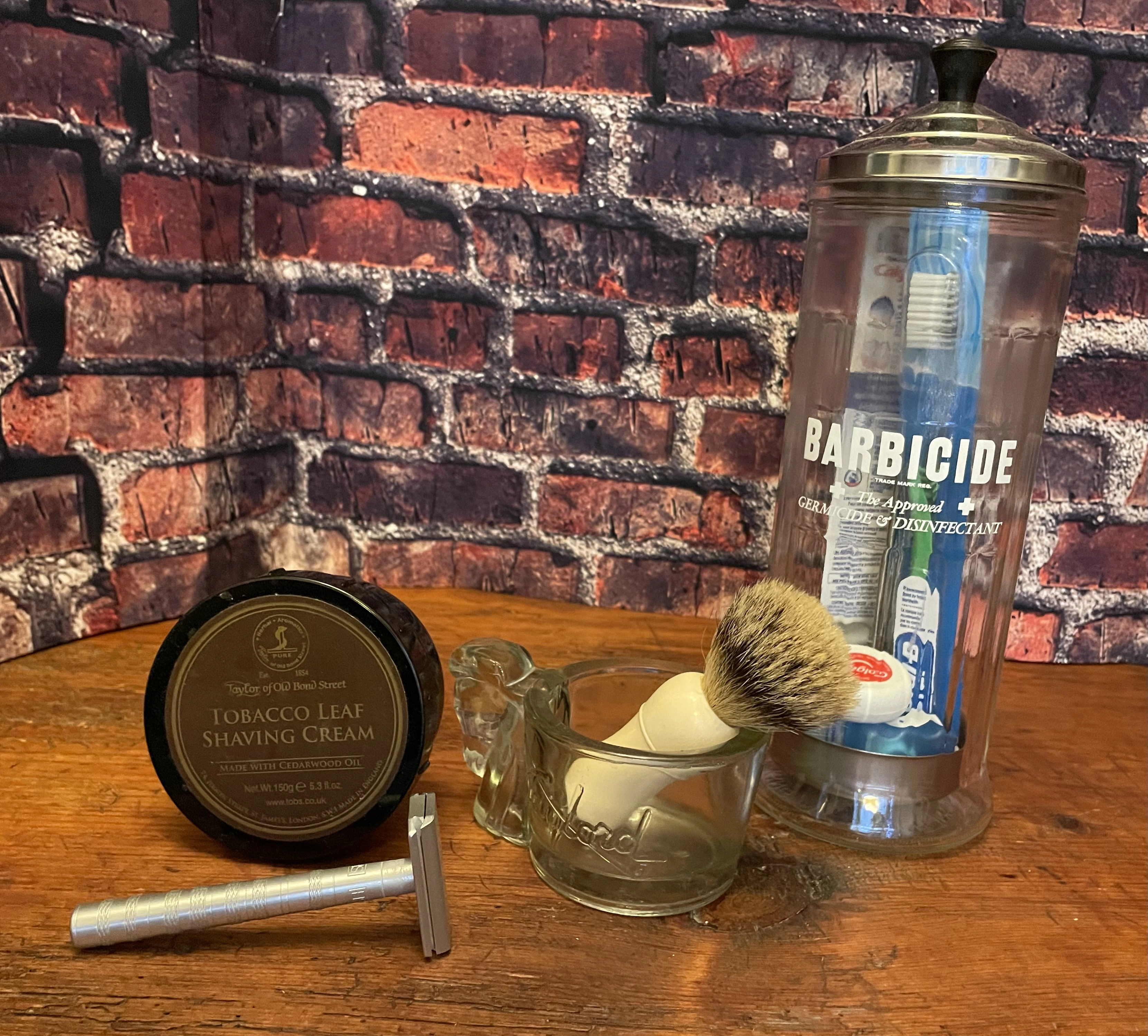 I’m using a Henson razor, Taylor of OBS shave cream, my late father-in-law’s shaving cup and a badger brush that I picked up in - still in its box - from a vintage shop. An old barbicide jar lives with all this and holds spare toothbrushes and floss