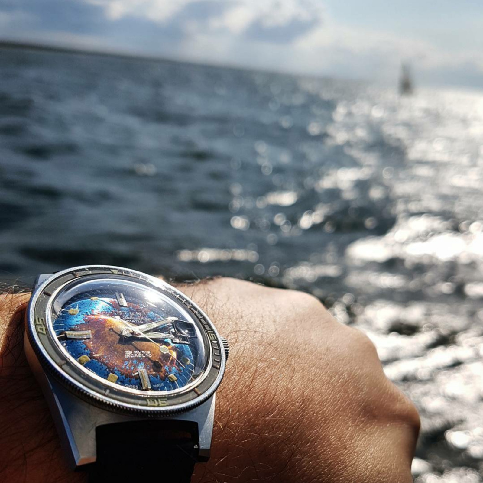 Patina happens over the lifetime of the watch and differs according the atmospheric conditions it is subjected to. Damage is the result of consistent misuse or an unfortunate incident.