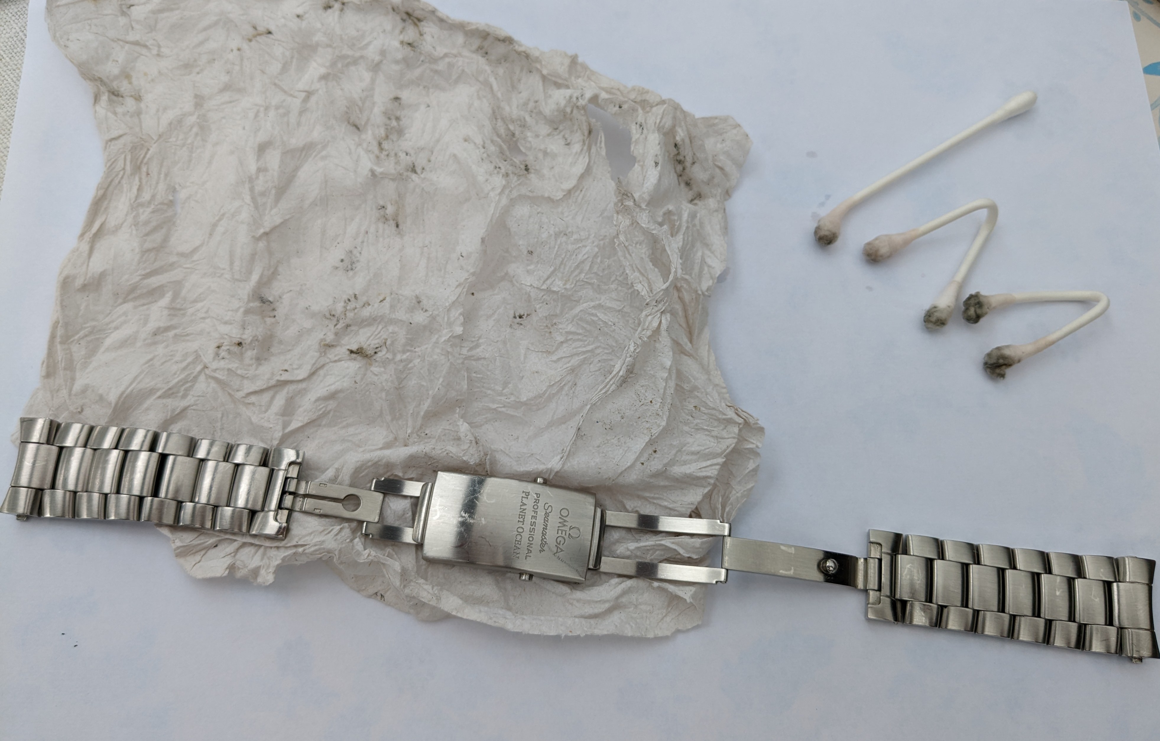 I usually just drop the bracelet in a fish if warm water with dawn and let it soak for a while- then have at it with a toothbrush under the faucet -don’t drop the endlinks down the garbage disposal 😲