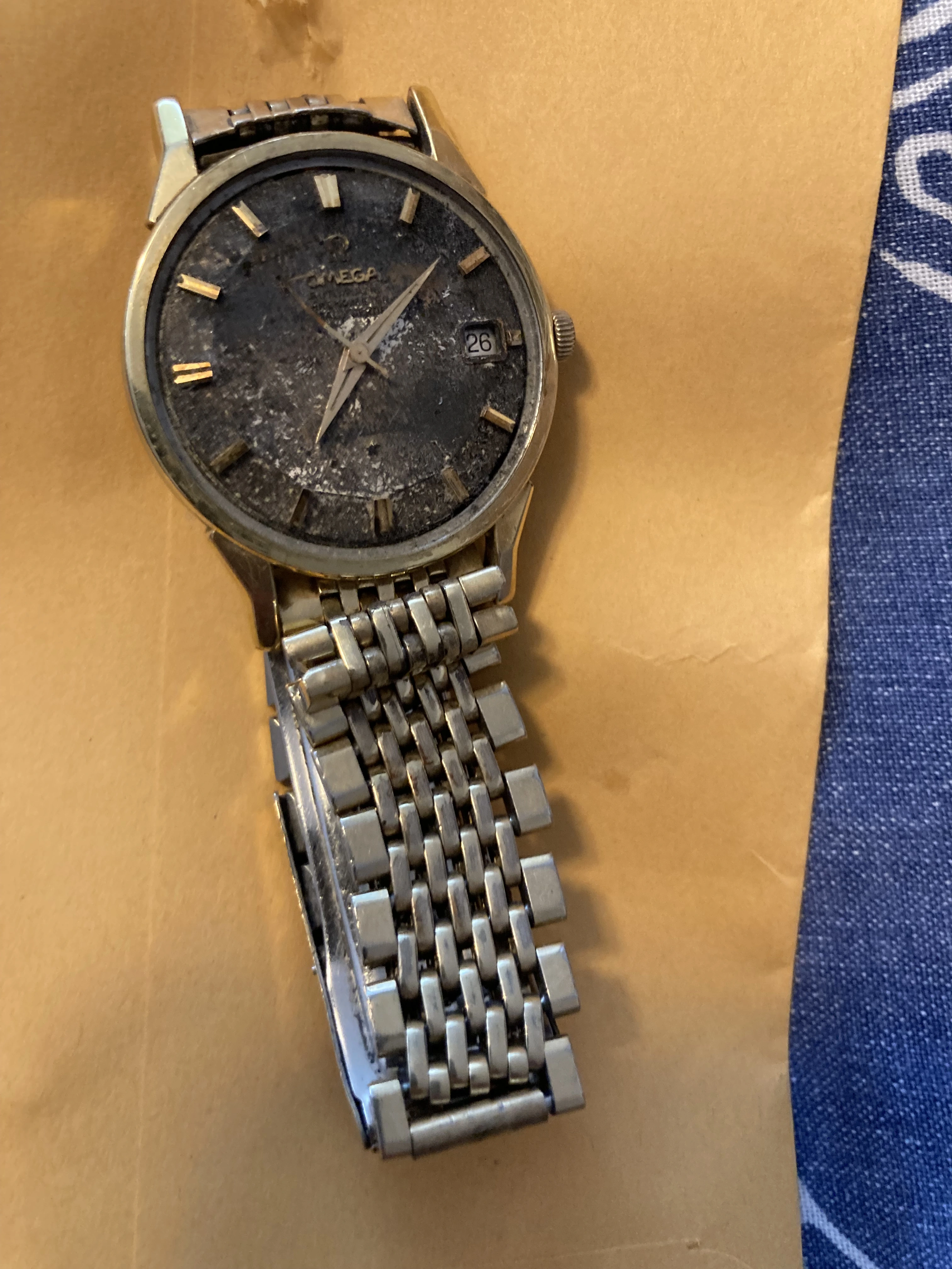 The question is what it would cost to fix and whether the investment would be worth it. I'm open to thinking from people who know about Omega watches. At the very least, this watch is 35 years old, but I'm betting my dad got it from my uncle who died in 1977, so at least 50 years old.