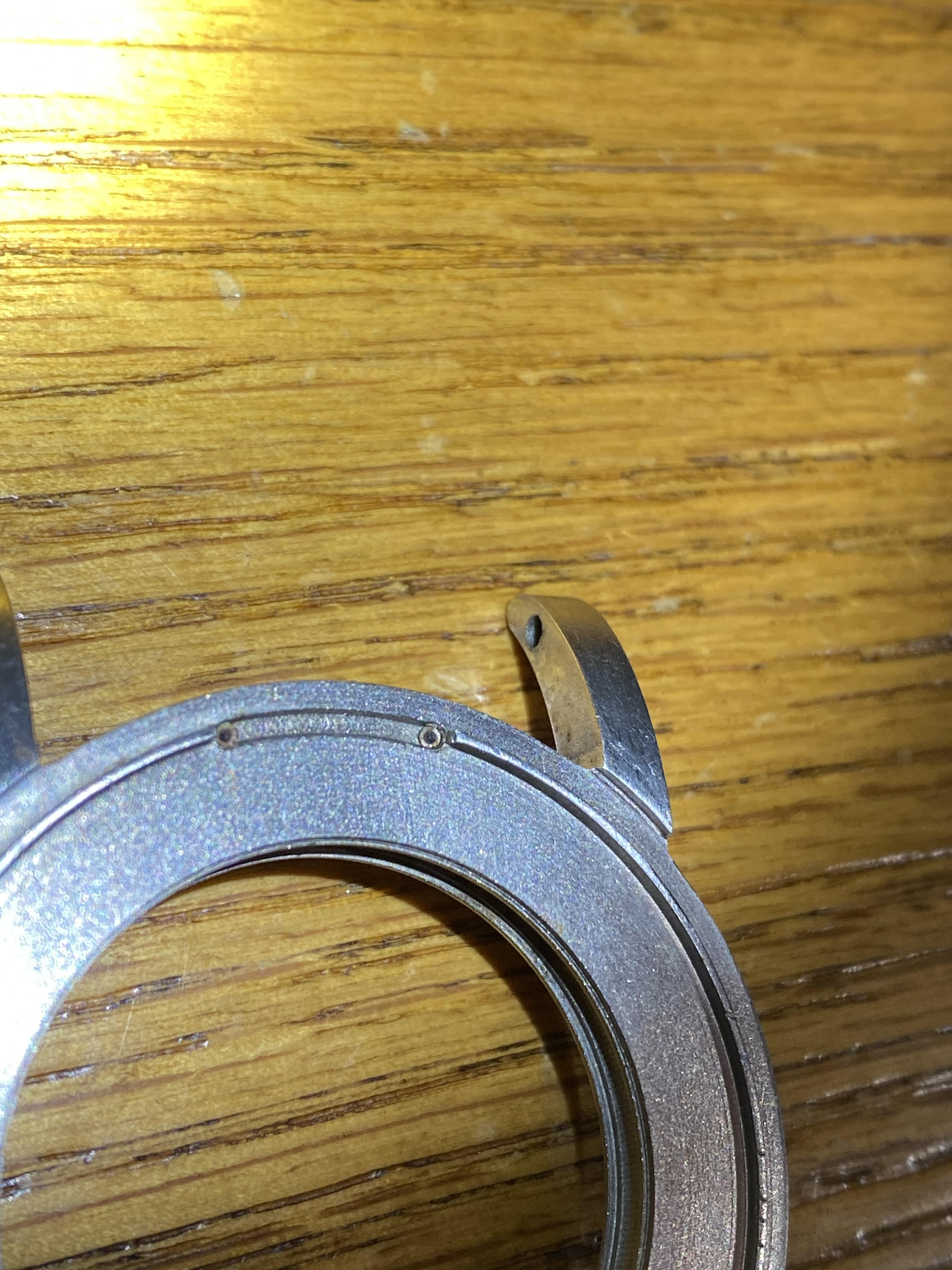 Anyway I don't know much about the watch other than it was brought to the US from France after WWII. I can tell obviously the minute hand and crown is unoriginal but I am not sure about the rest. The watch does not work and upon further investigation the hairspring is broken. Balance assembly and jewels all look good under magnifying glass and it spins freely. A little wind on the watch and the pallet fork is properly ticking back and forth (with a little persuasion since the balance is inoperable) The watch is incredibly dirty and FULL of old brown oil (it looks like rust but it is just dirt). When I removed the balance I saw it is movement number 26.5 but there is a B stamped above and I don't know what that means. Also on the front of the case there are two pins at the 6 o'clock mark and I don't know what they are for. Any suggestions with what to do with this watch would be great. I can see the case was originally brushed on the lugs and sides with the bezel and back appearing to be polished. Unsure as I don't have a true original to compare it to.