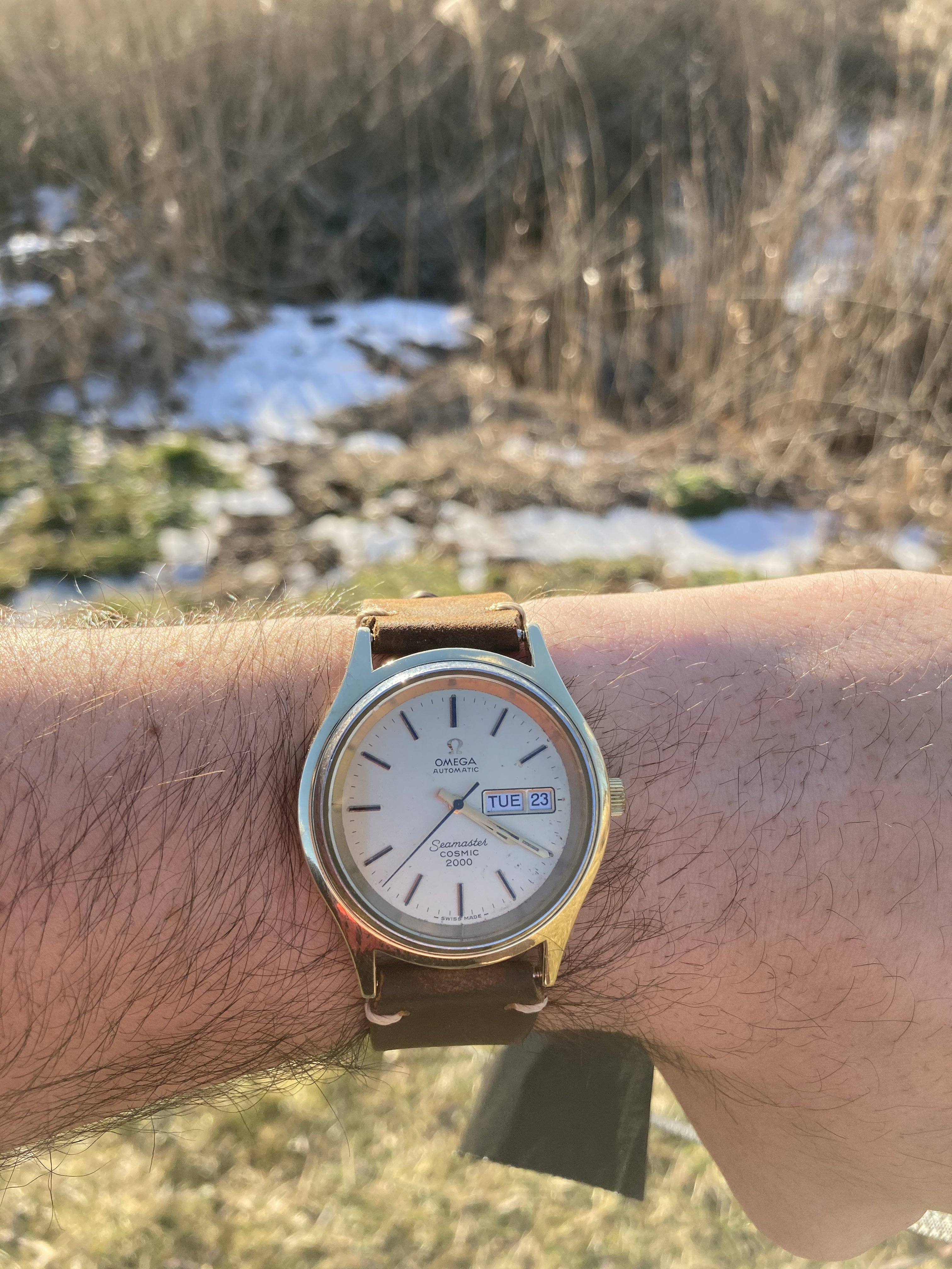 ·I am new to collecting watches. One year in the books and have focused mostly on affordable value for money i.e. seiko, orient, etc. I purchased my first vintage Omega on eBay and took a shot in the dark. Won an auction for this seamaster cosmic 2000 for a couple hundred bucks. It keeps time , day and date work fine, and I am enjoying it, with all its obvious flaws. Right off the bat I was skeptical because the case back looked polished to the point where seamaster is barely visible and crown has either been replaced, or ground down to the point where it no longer looks in place. I have done a little research and know that the cosmic cases are difficult to work with, as the movement is only accessible when the case back is popped from air pressure or some other type of special tool. The gaskets look to be shot as the two portions of the case are no longer snug and wiggle when manipulated. So I doubt the pressure technique would work when disassembling. My question would be, is it a legit omega, and if so, what would be the first step in restoring? I’d like to get new gaskets, hire an expert to check and service the movement, and locate a suitable crown but just wanted some opinions on how to go about tackling my first vintage project. I realize it’s hard to tell without seeing what’s under the hood, so for all I know it could be a Frankenstein movement that’s powering the thing. But time keeping seems smooth as well as the day and date changing so
