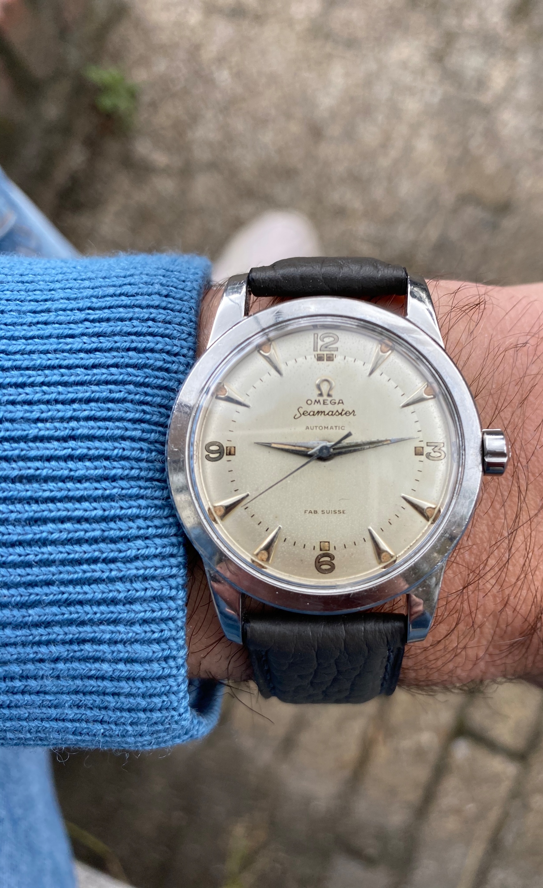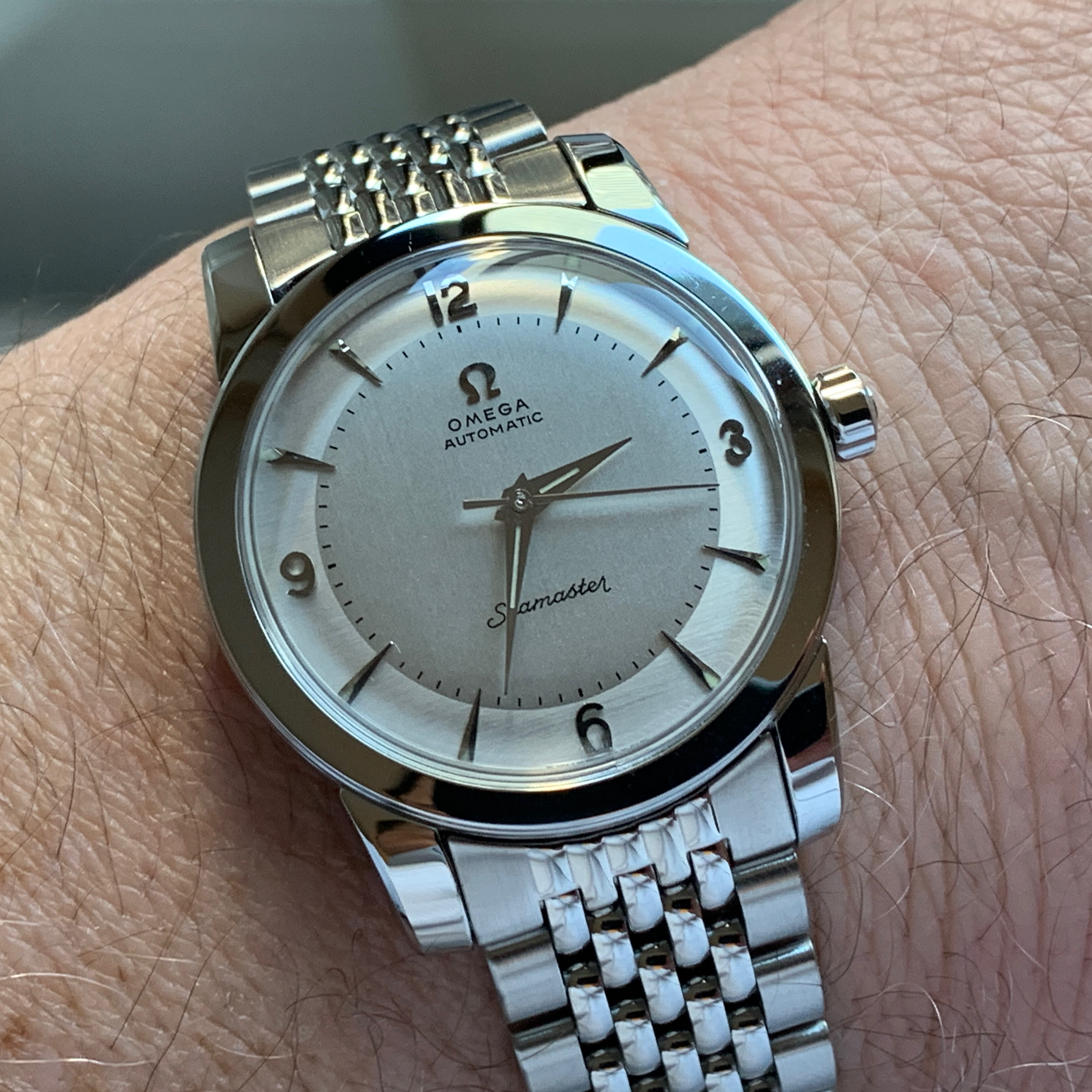 1955 Omega Seamster 2767 with a new Omega-sourced 3010/511 Beads of Rice bracelet. The 511 end links are serviceable but not a perfect fit.