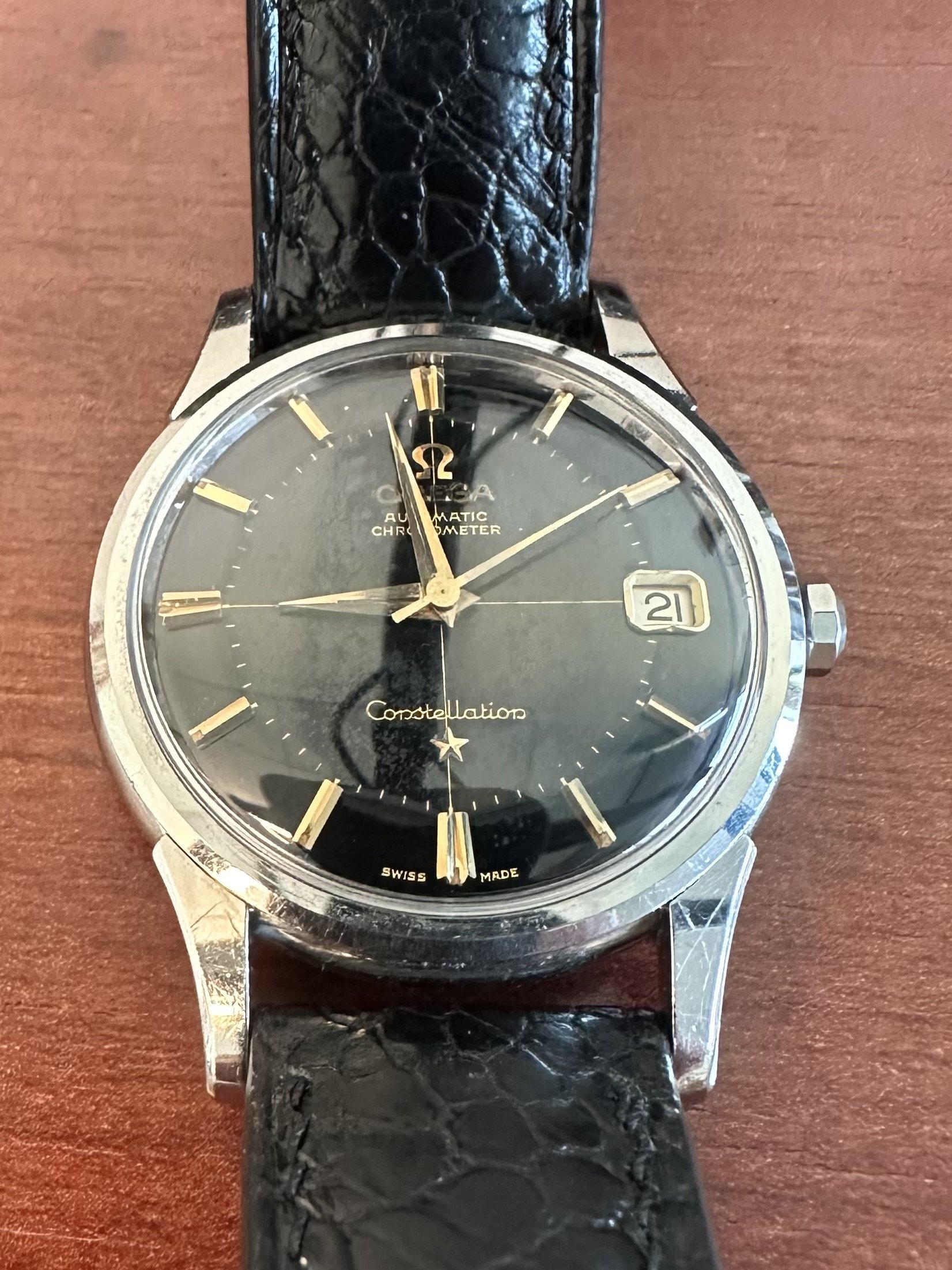 Watch 1: Black dialed Constellation 14381 with black strap, steel case and yellow gold hands and hour markers. Which buckle material for the best overall look?