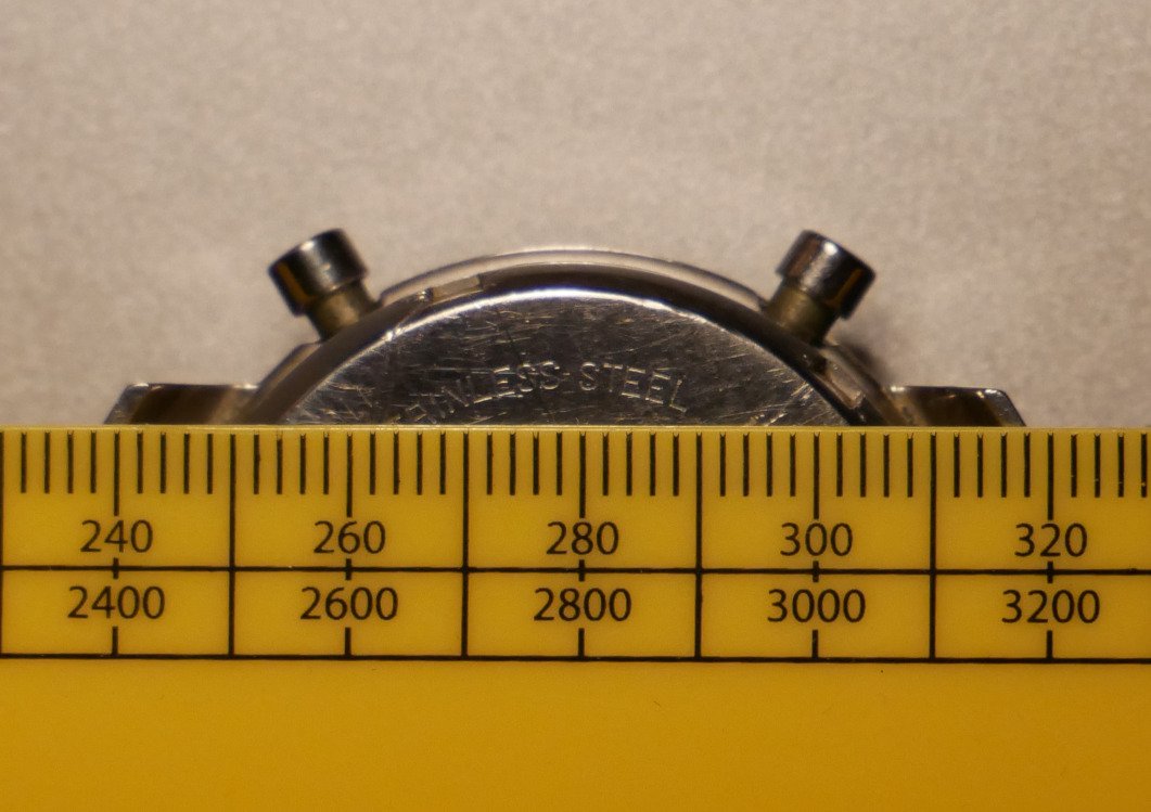 ·Yes, I have one and I think there are a handful more owners here. One thing to note about the lugs is that they have a distinct downward slope, possibly to disguise the thickness which is not as apparent in the larger diameter Heuer and Breitling "Chrono-matics". This means that the lugs are well out of the plane of the dial or back which may give odd effects in closeup photos. I've had a quick flick through photos of mine but cannot find decent pictures to illustrate. Perhaps tomorrow I'll dig it out and take photos with a long(-ish) focal length lens and put a straight-edge across the back.