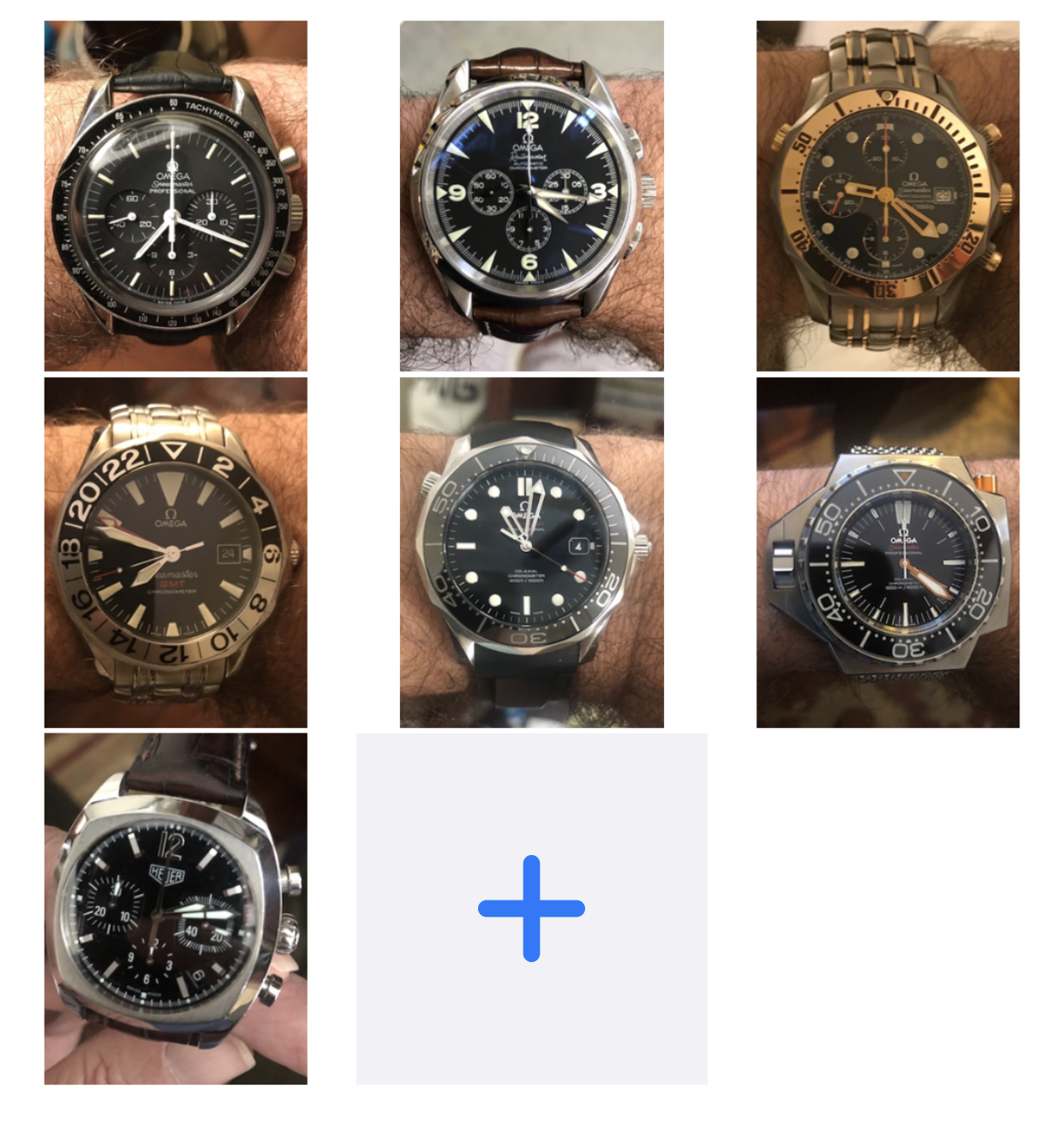The first six are Omegas. The last one is a Tag Heuer Monza Classics. I’m hunting for a Monaco Classics to round out the pair. I’m a fan of the Heuer racing watches. Only one Speedmaster, 3590.50. It will be the only Speedmaster I ever own, because, for me, it’s perfection. Each watch represents something different in era, design, or functionality.