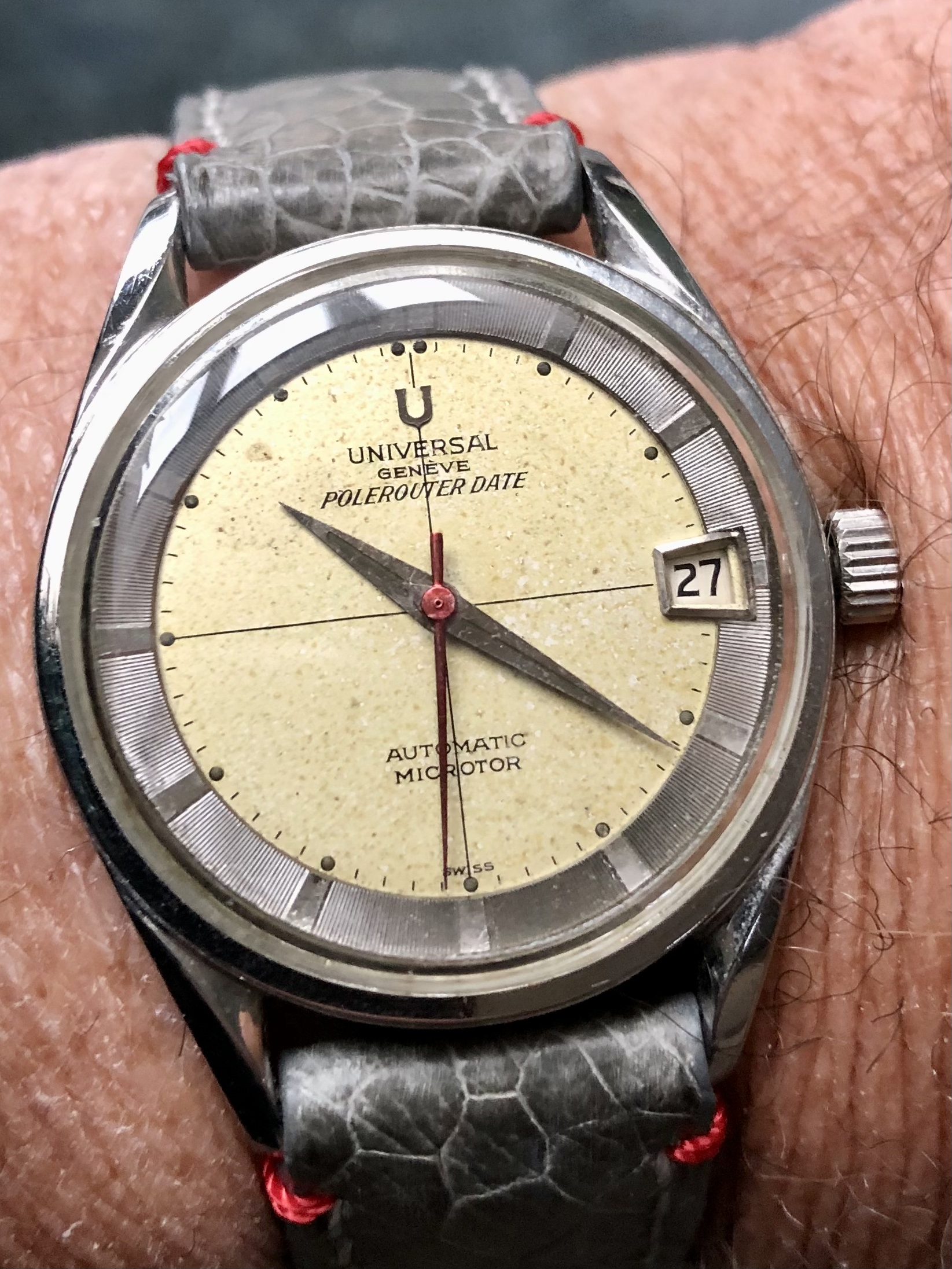 My other Polerouter Date. Service crown and crystal, funky red seconds hand. It all works with the nicely aged dial. On custom ostrich. (Combat straps - Montreal)